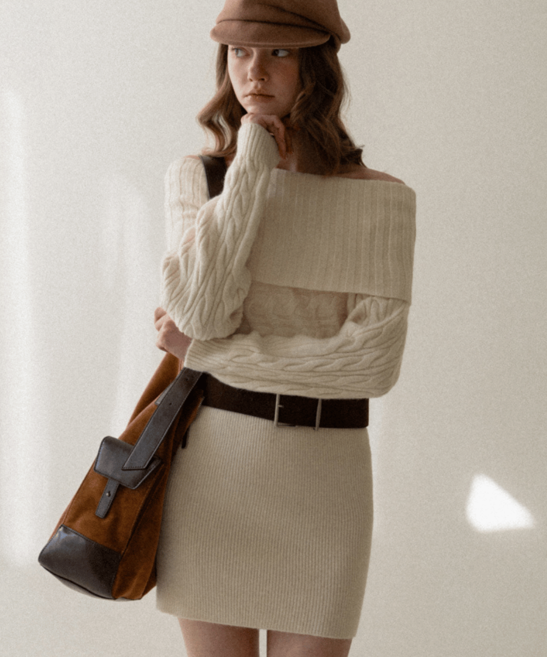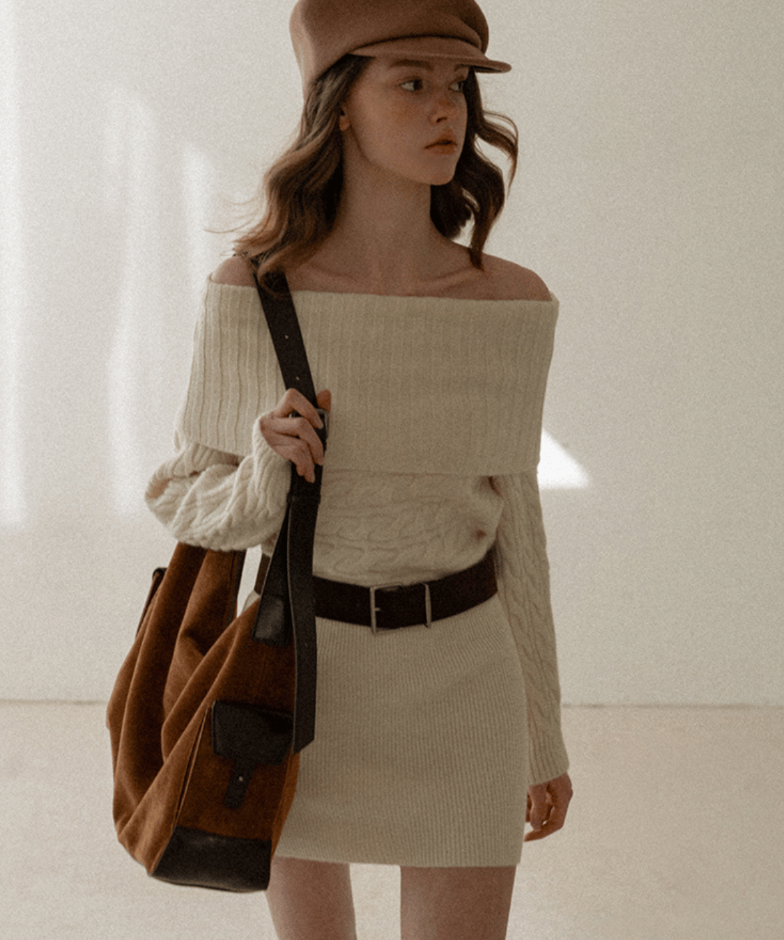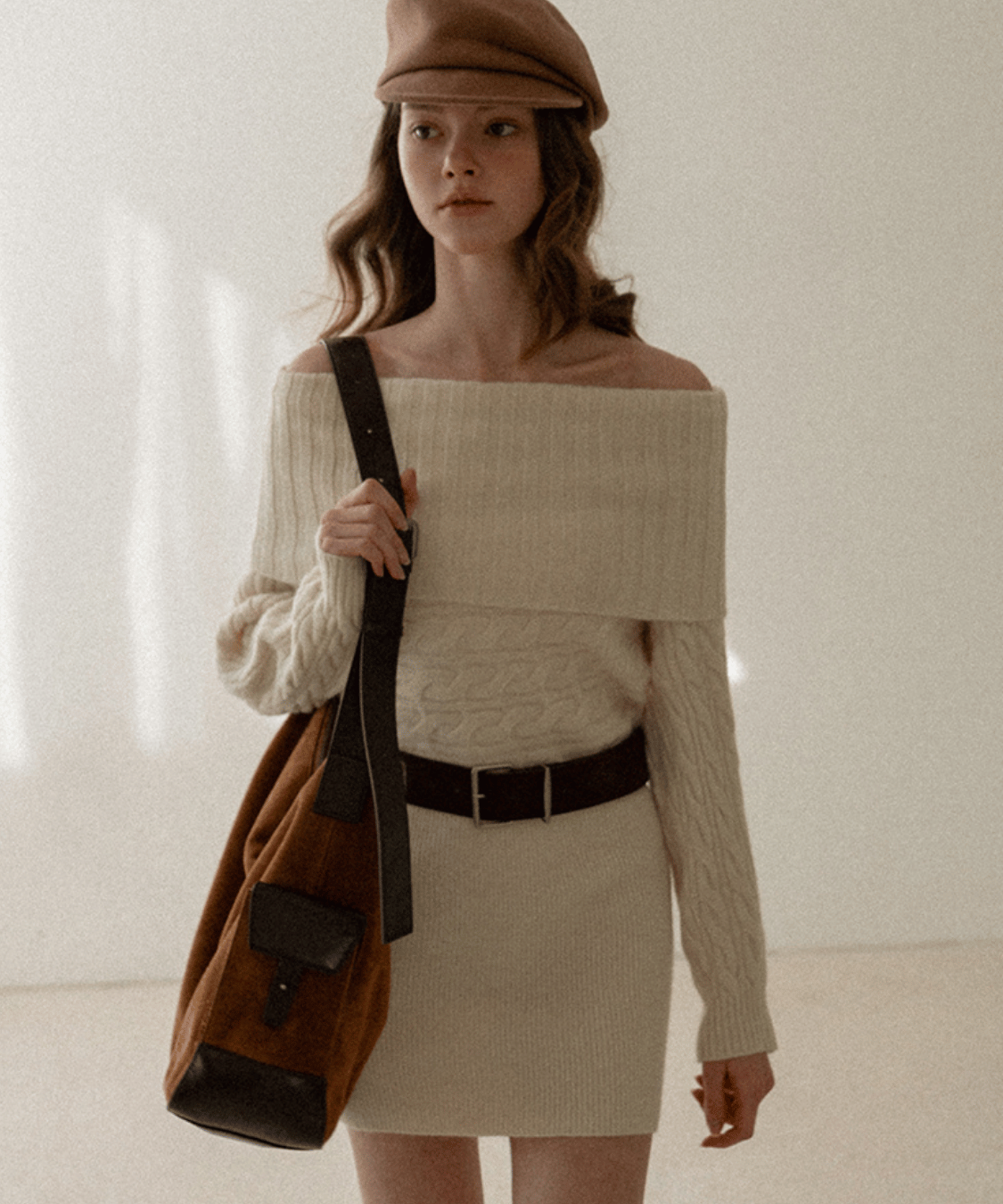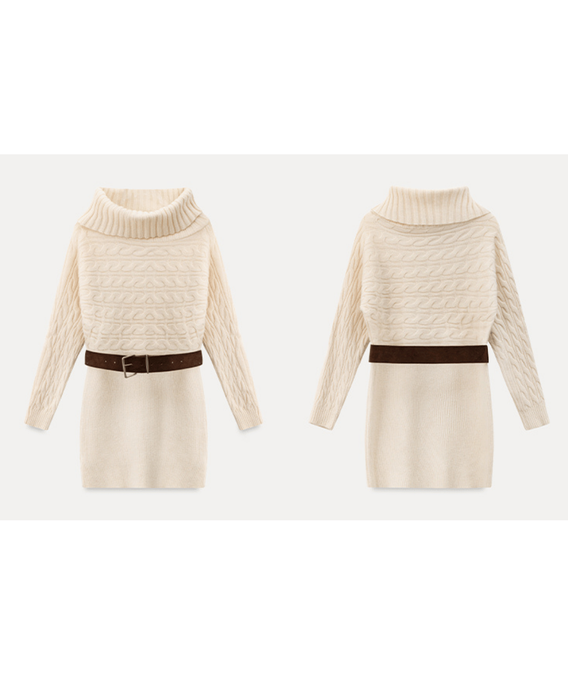 Off-the-shoulder cable knit belt dress