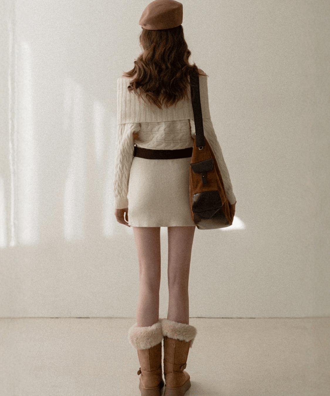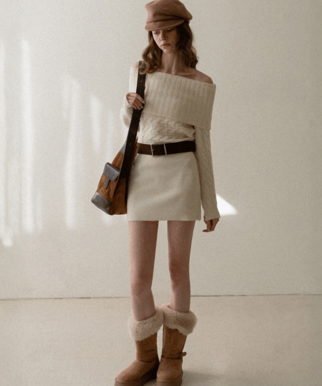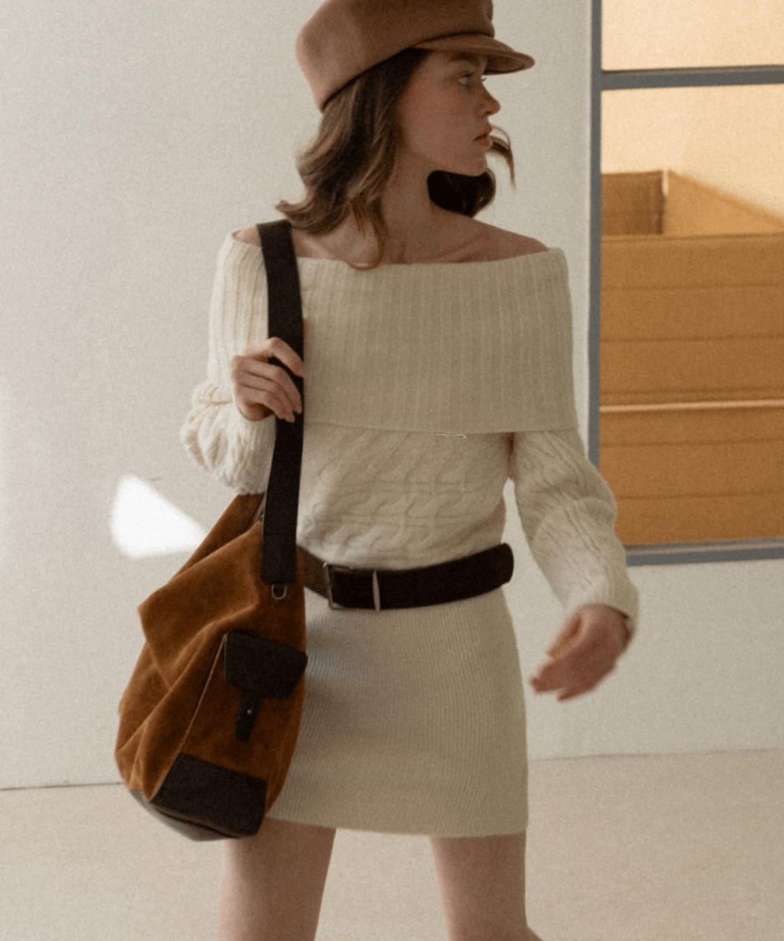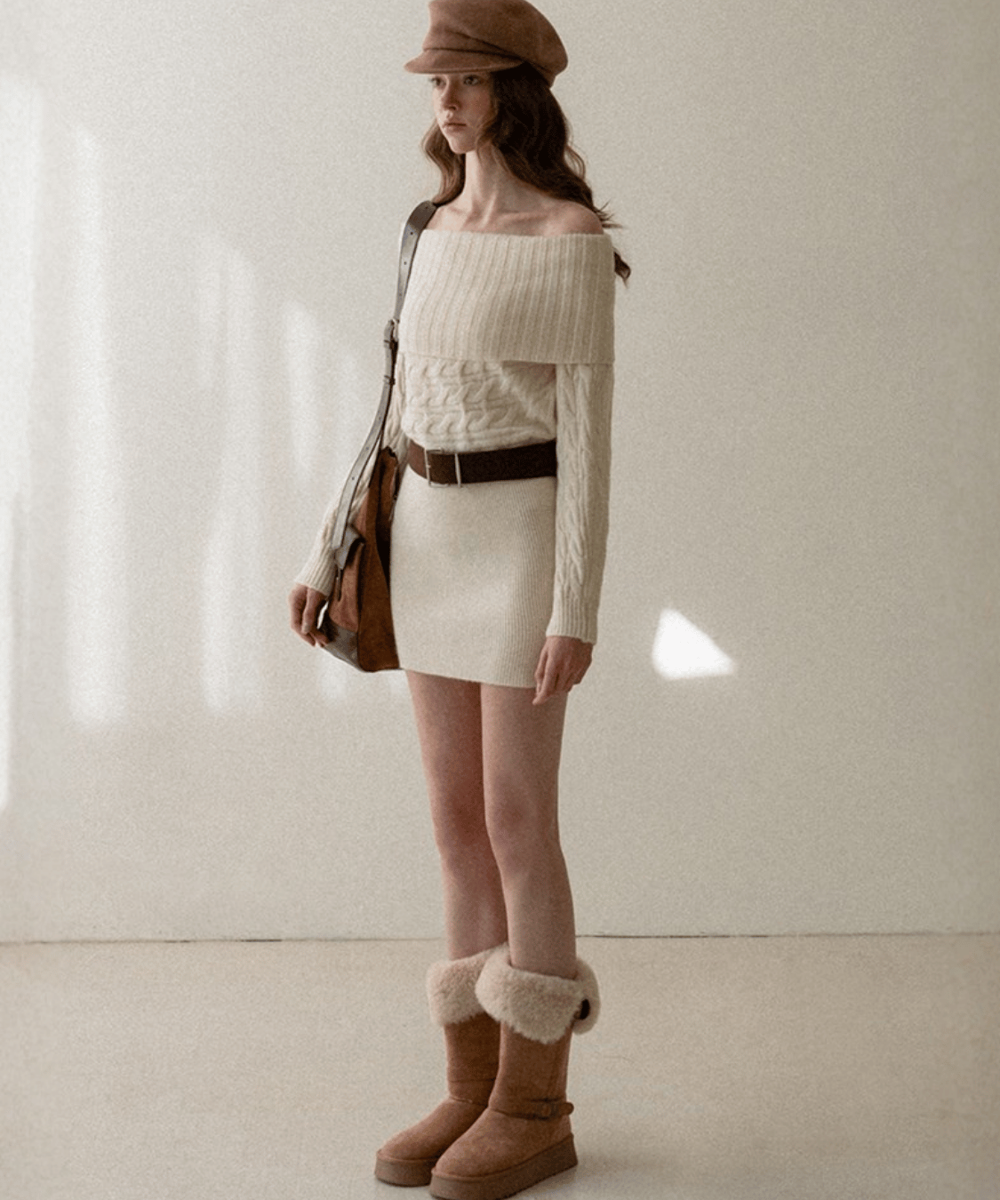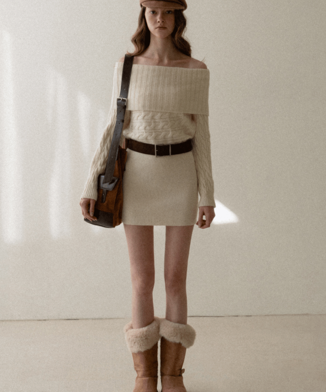 Off-the-shoulder cable knit belt dress
