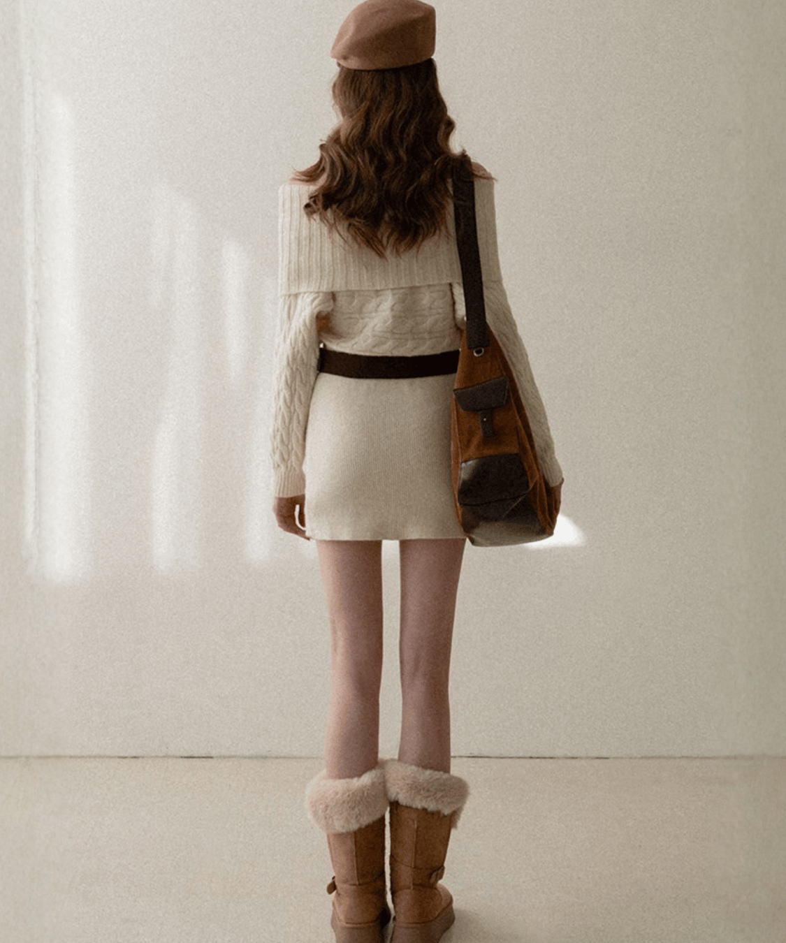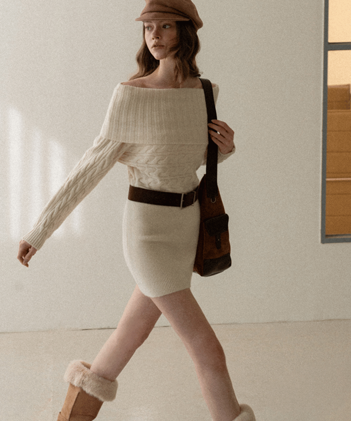 This knit dress features an off-the-shoulder design and cable knit that accentuates femininity.