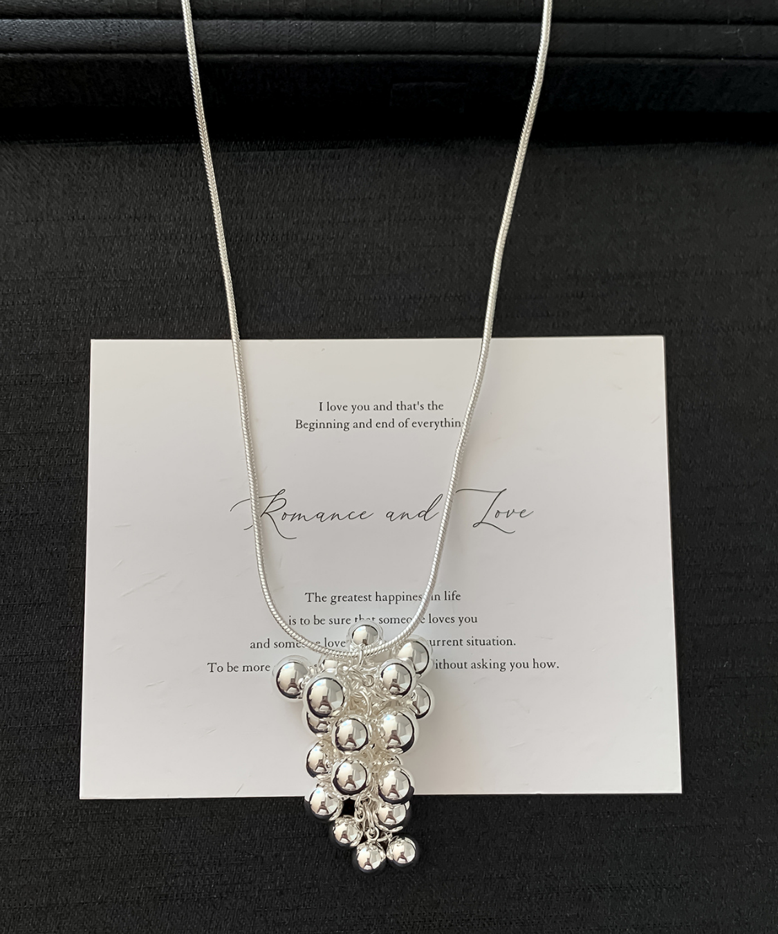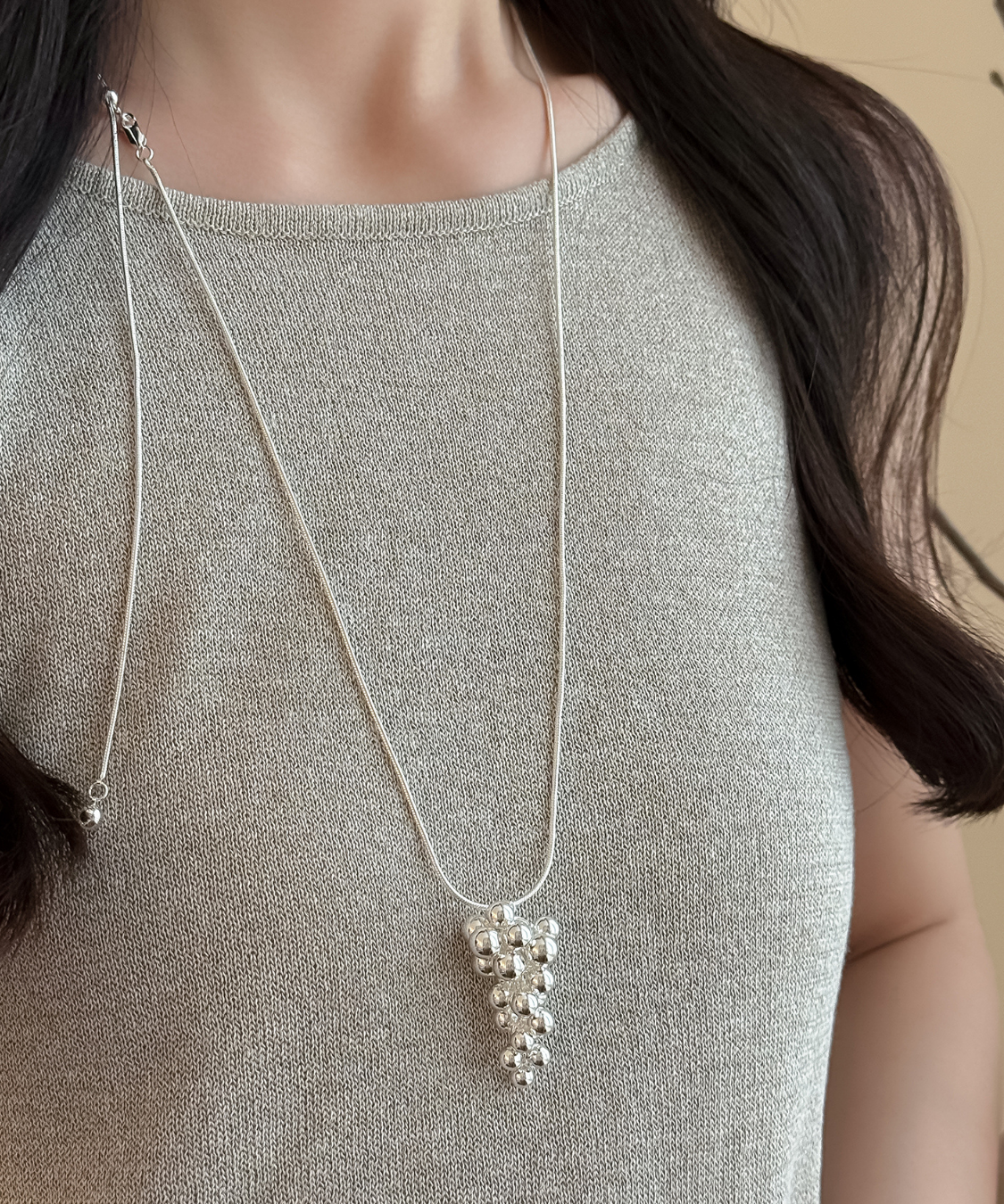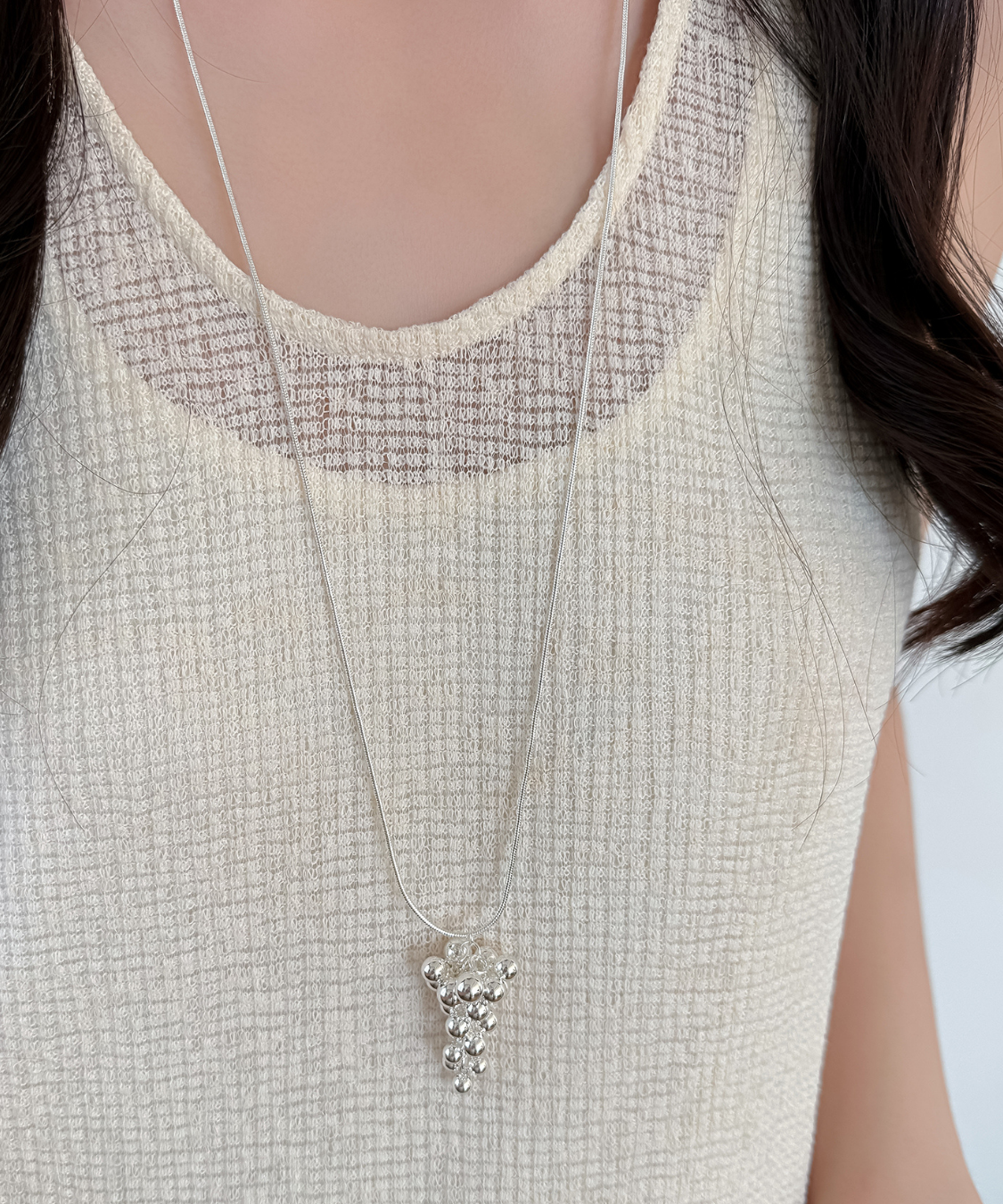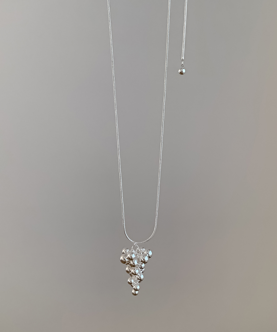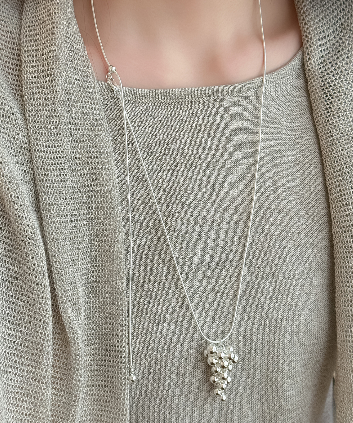 存在感のあるシルバーボールモチーフが、胸元に華やかさを添えるロングネックレスです。