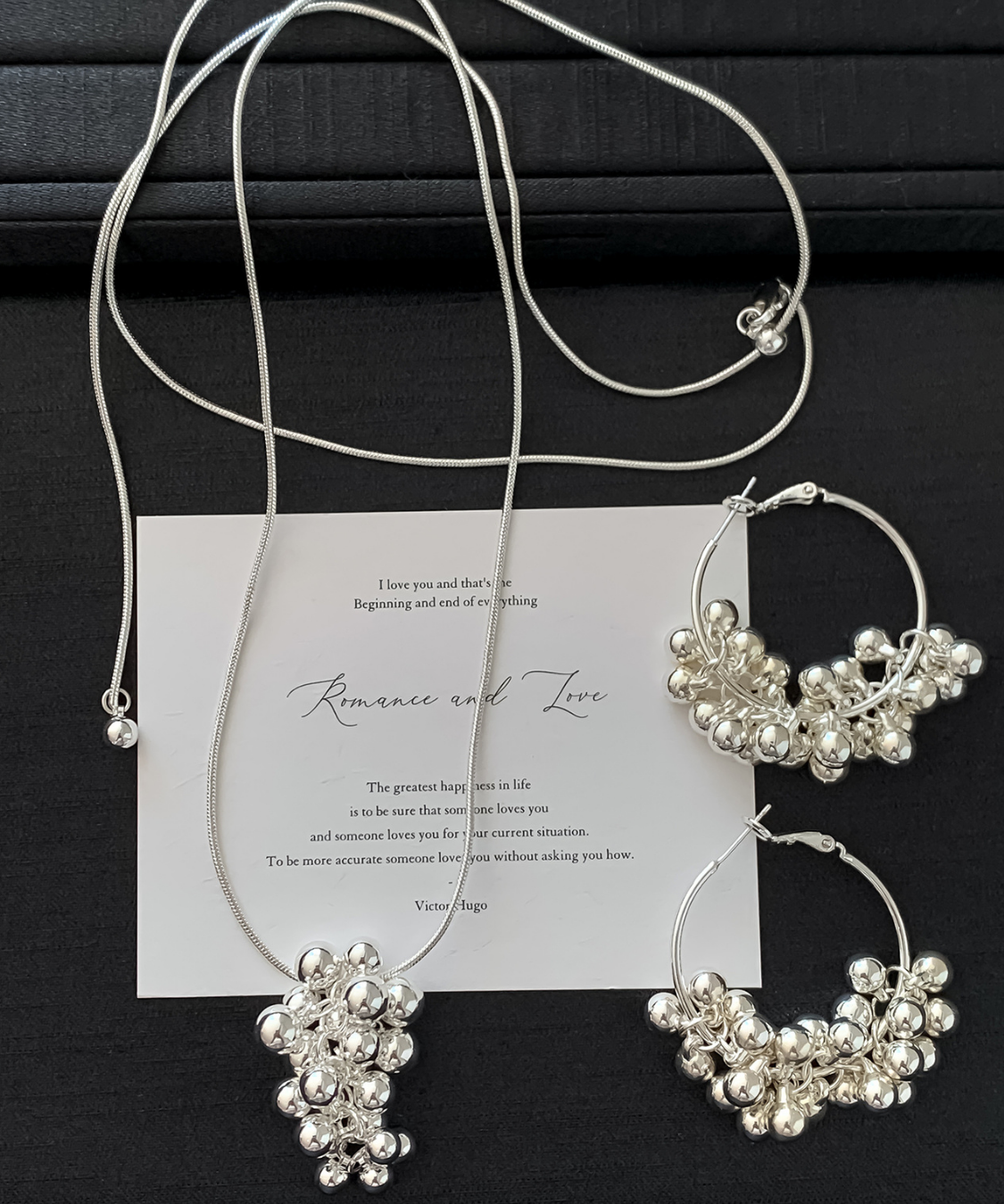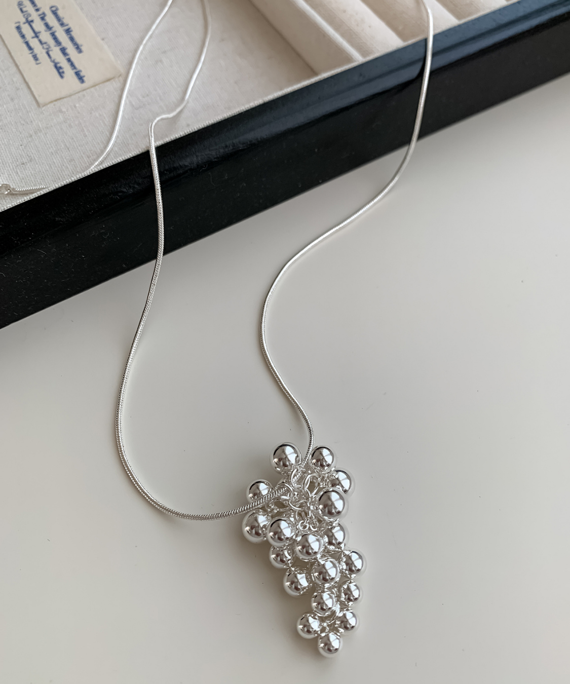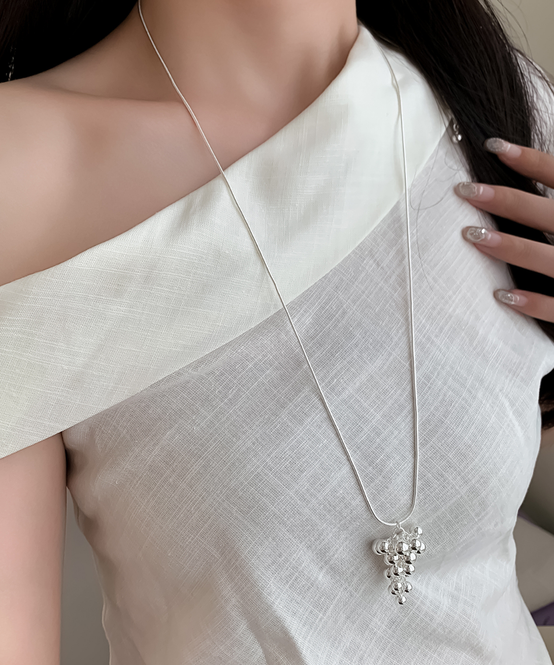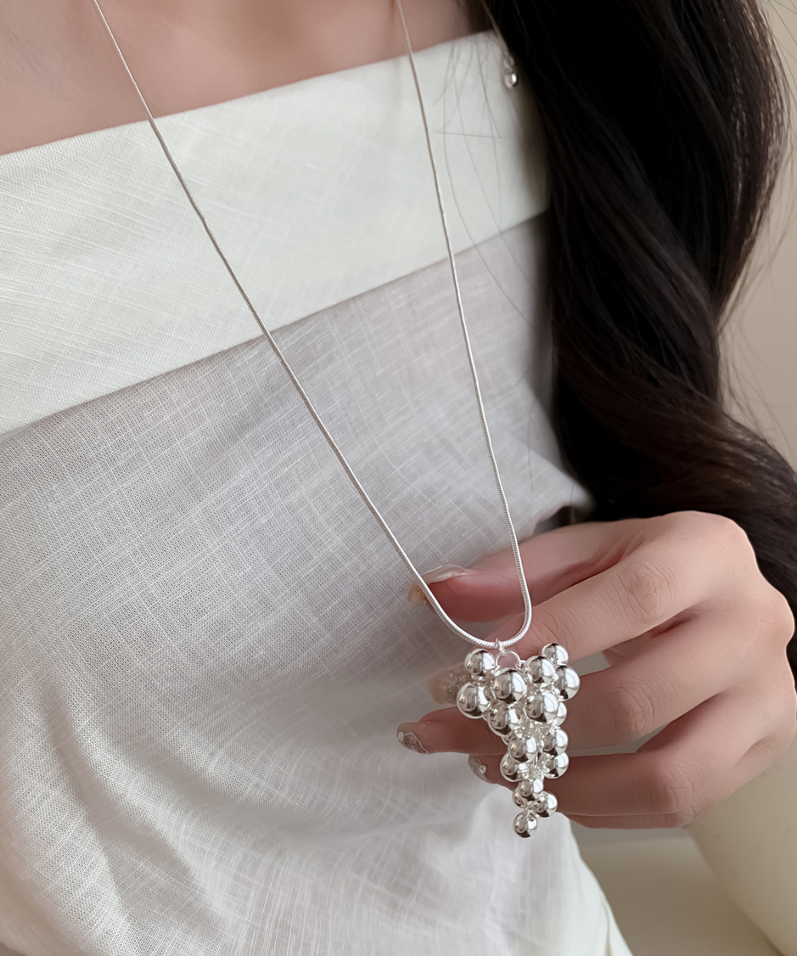 存在感のあるシルバーボールモチーフが、胸元に華やかさを添えるロングネックレスです。