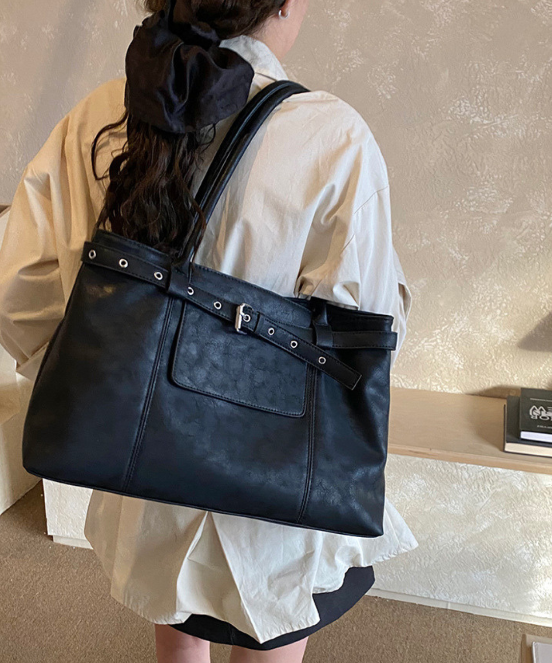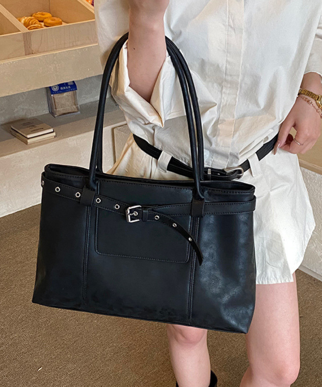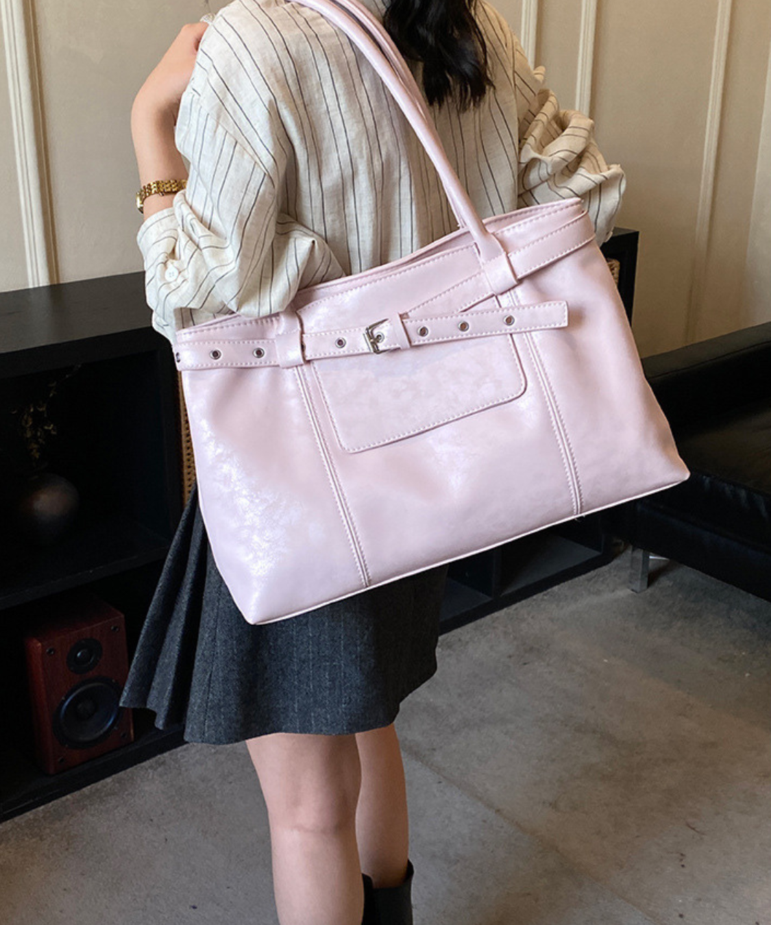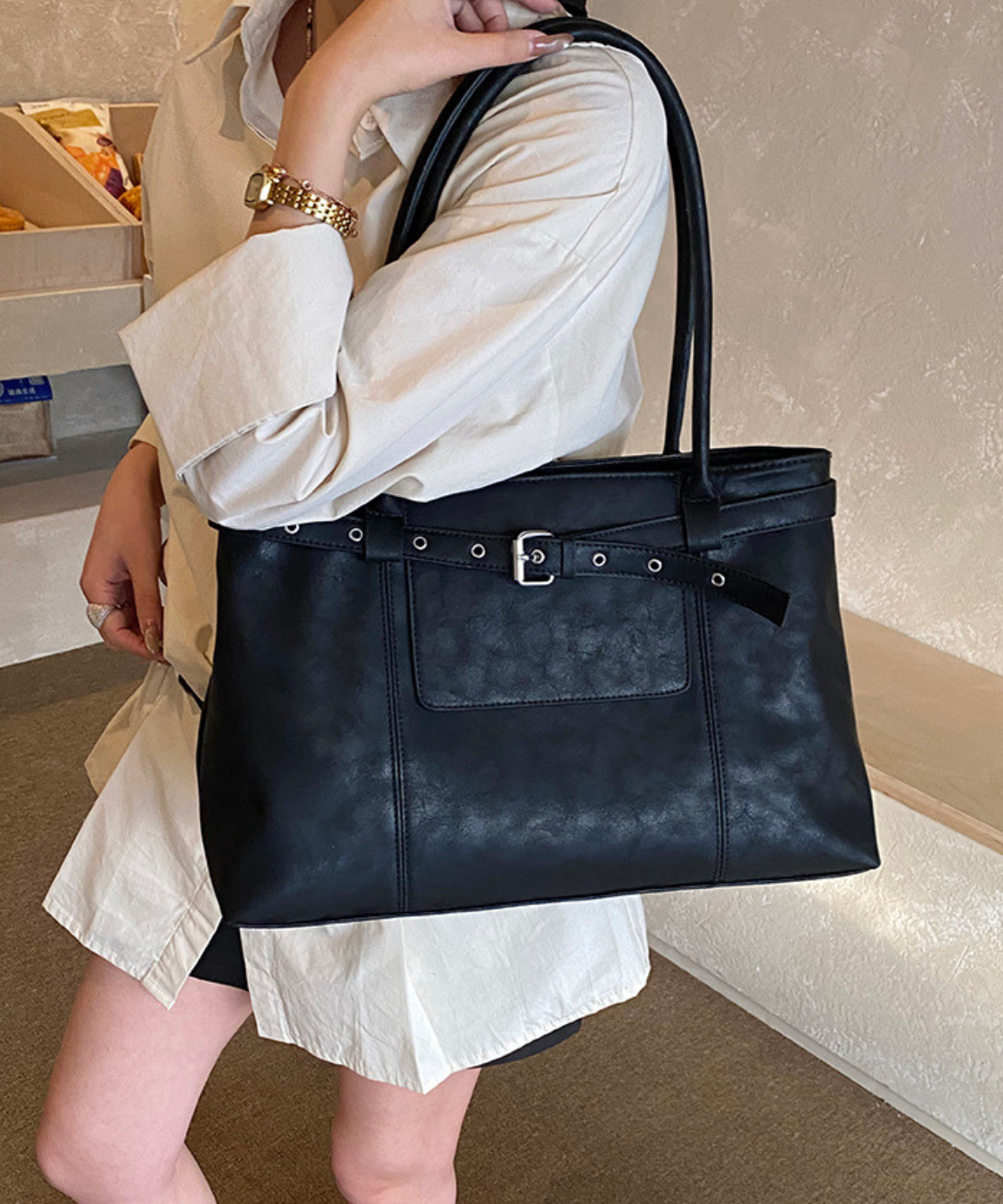 ベルトディテールが上品なアクセントになったフェイクレザートートです。