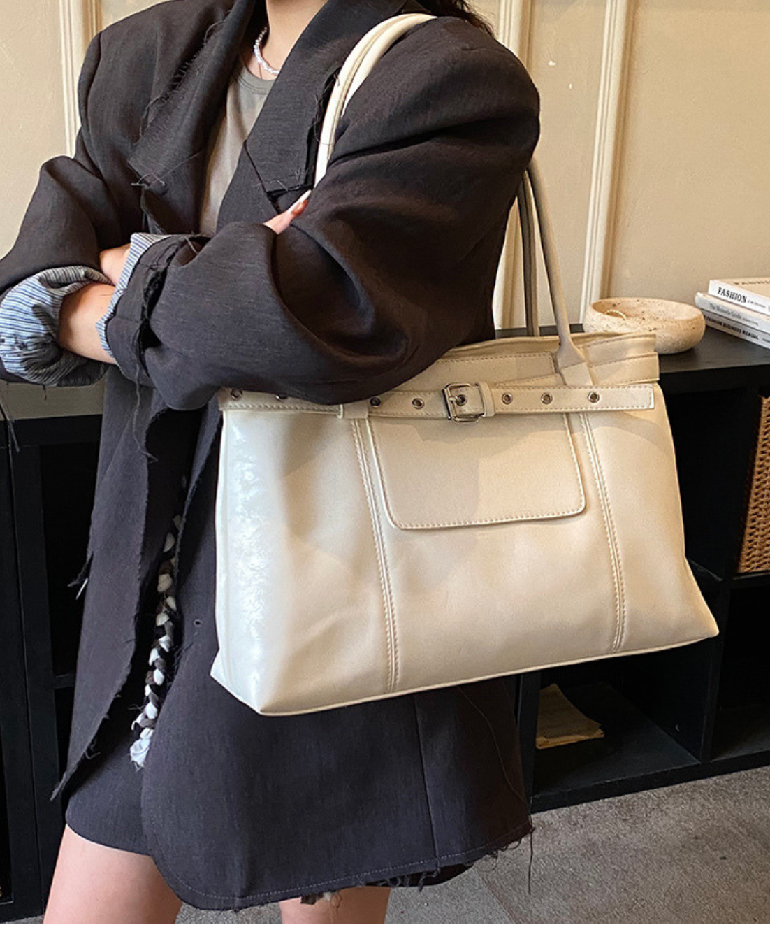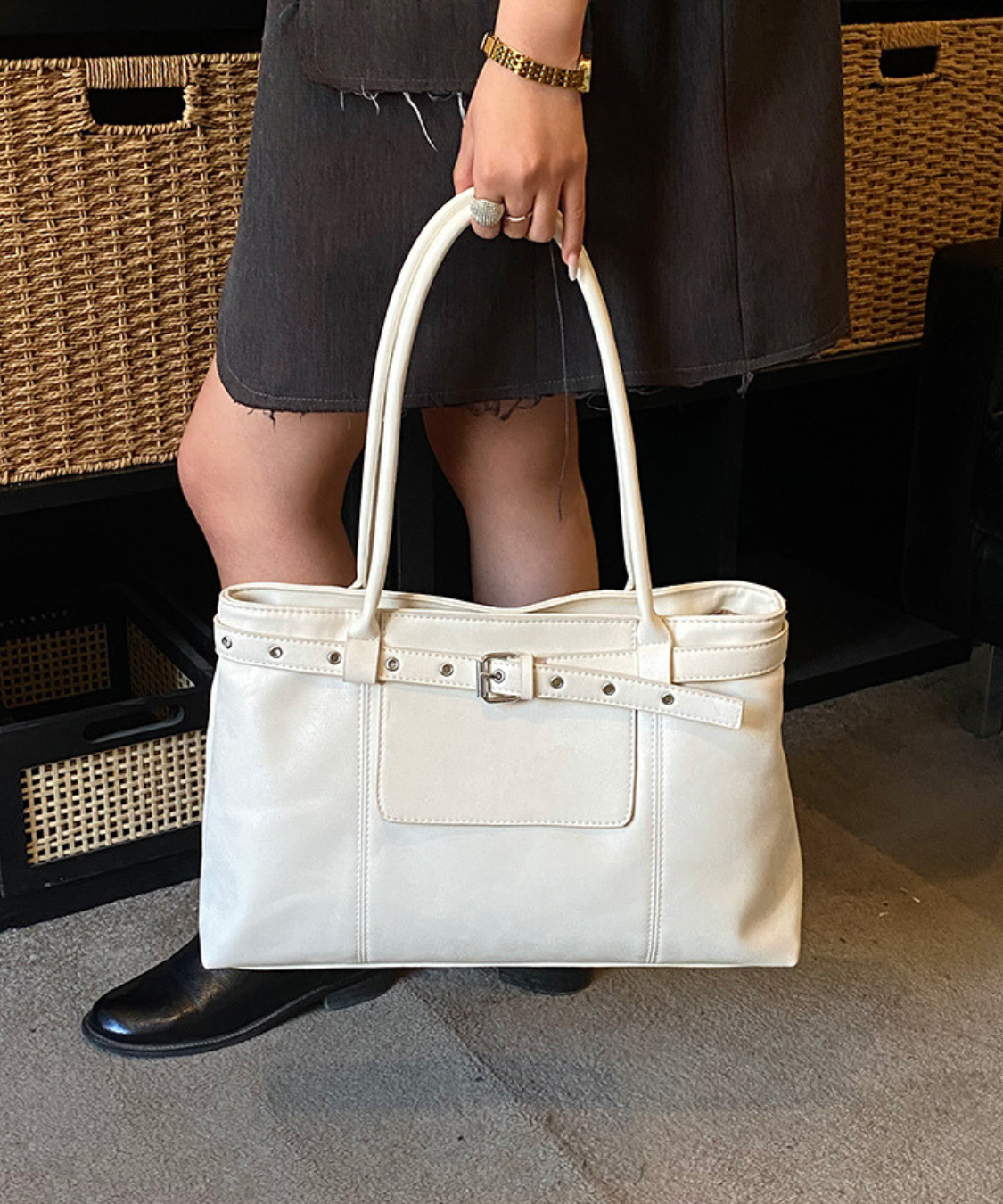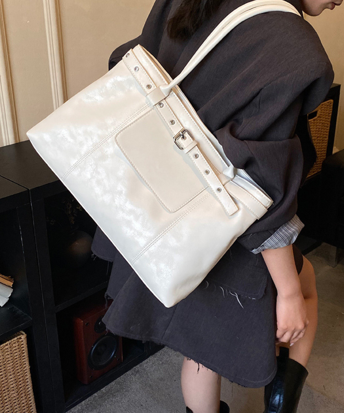 ベルトディテールが上品なアクセントになったフェイクレザートートです。