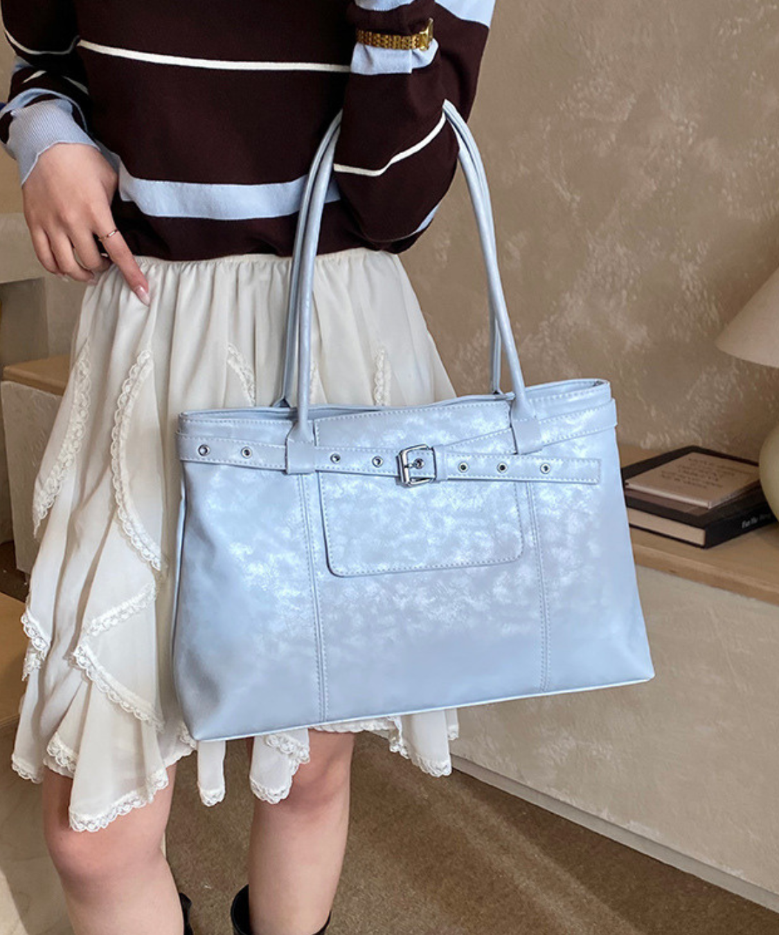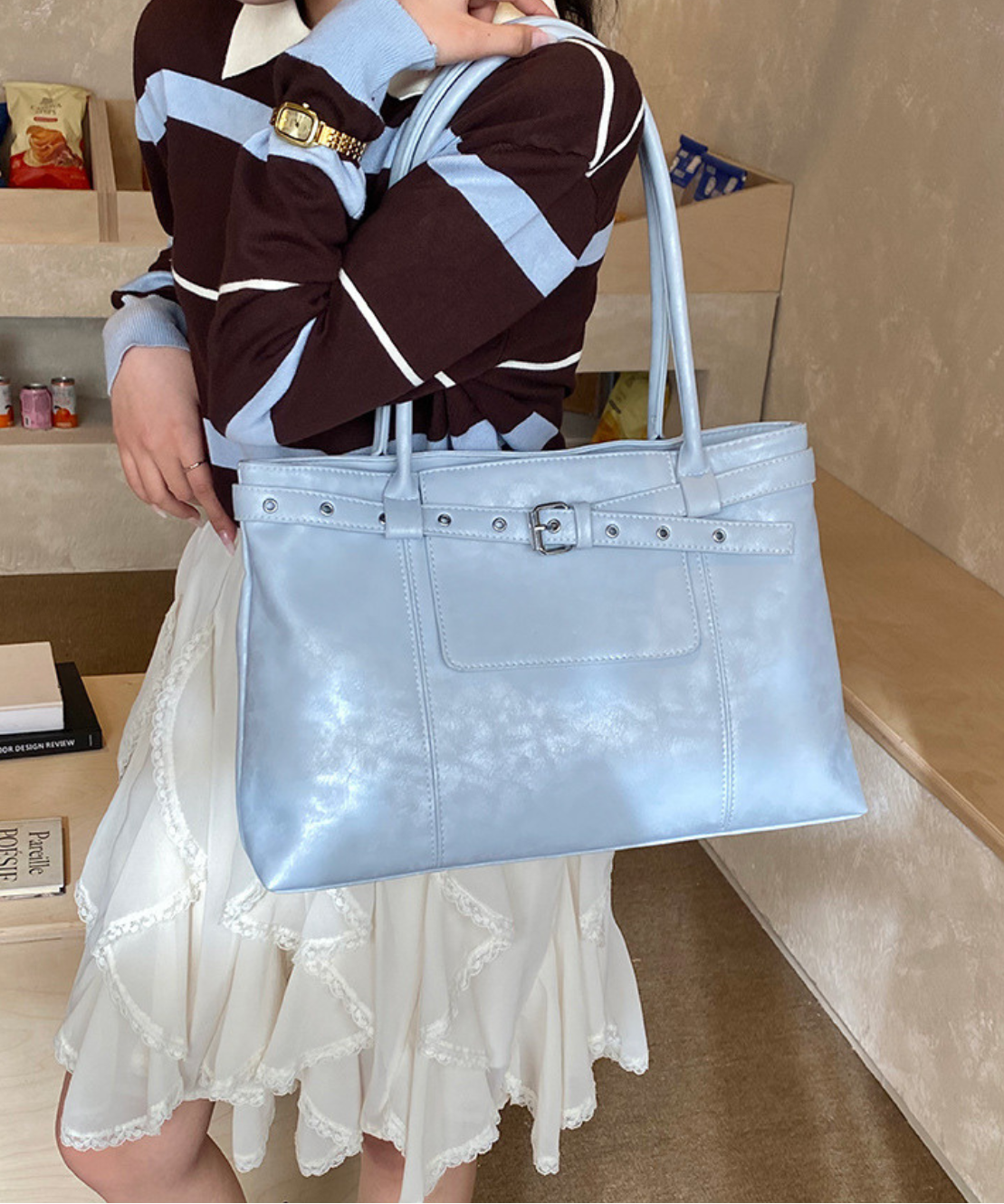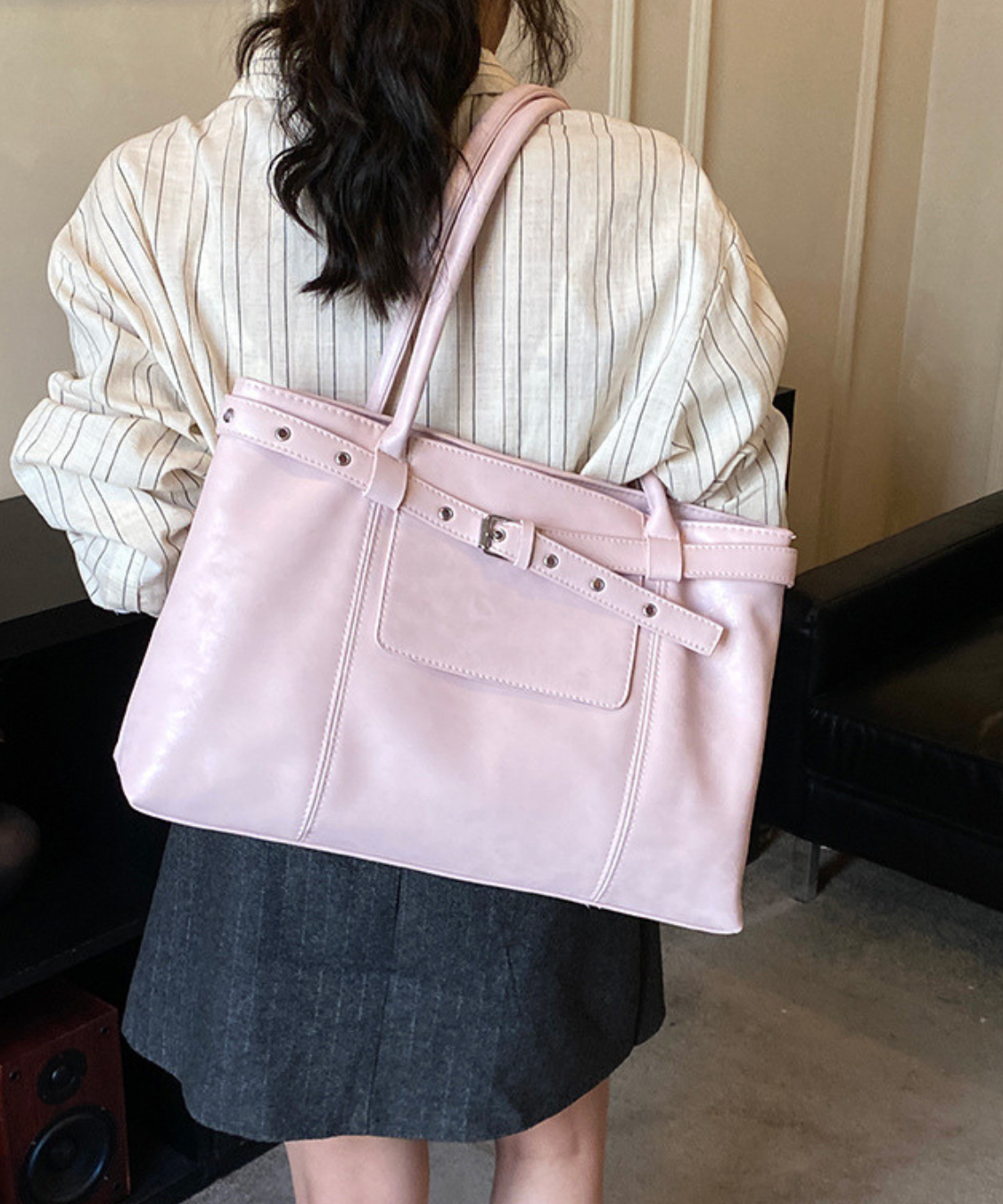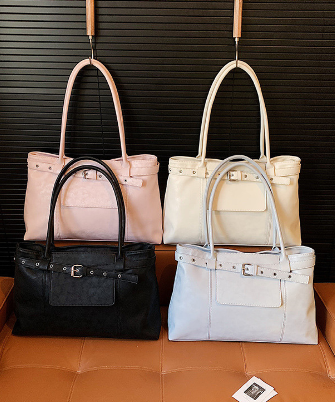 ベルトディテールが上品なアクセントになったフェイクレザートートです。