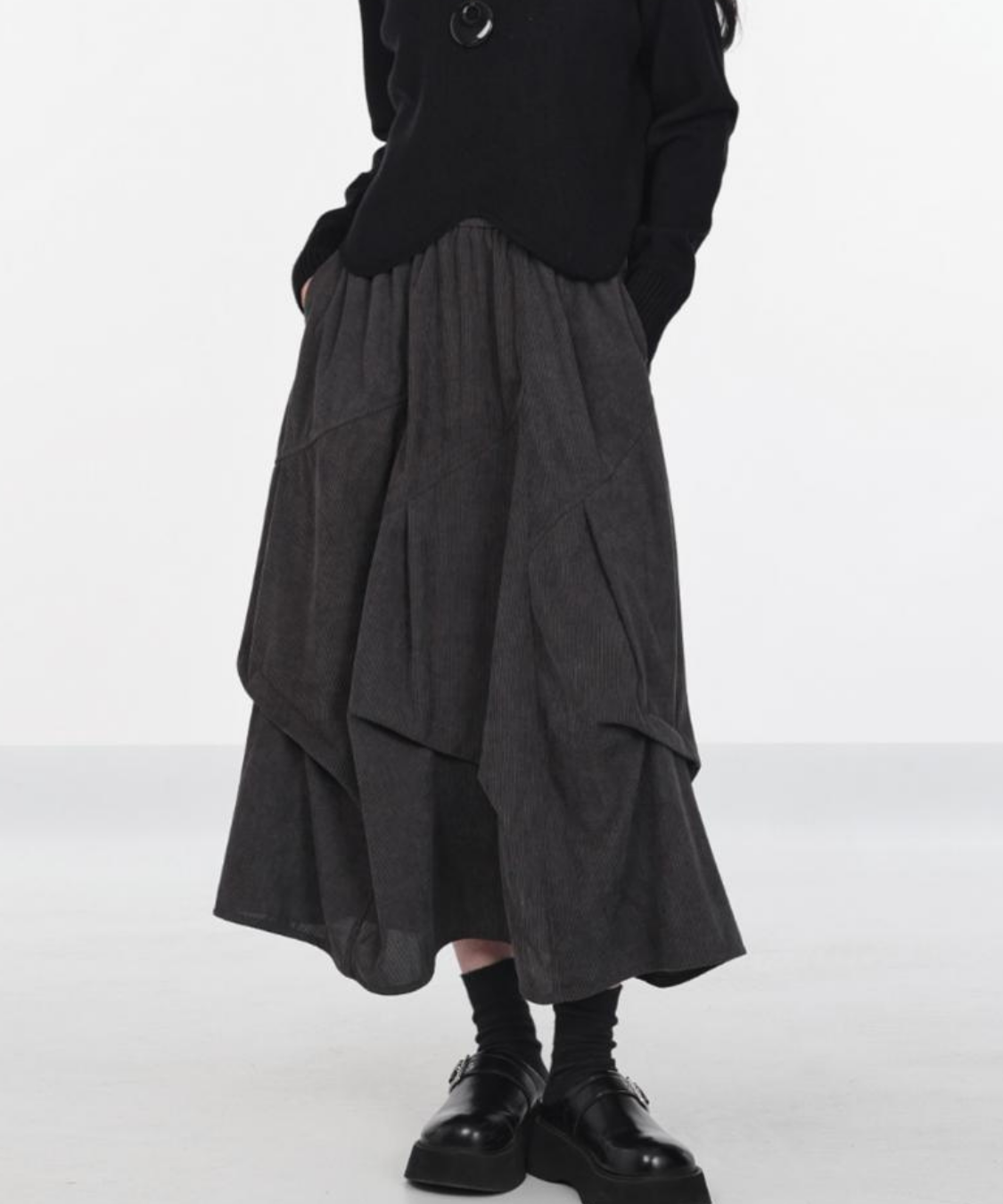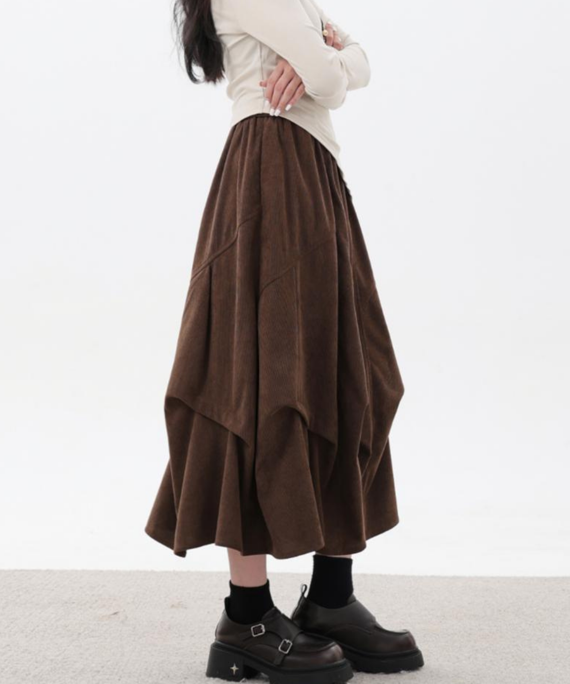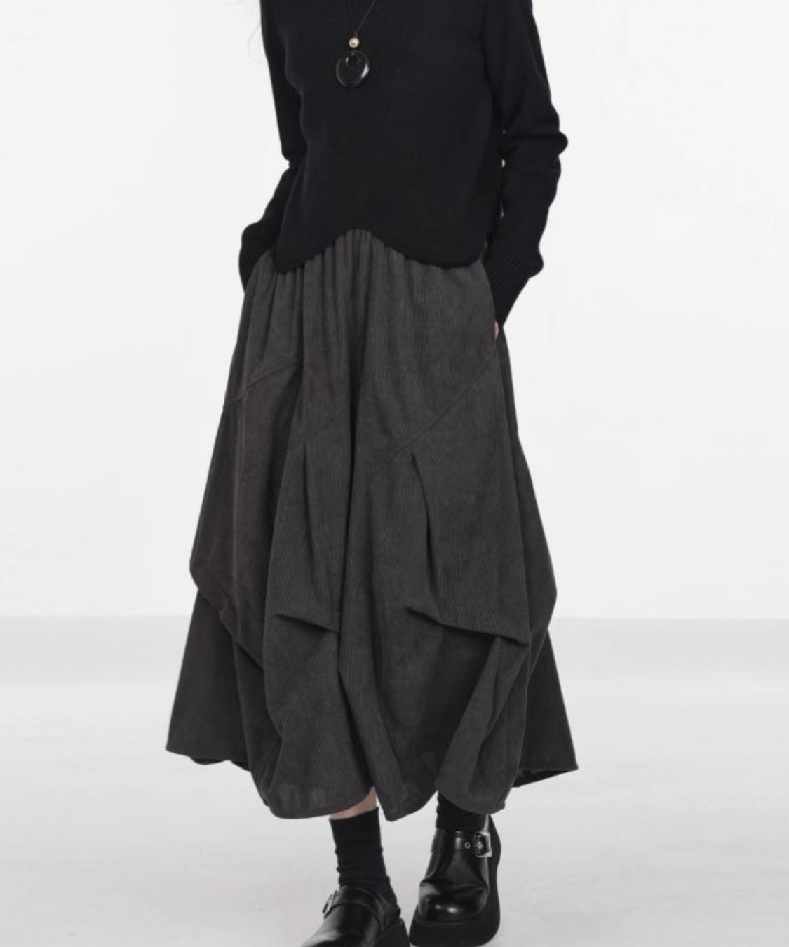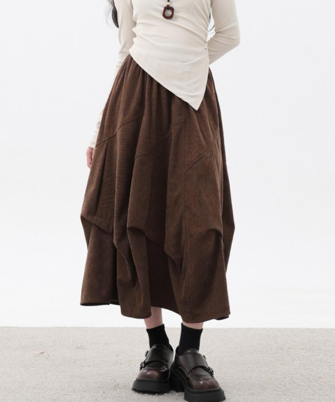あたたかみのあるコーデュロイ素材が季節感たっぷりのコクーンスカートです。