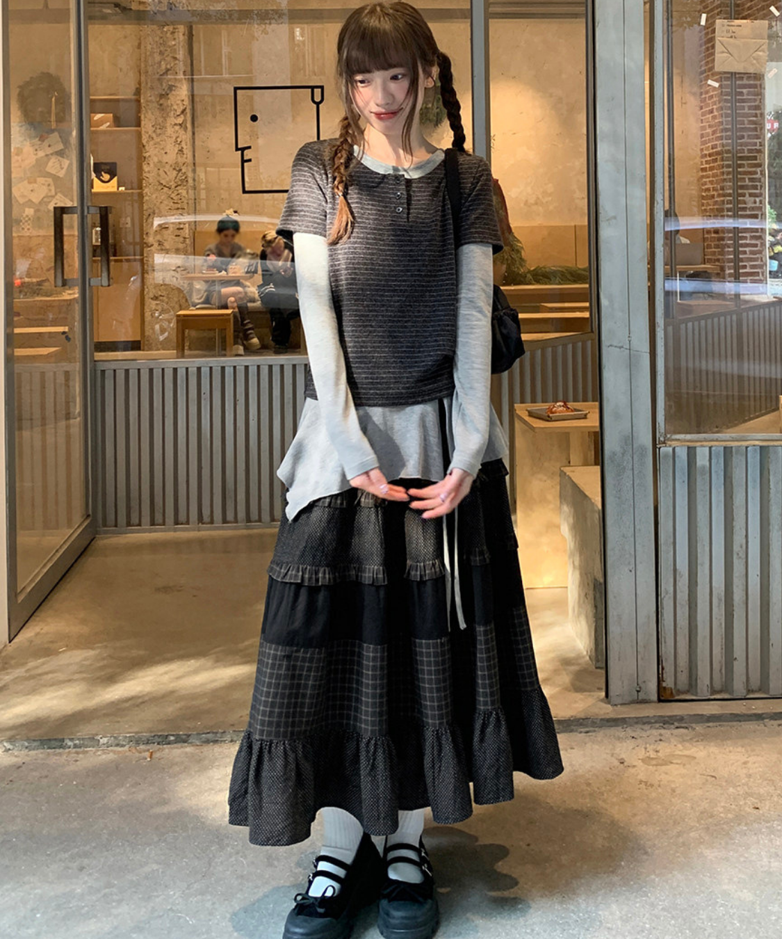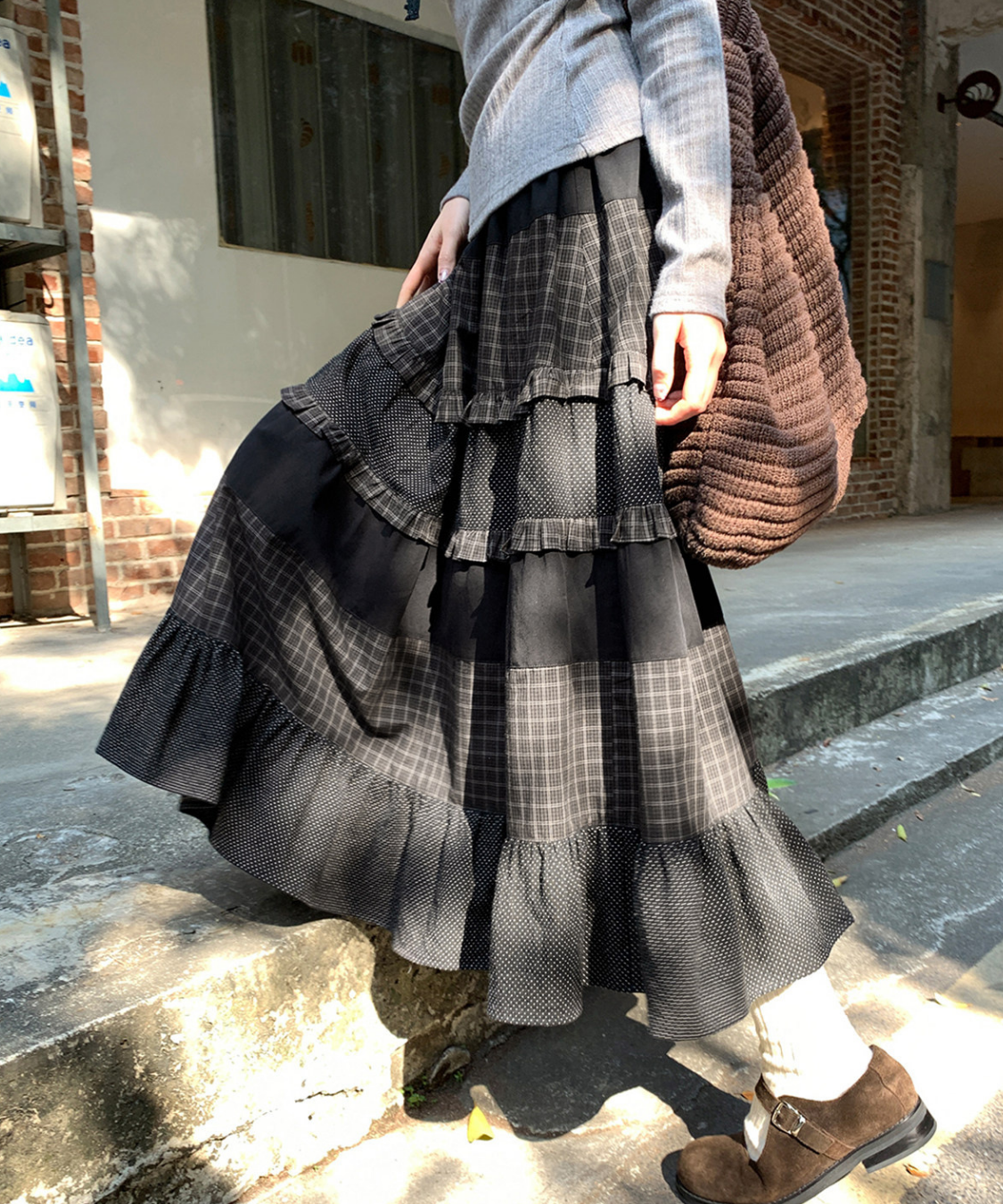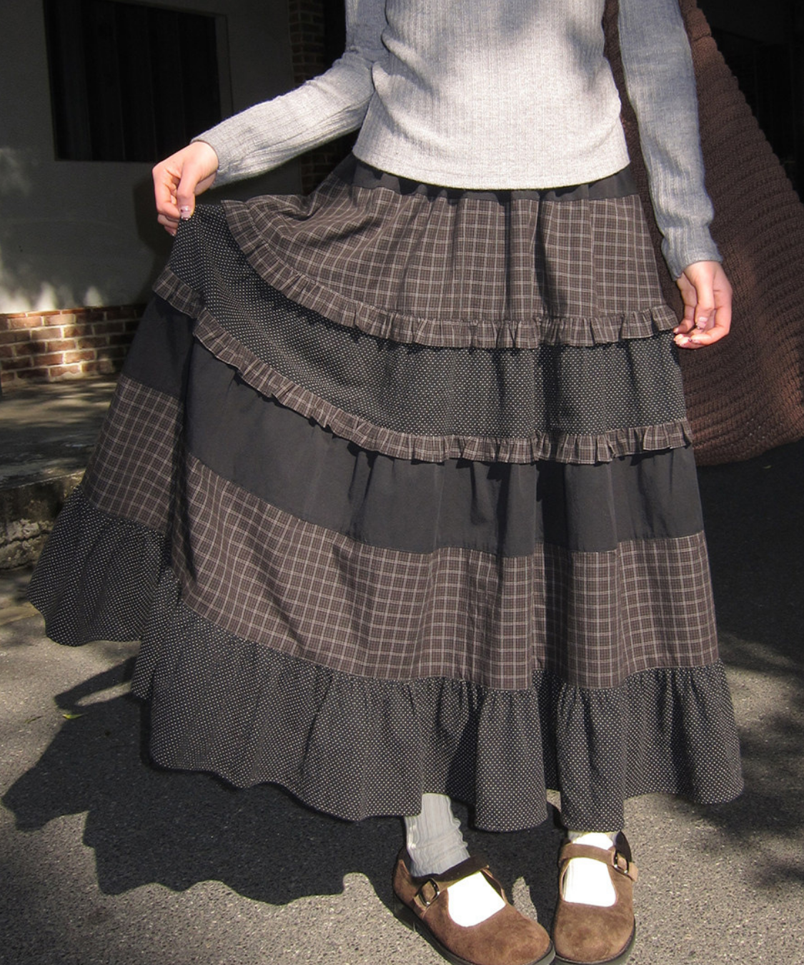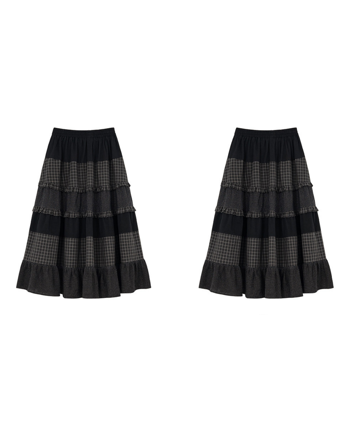 チェックドット切替ティアードロングスカート