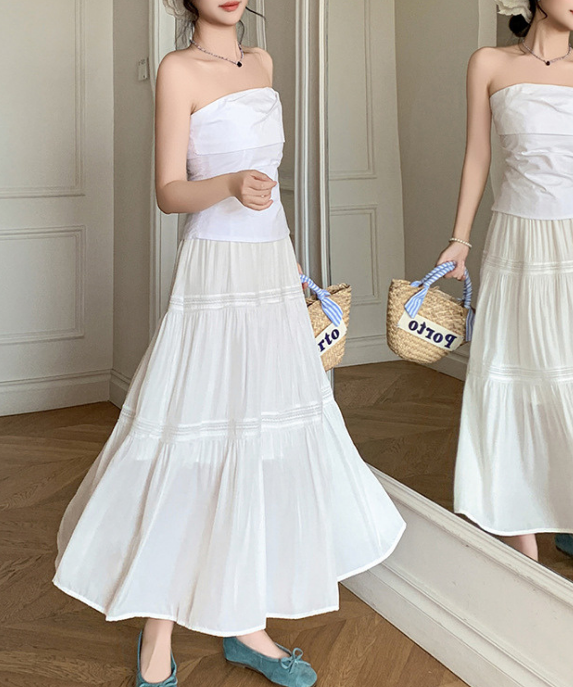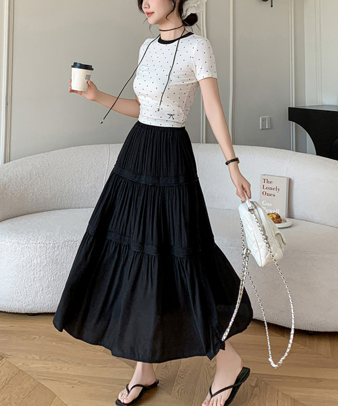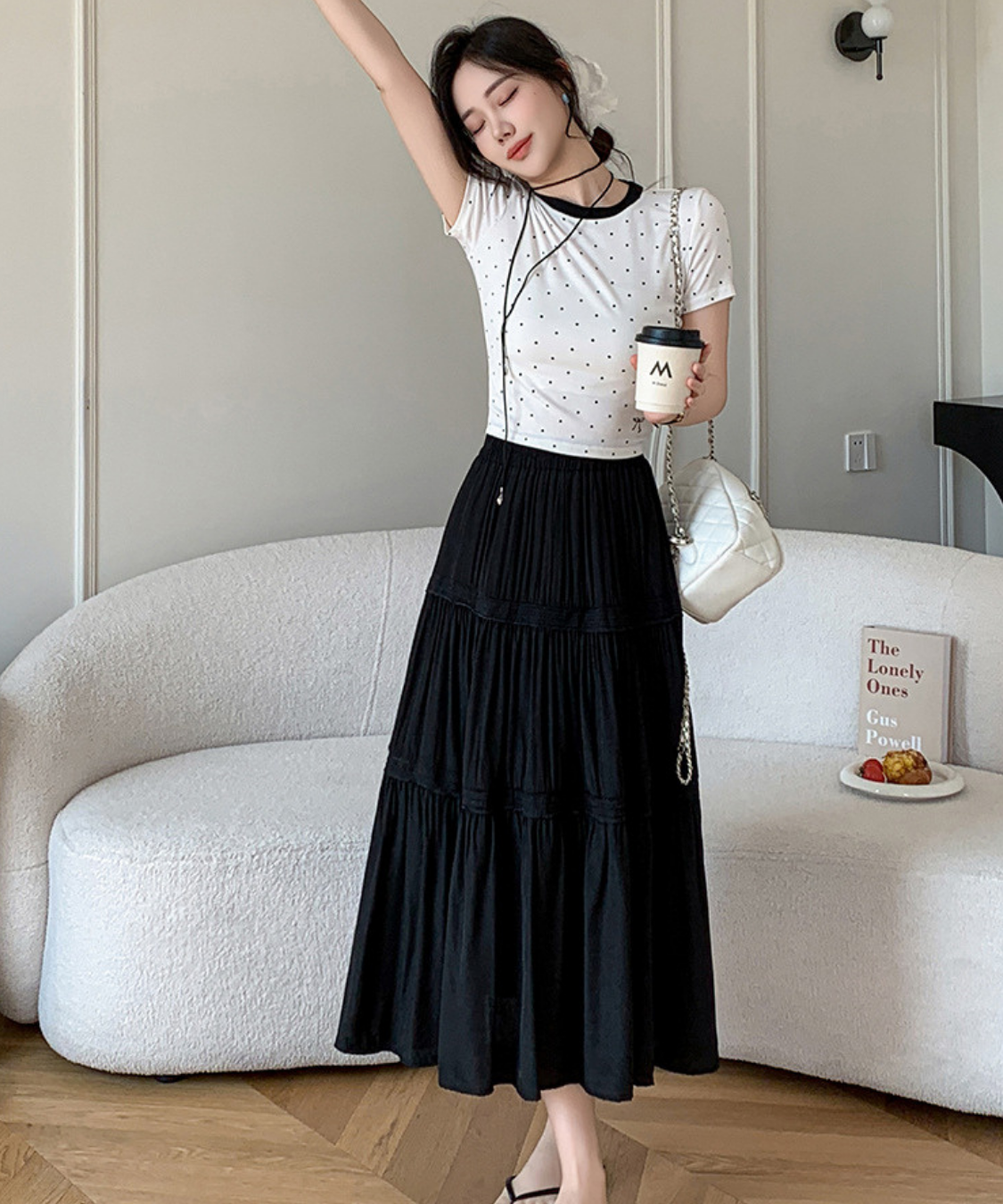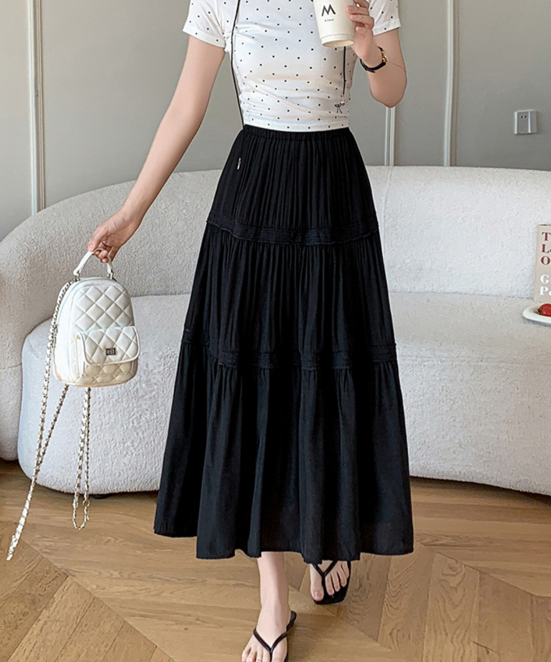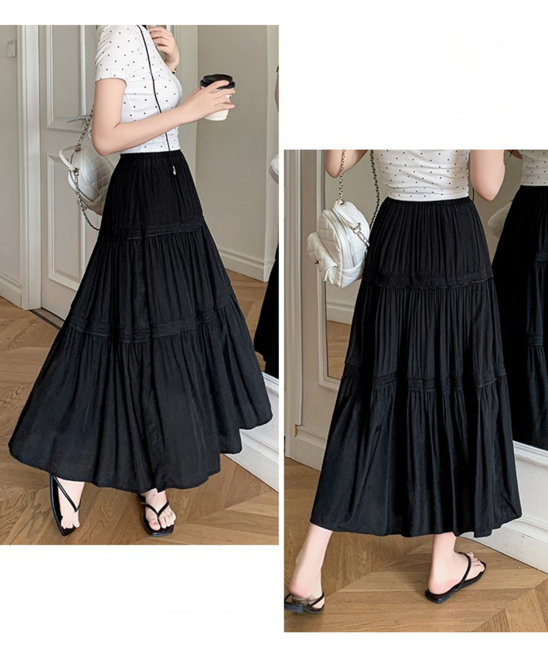 軽やかなティアードデザインが女性らしさを引き立てるロングスカートです。