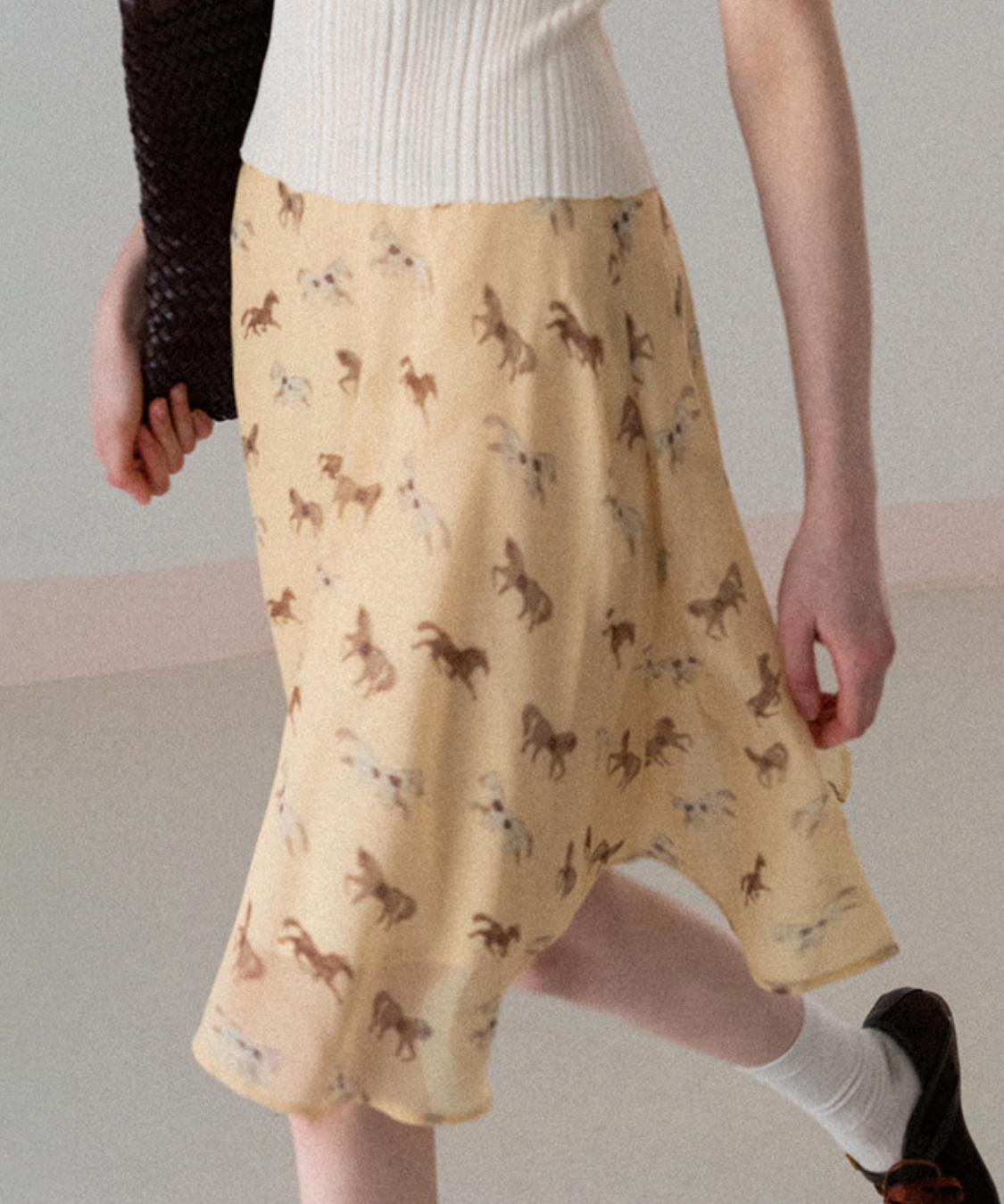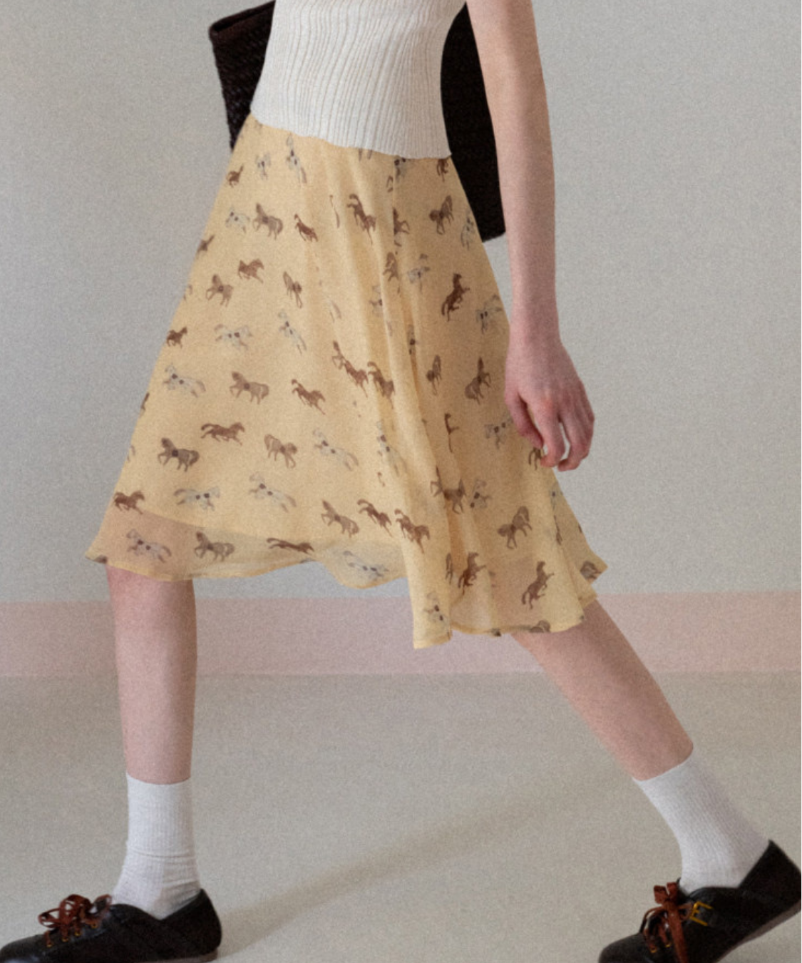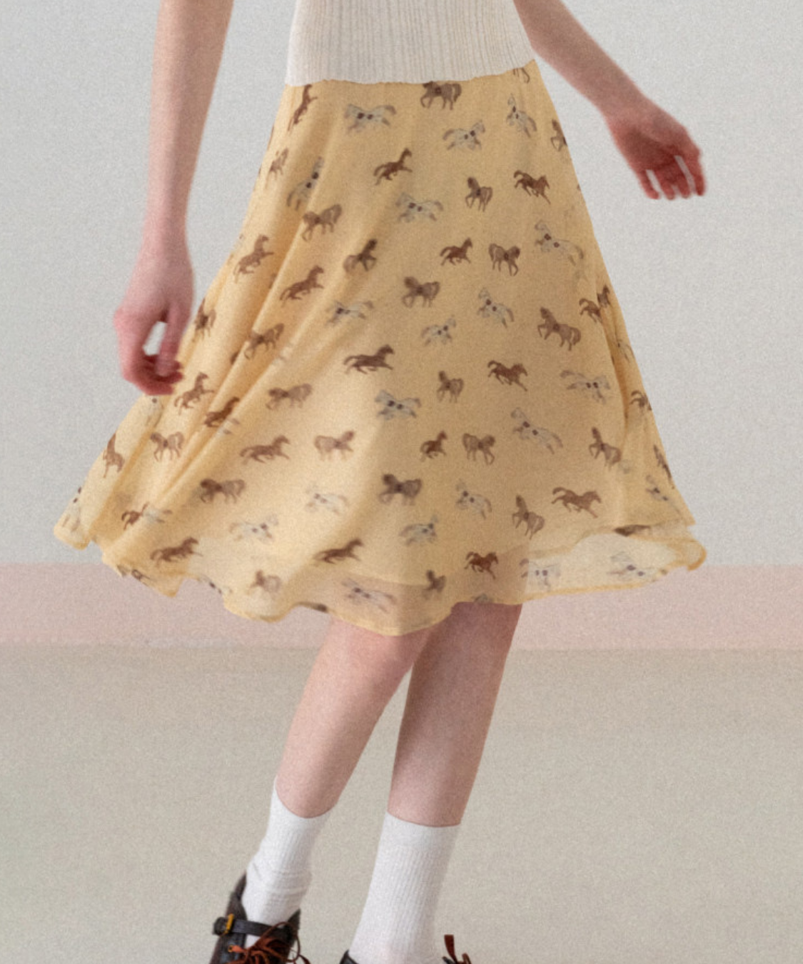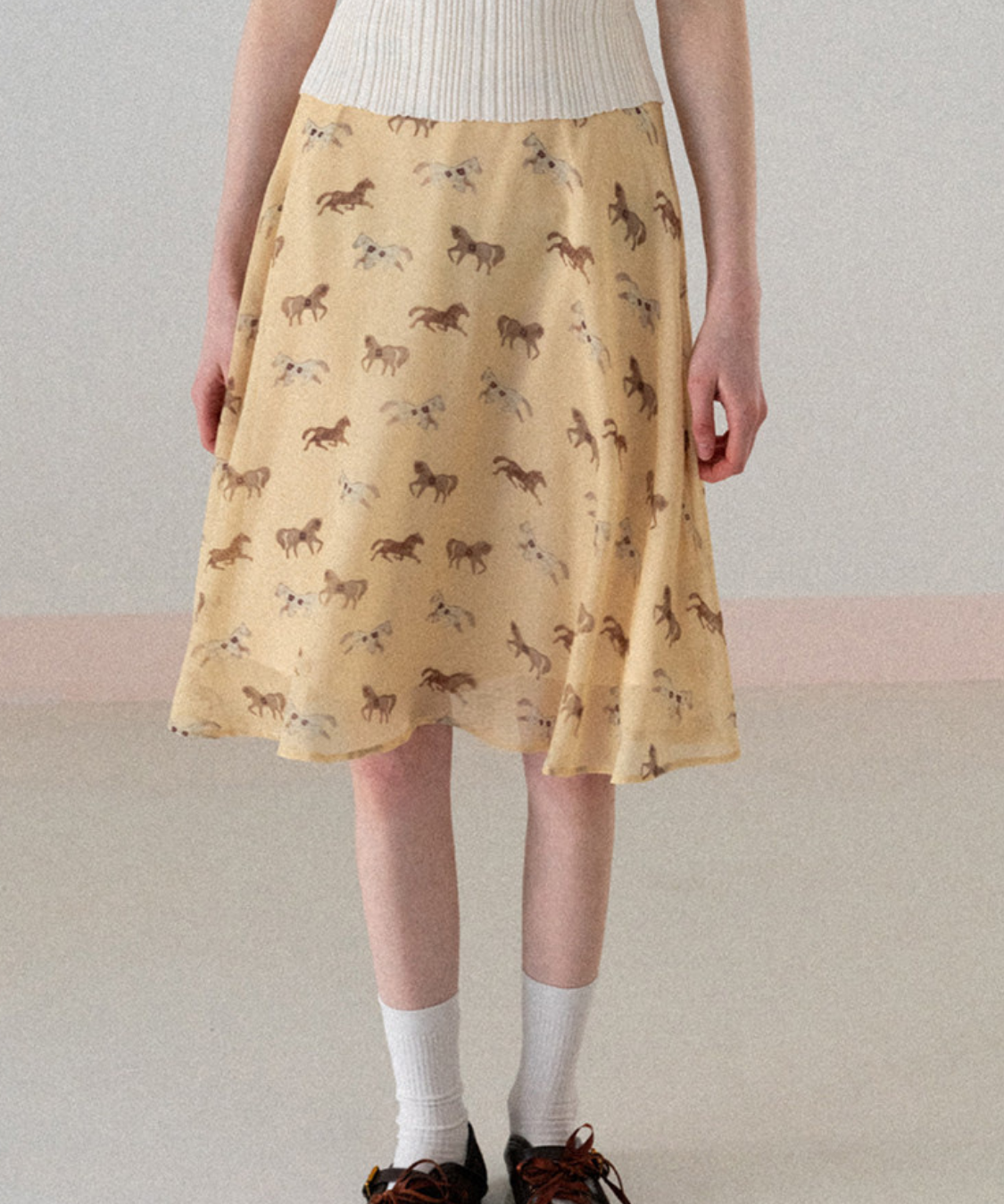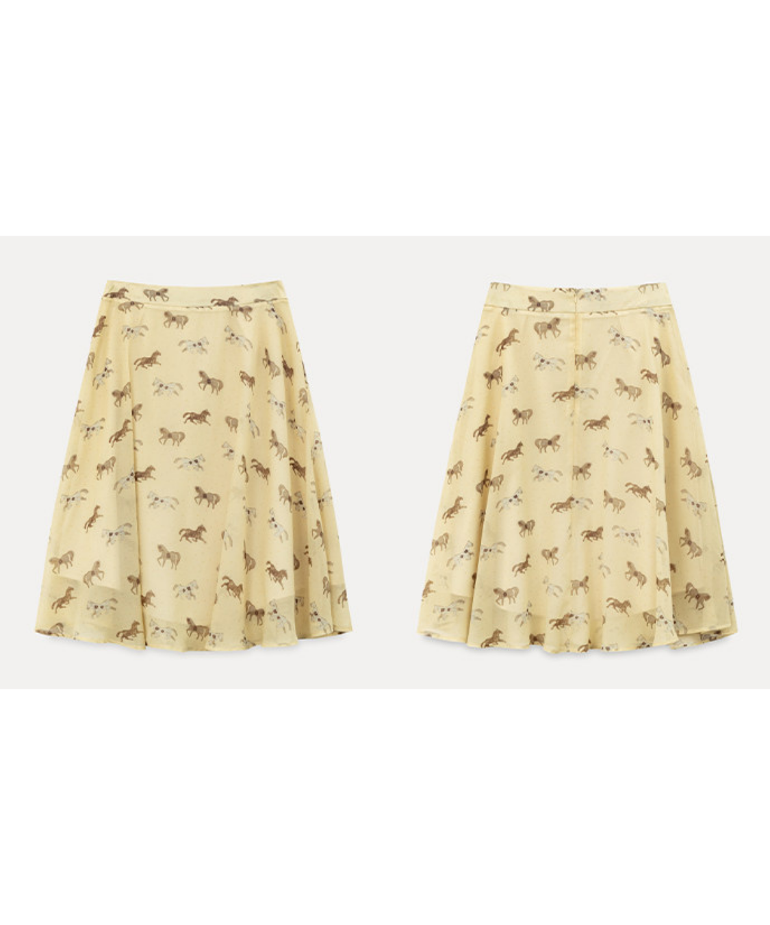 動きのあるフレアシルエットにホース柄をあしらったミモレ丈スカートです。