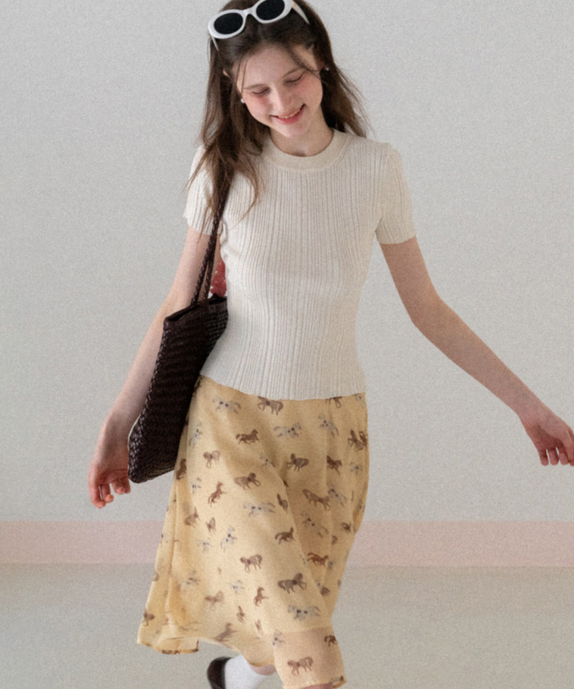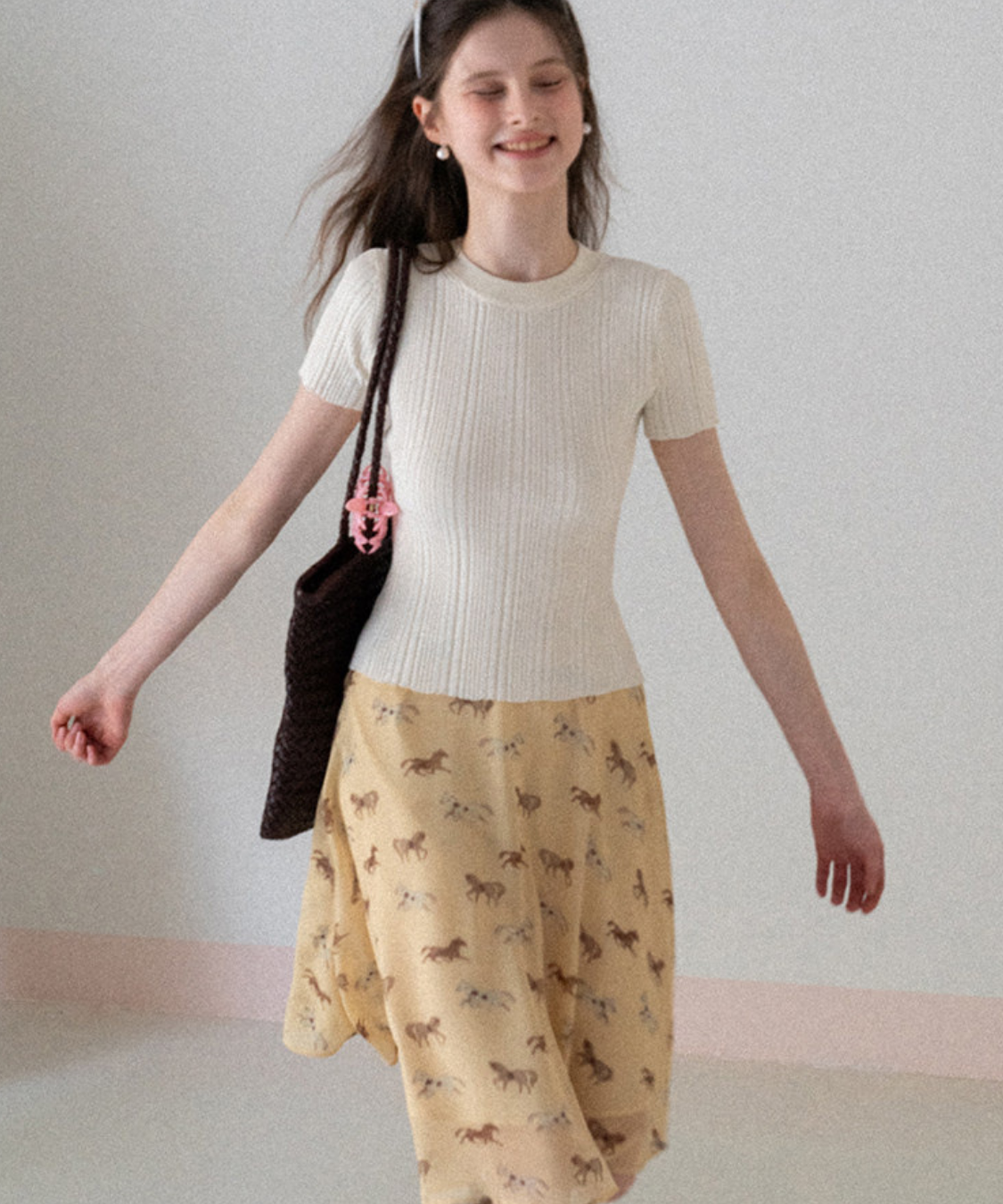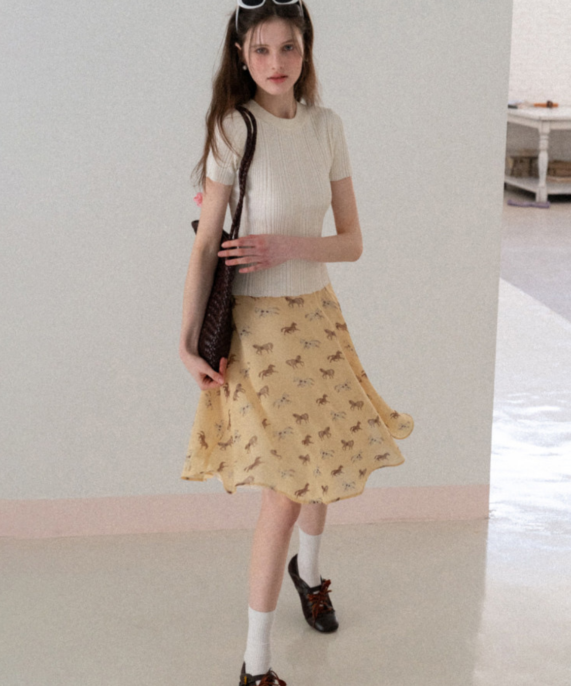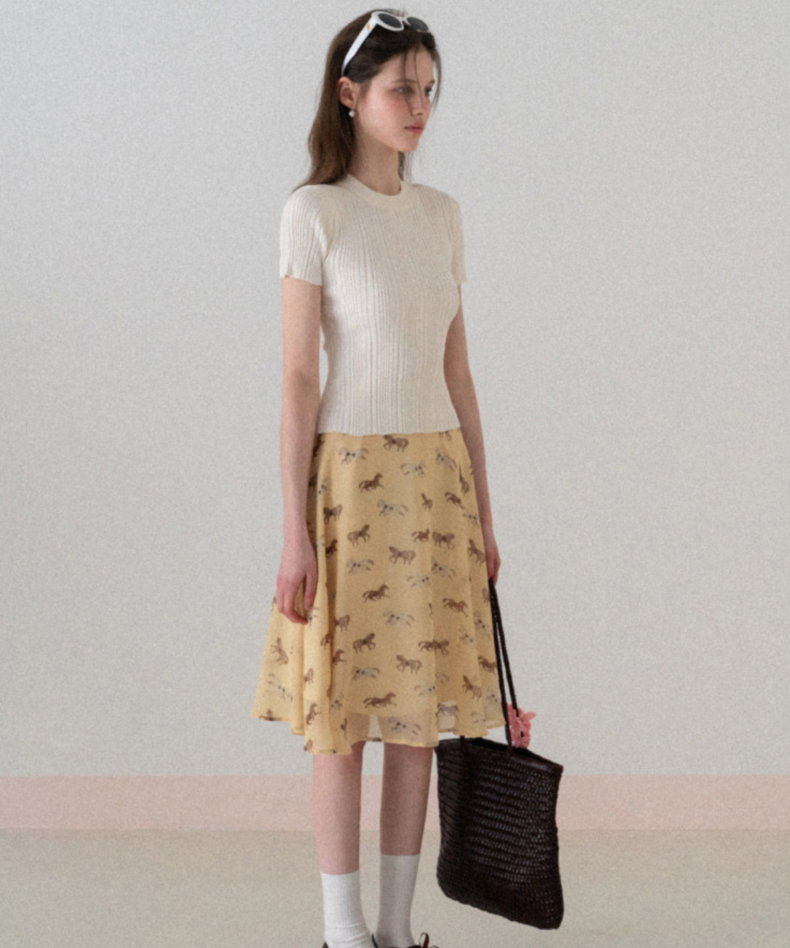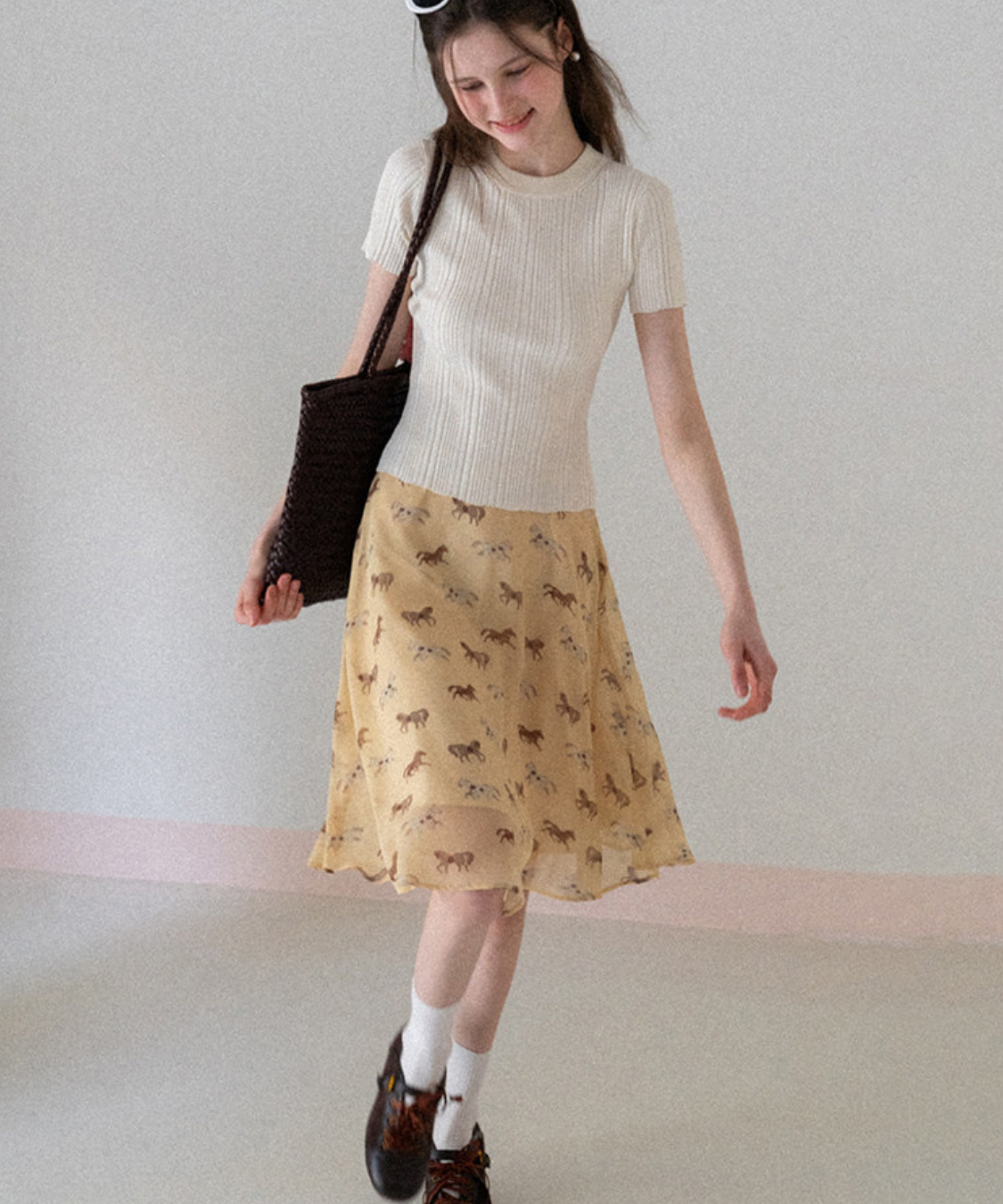 動きのあるフレアシルエットにホース柄をあしらったミモレ丈スカートです。