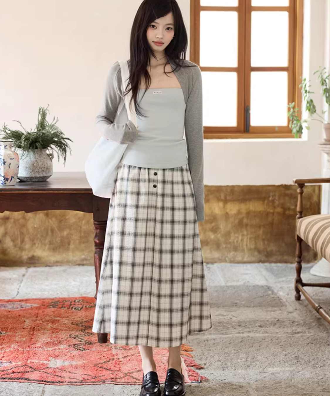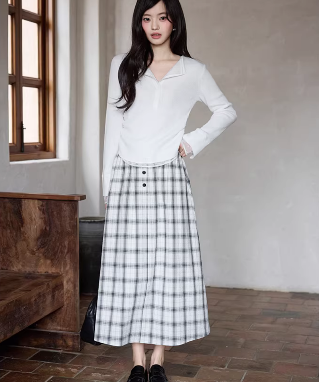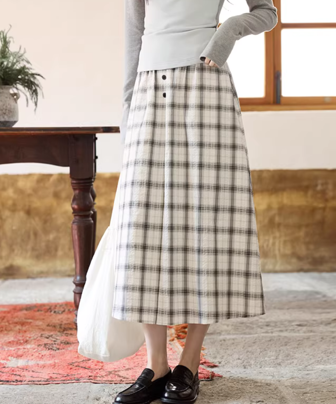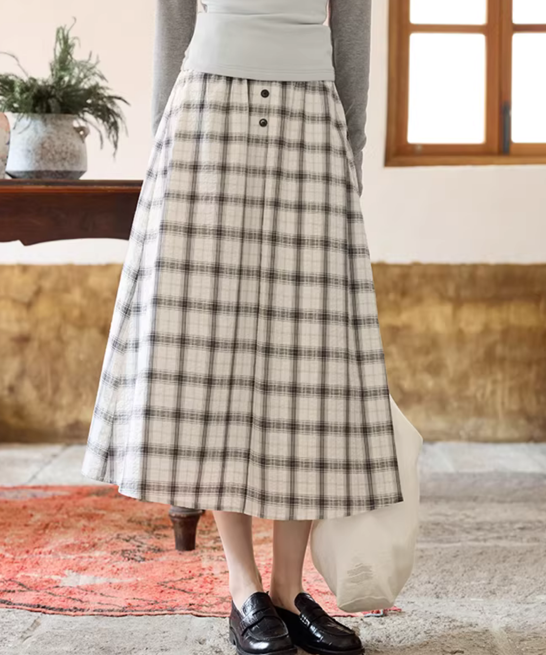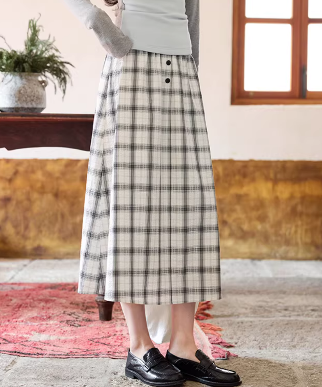 クラシカルなチェック柄とフロントボタンが目を惹くフレアスカートです。