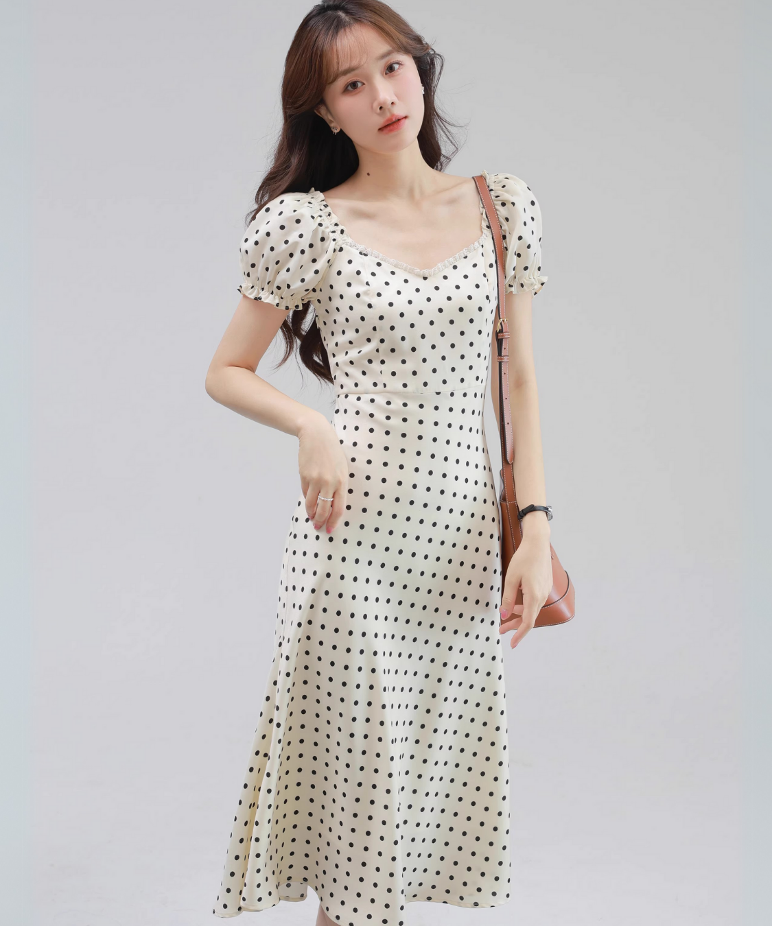 デコルテを綺麗に見せるスイートハートネックがポイントのドット柄ワンピースです。