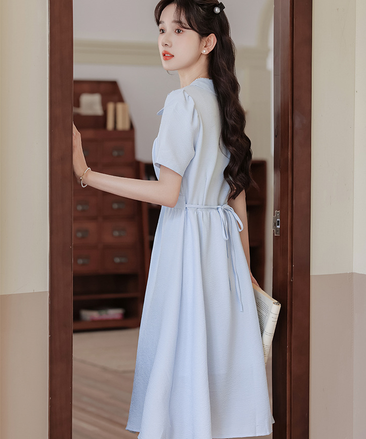 胸元に寄せたギャザーとフロントボタンが、上品でクラシカルな印象のワンピースです。