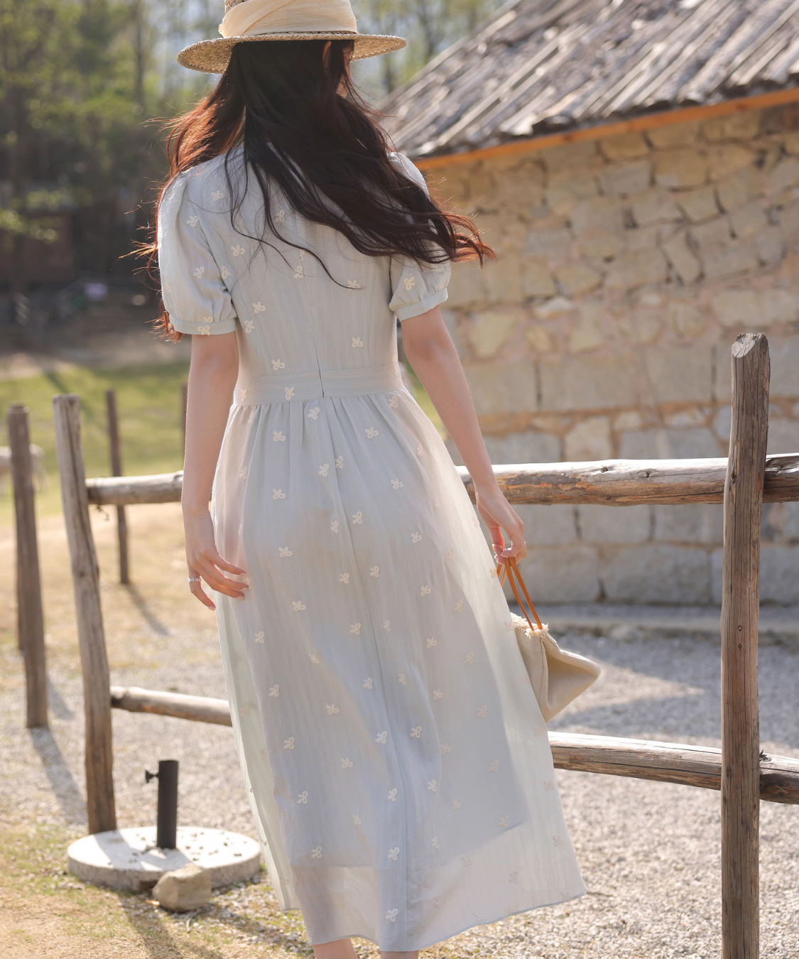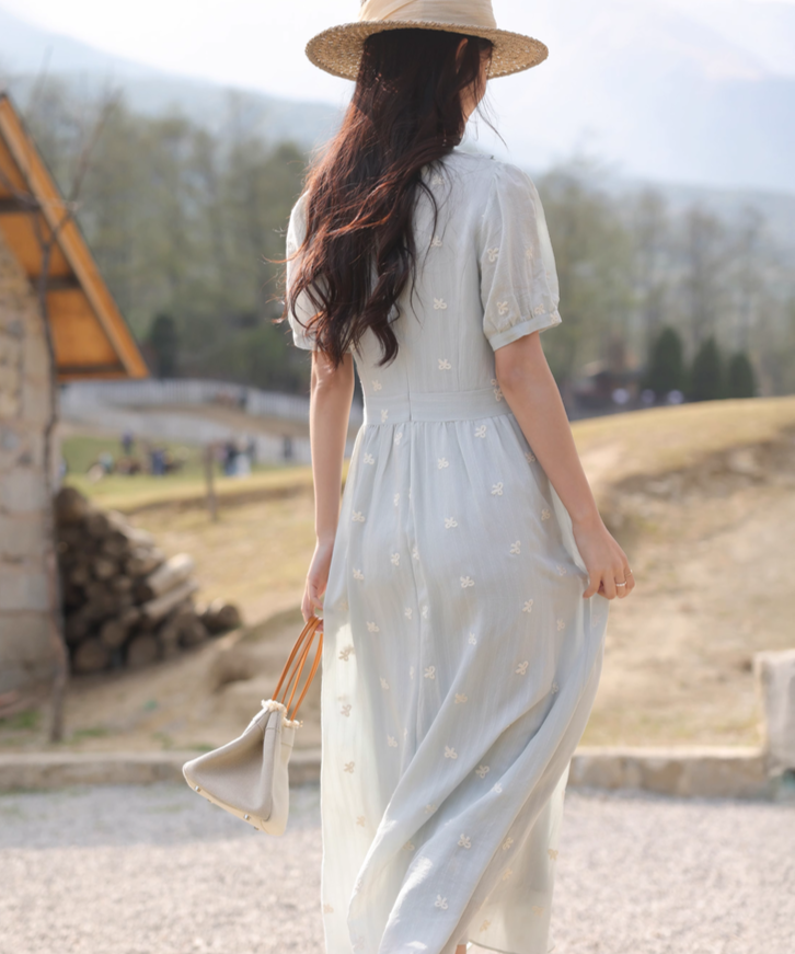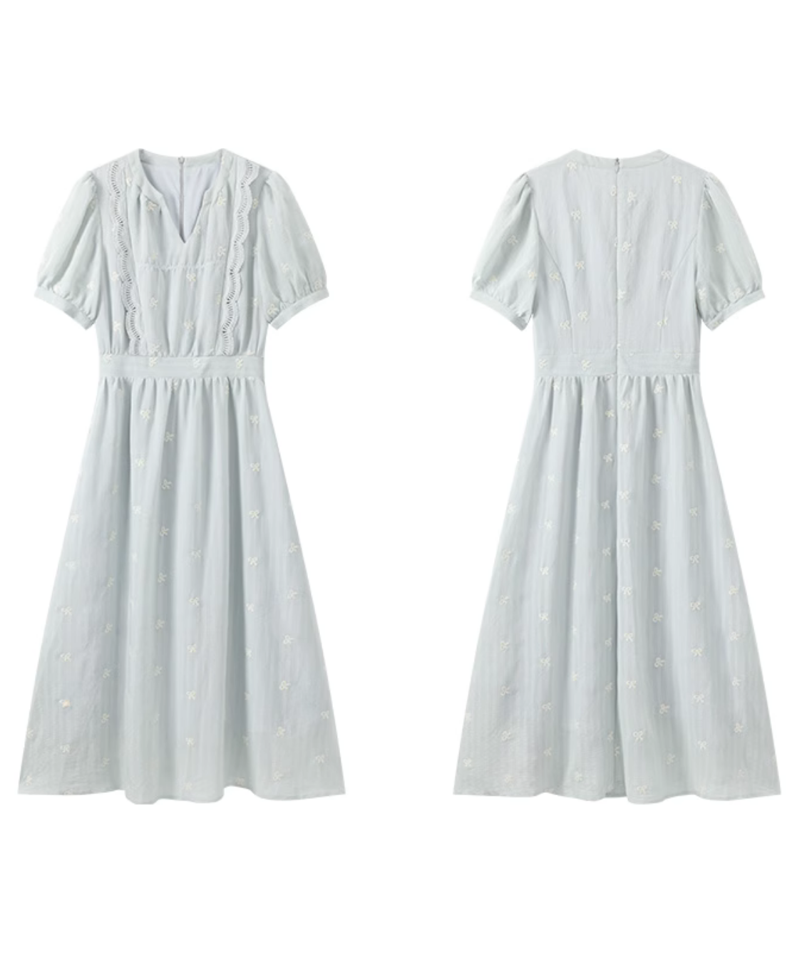 刺繍がほんとにきれいで、着るたびに気分が上がります!Vネックとウエストマークでスタイルもよく見えて嬉しい💕