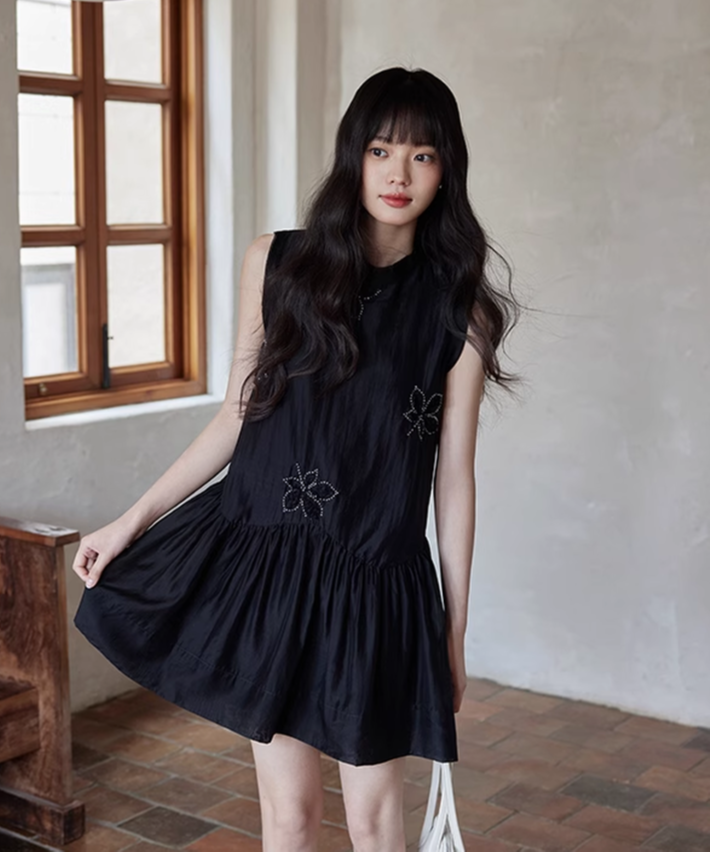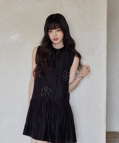 ビーズ刺繍のフラワーモチーフがアクセントになったミニワンピースです。