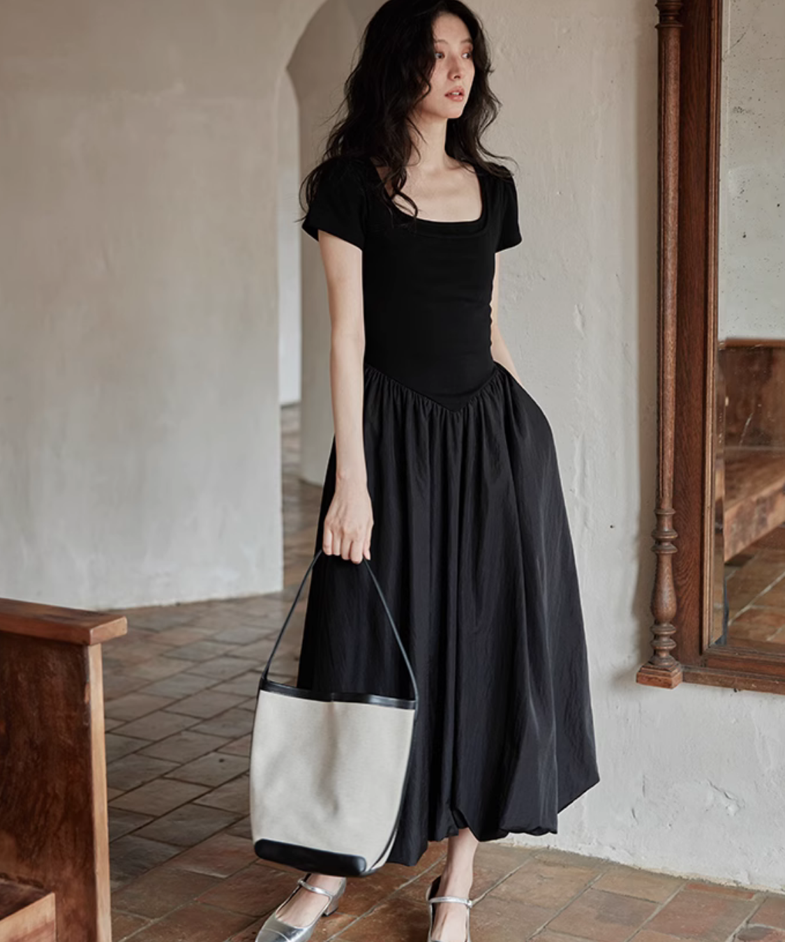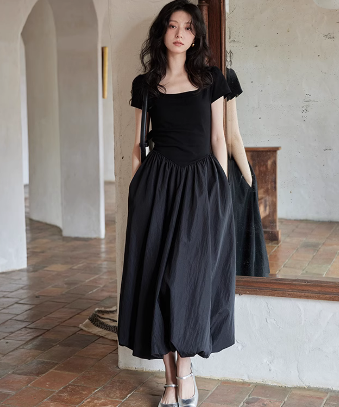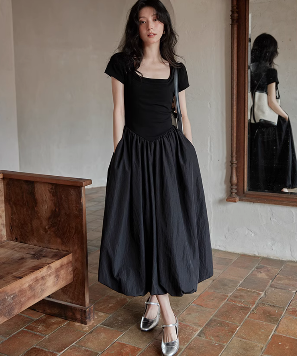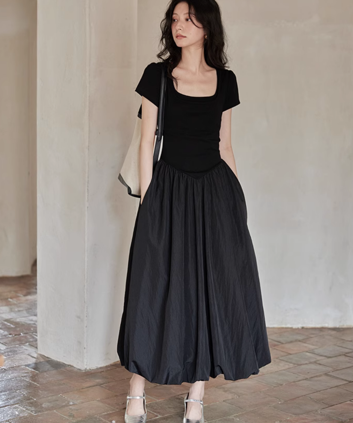 トップスはフィット感のあるカットソー、スカートは立体的なバルーンシルエットの異素材ミックスワンピースです。