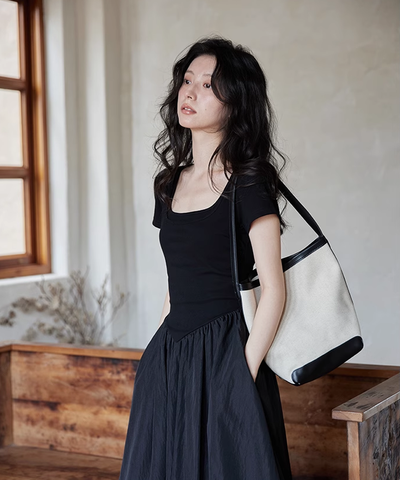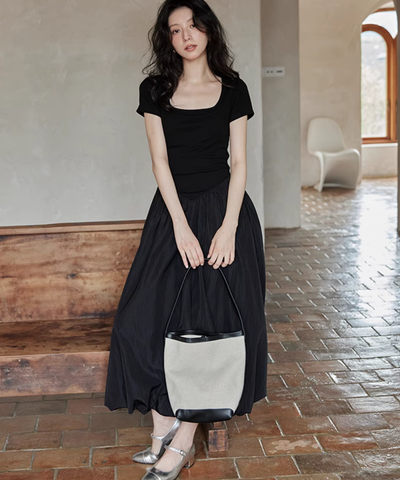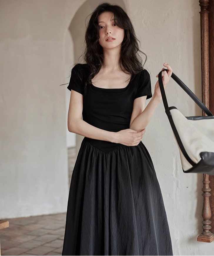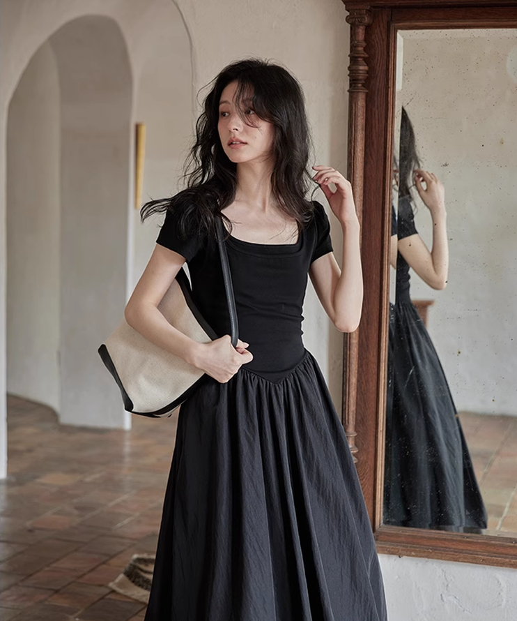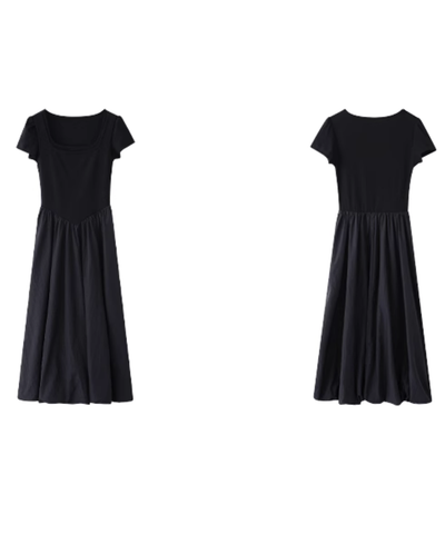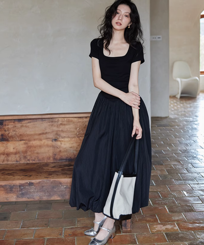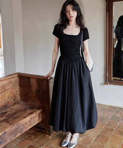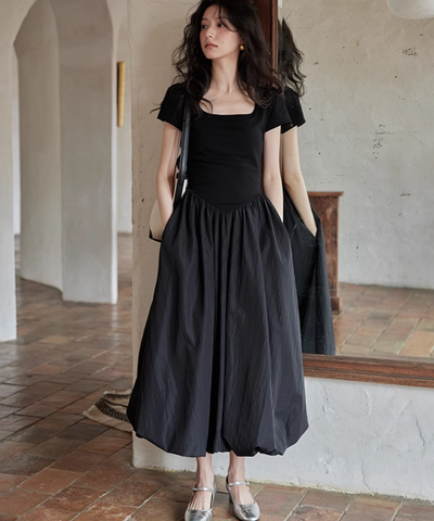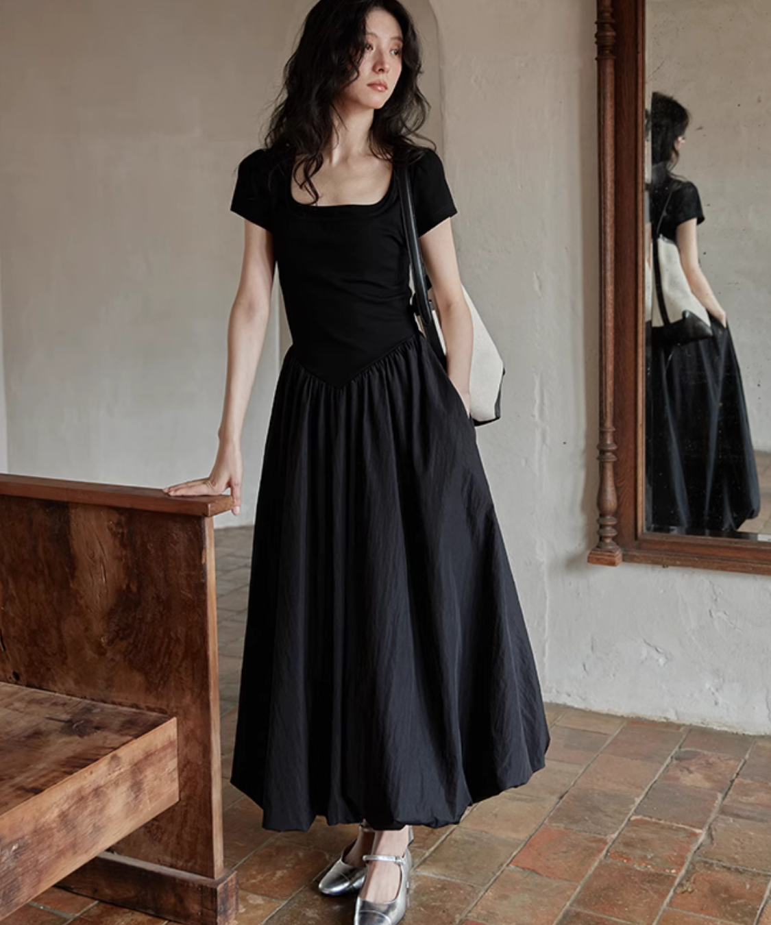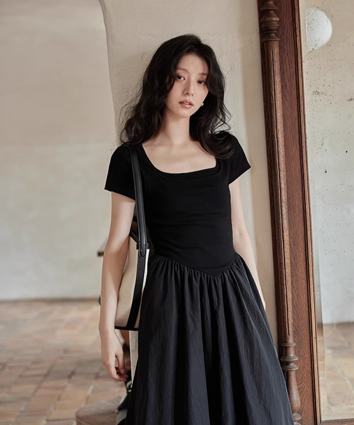 トップスはフィット感のあるカットソー、スカートは立体的なバルーンシルエットの異素材ミックスワンピースです。