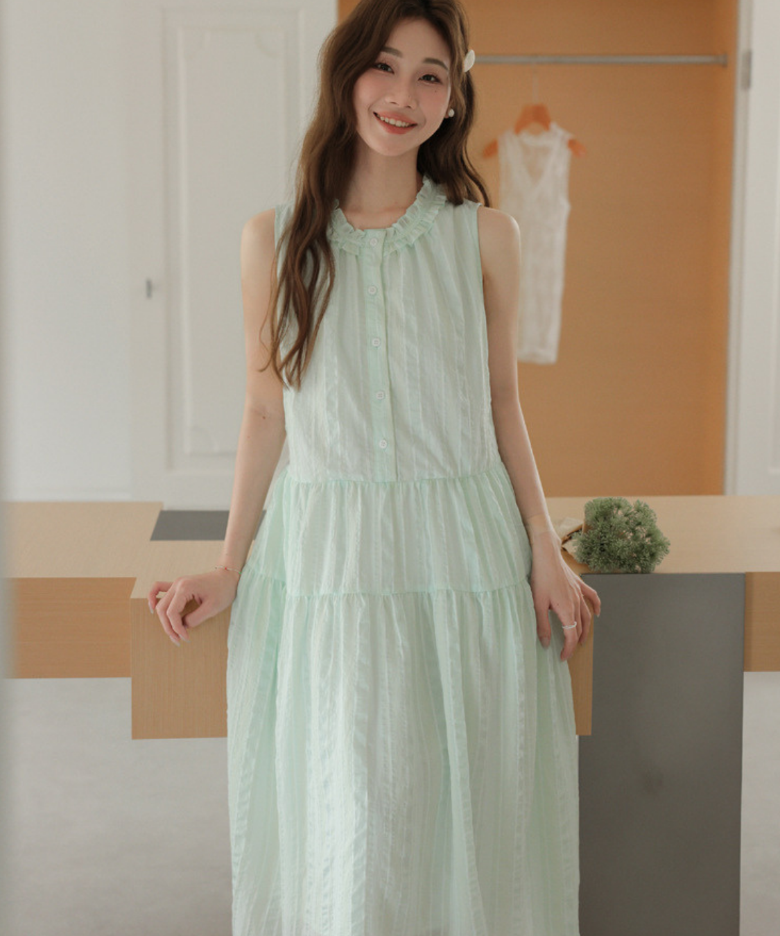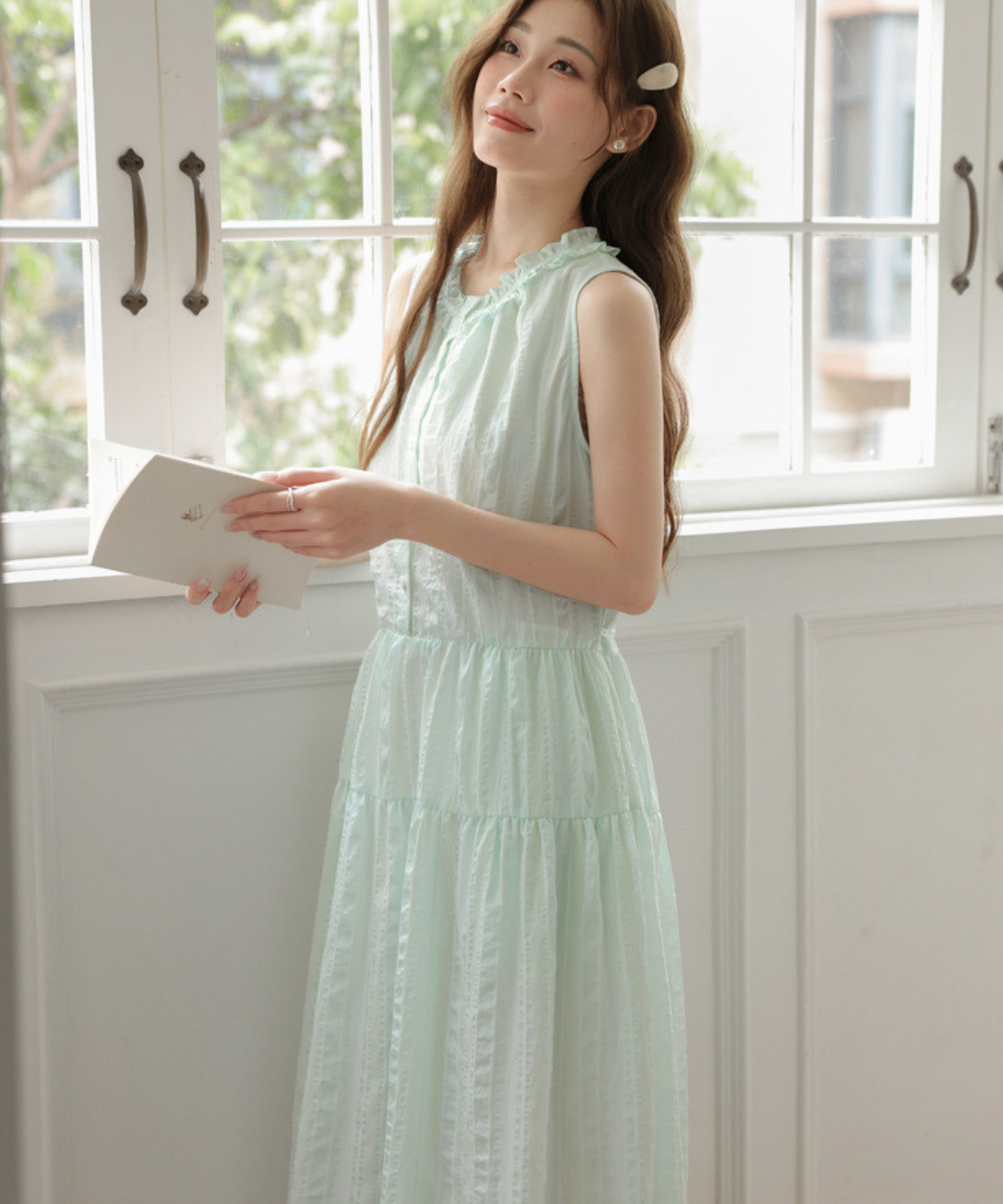 繊細なフリルカラーが上品フェミニンな印象を与えるワンピースです。