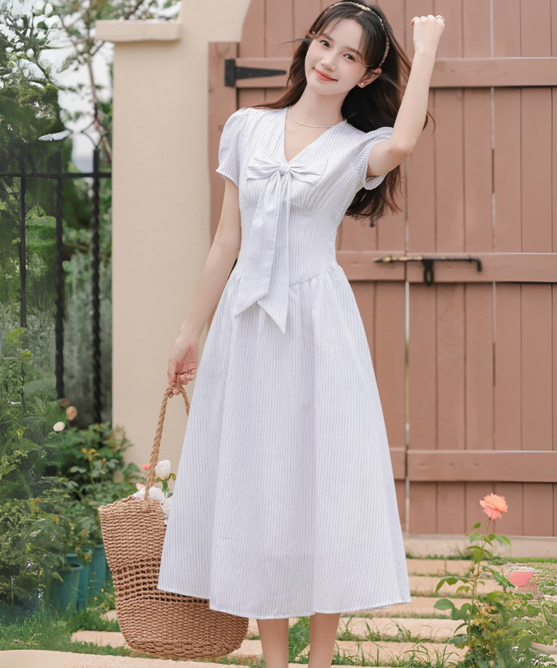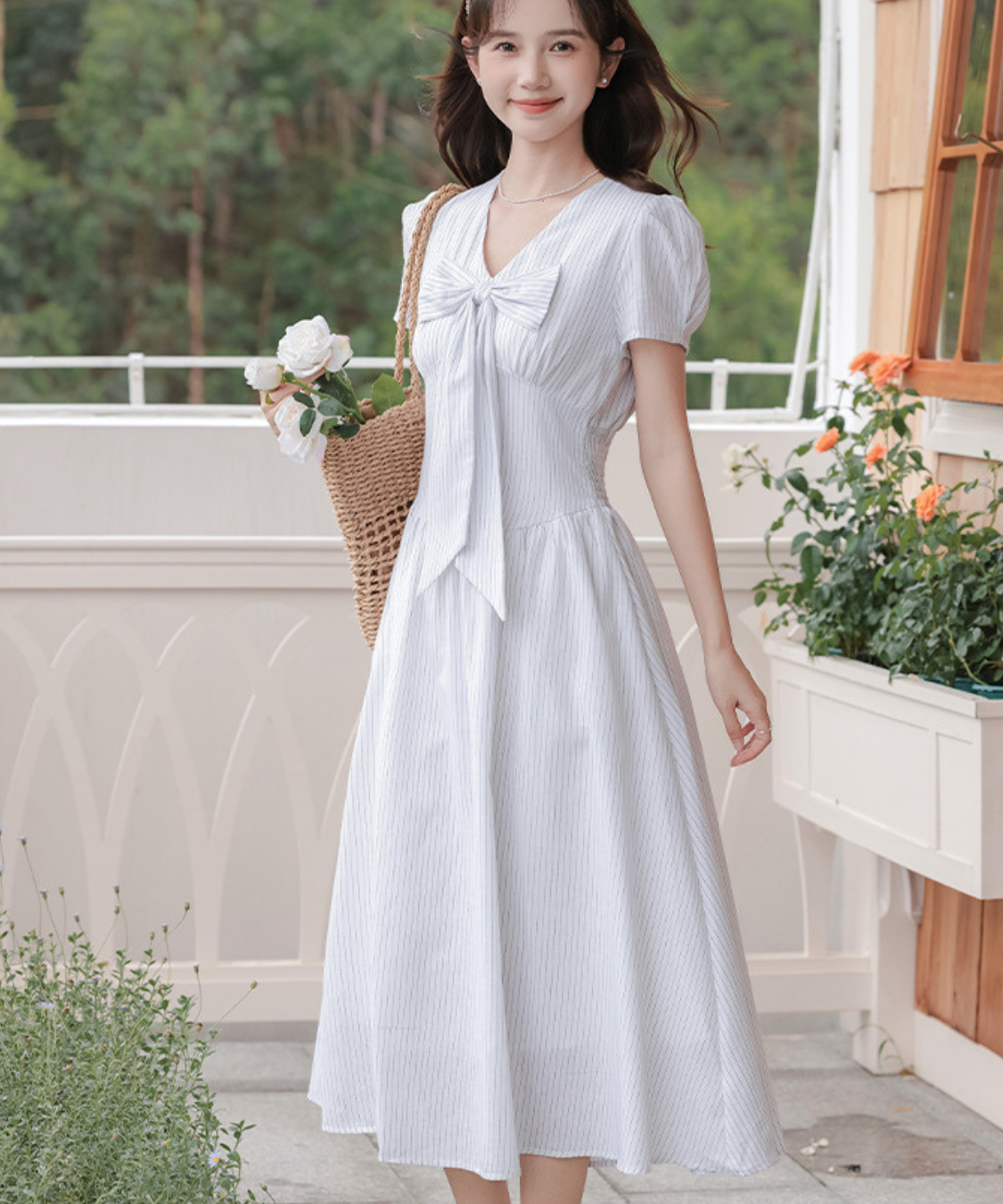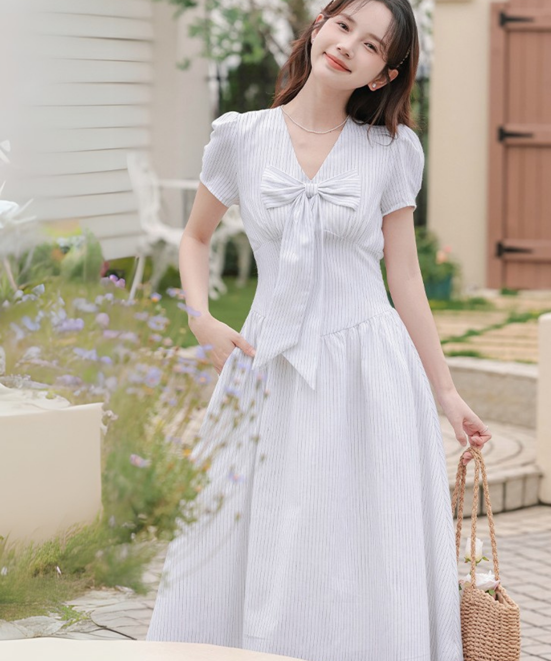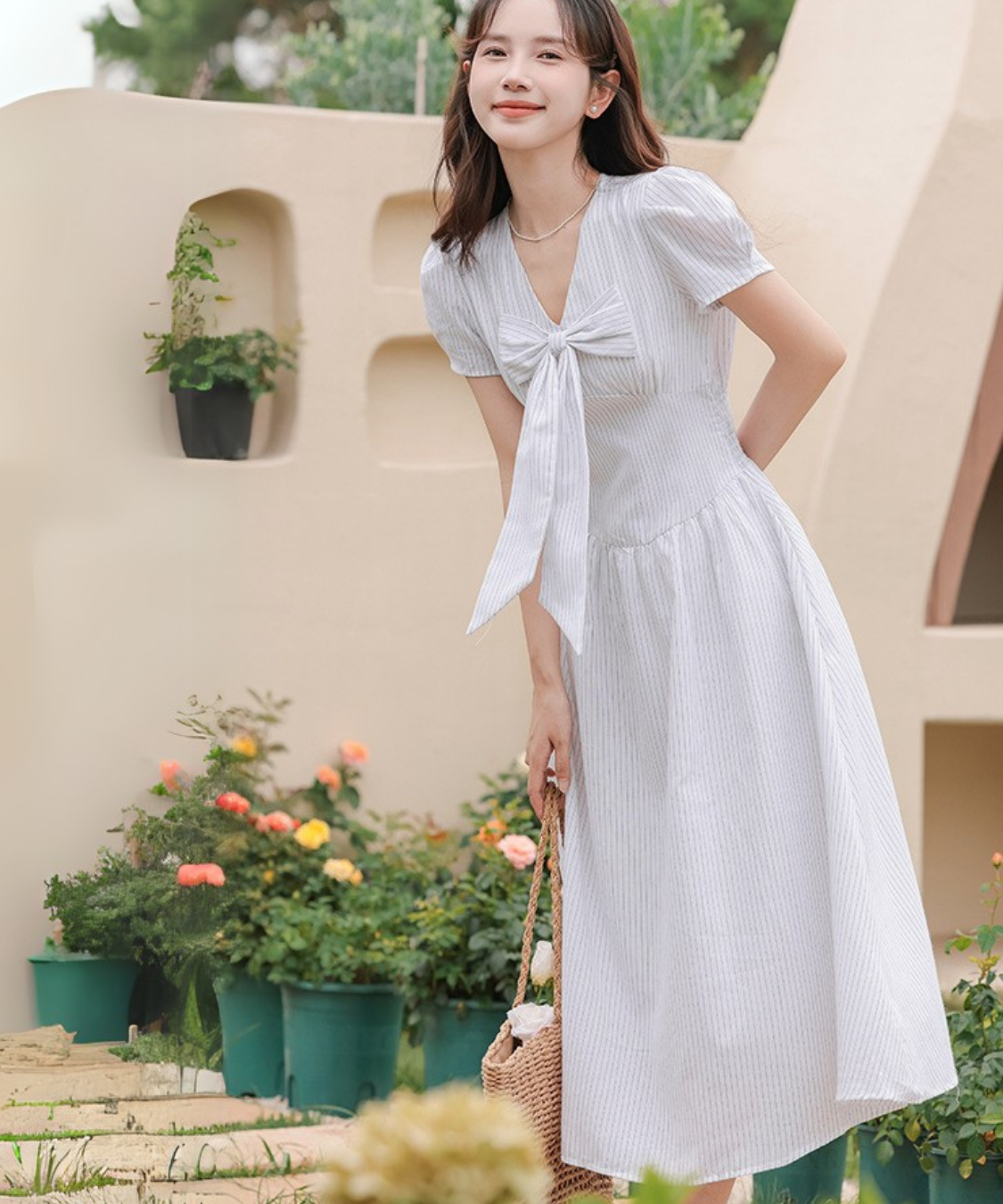 すっきりとしたVネックに、大きめリボンが目を引くフェミニンなワンピースです。