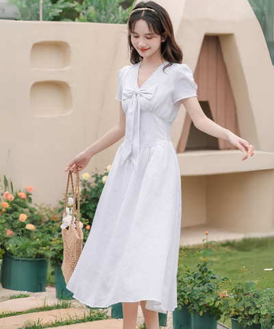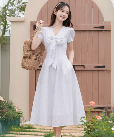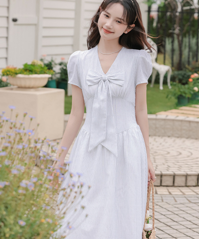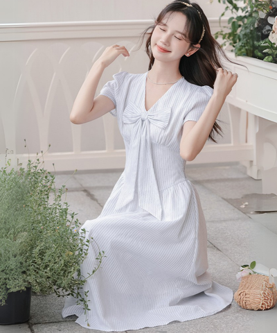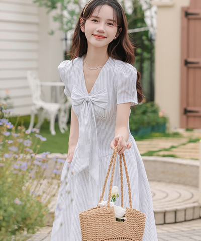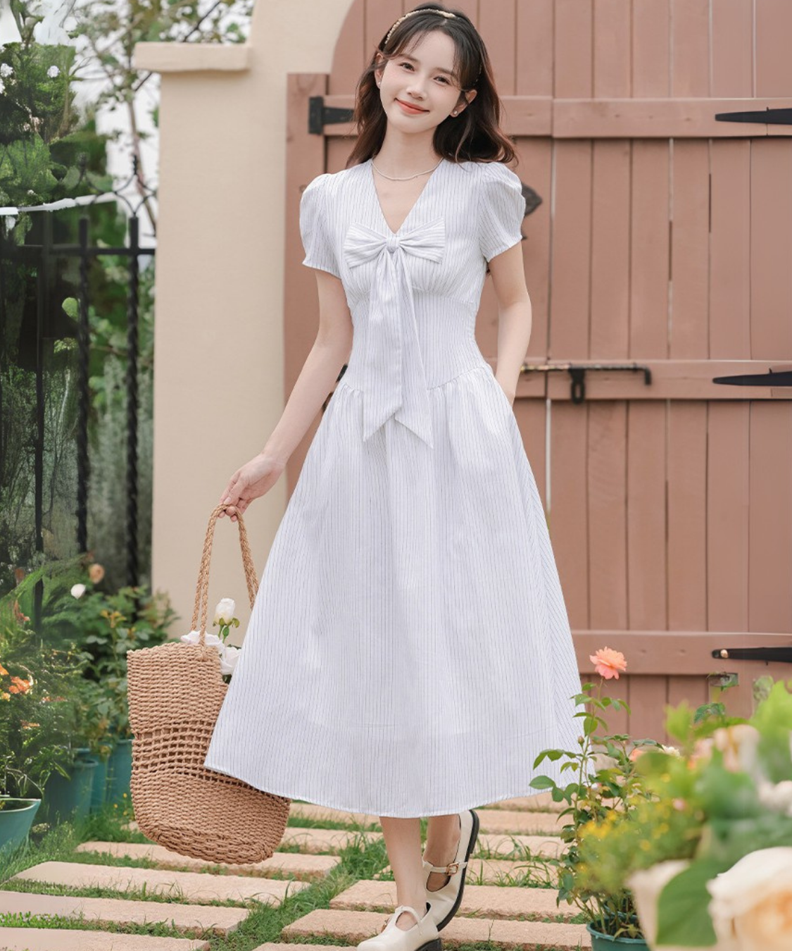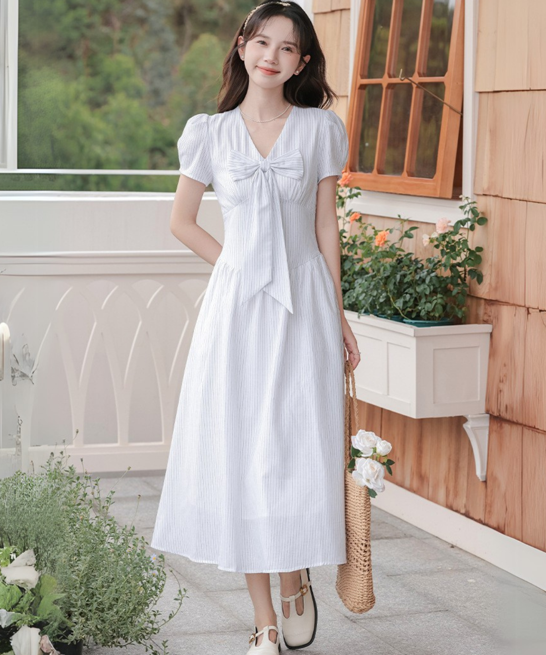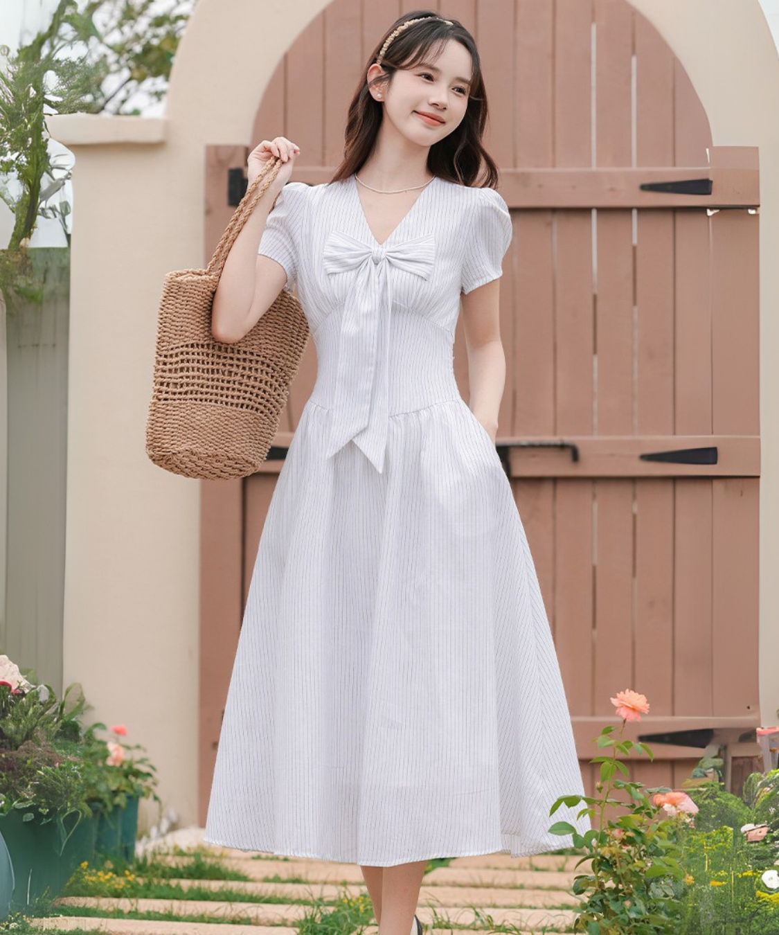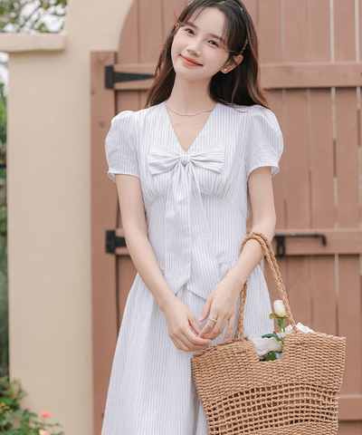 すっきりとしたVネックに、大きめリボンが目を引くフェミニンなワンピースです。