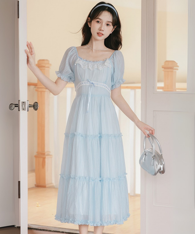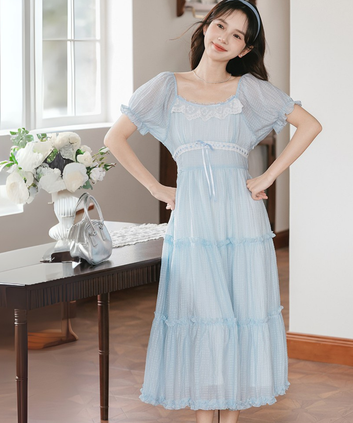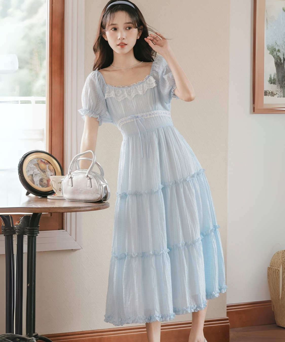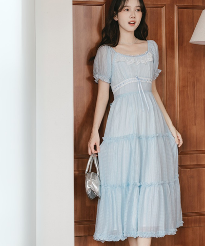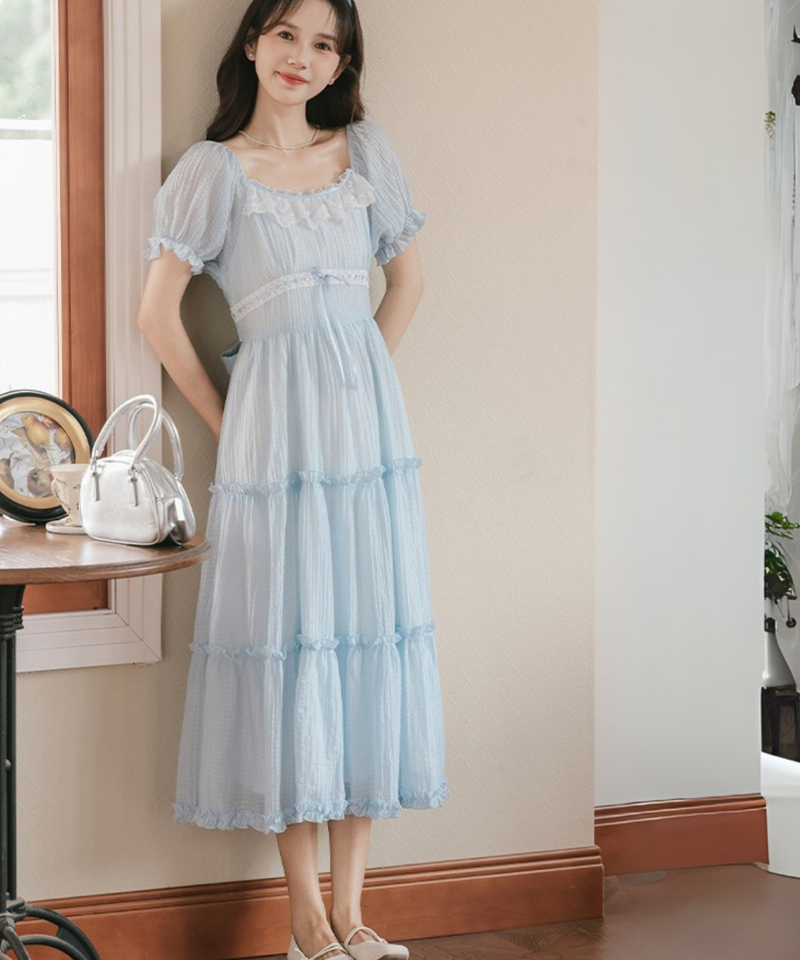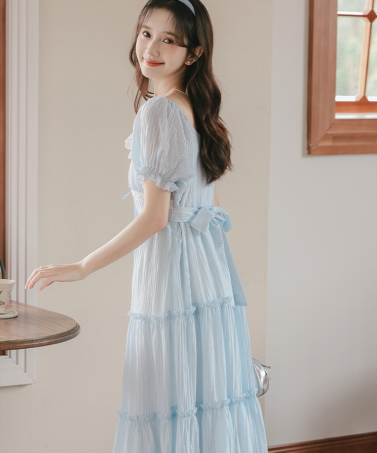 ウエストバックリボン付きパフスリーブティアードワンピース