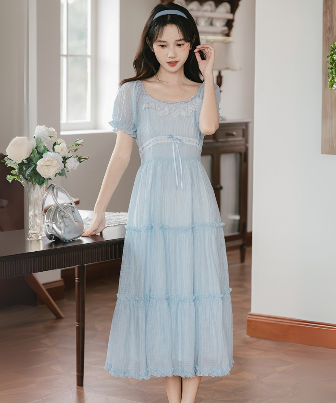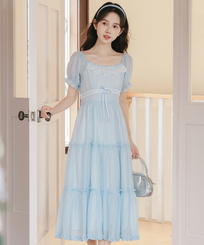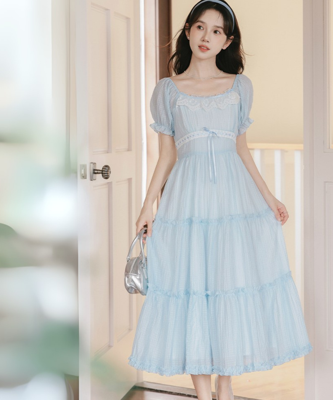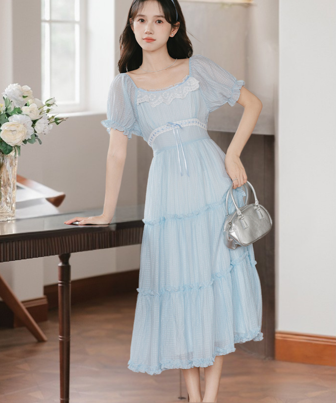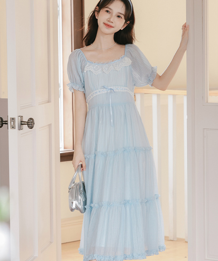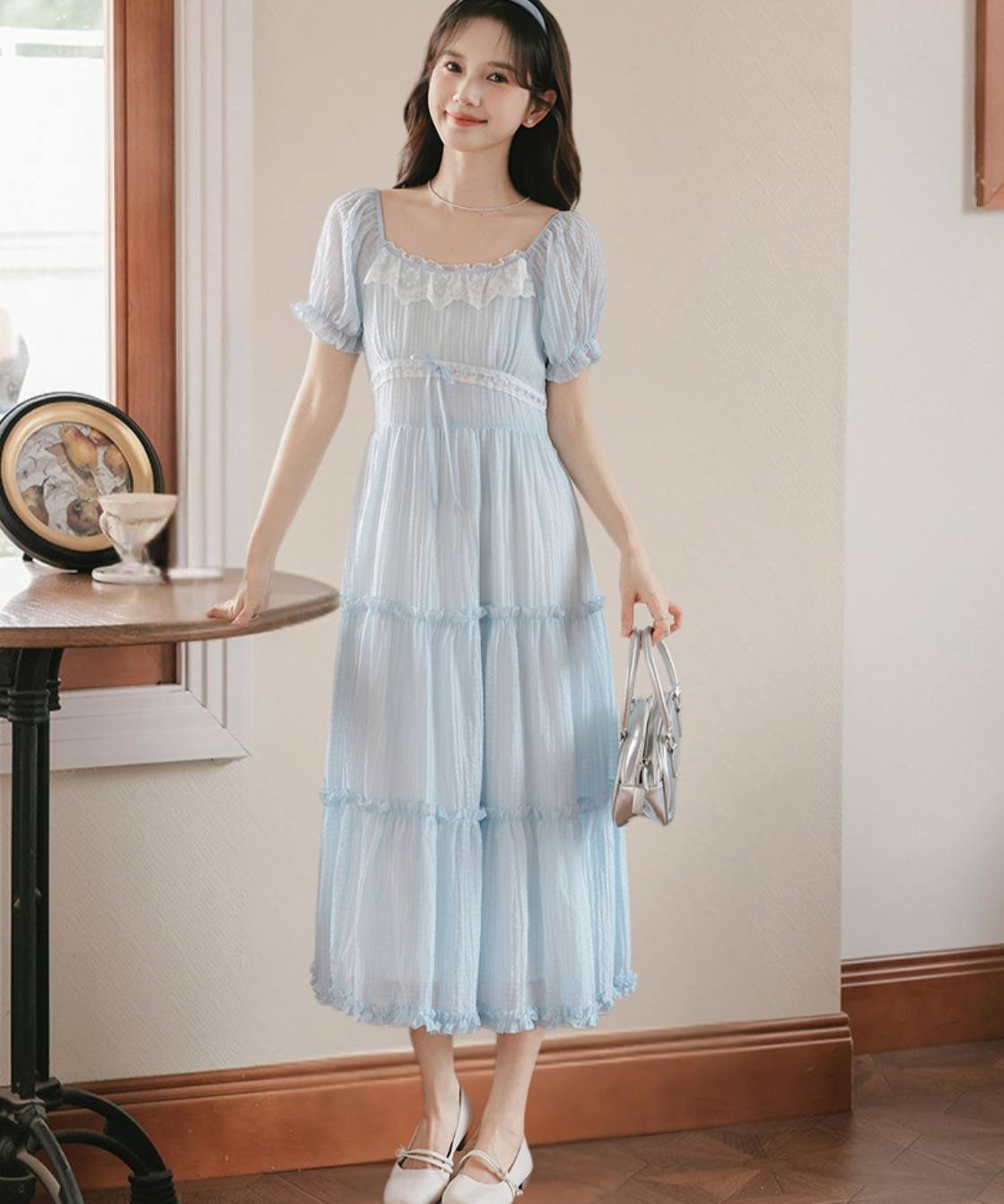 ウエストバックリボン付きパフスリーブティアードワンピース