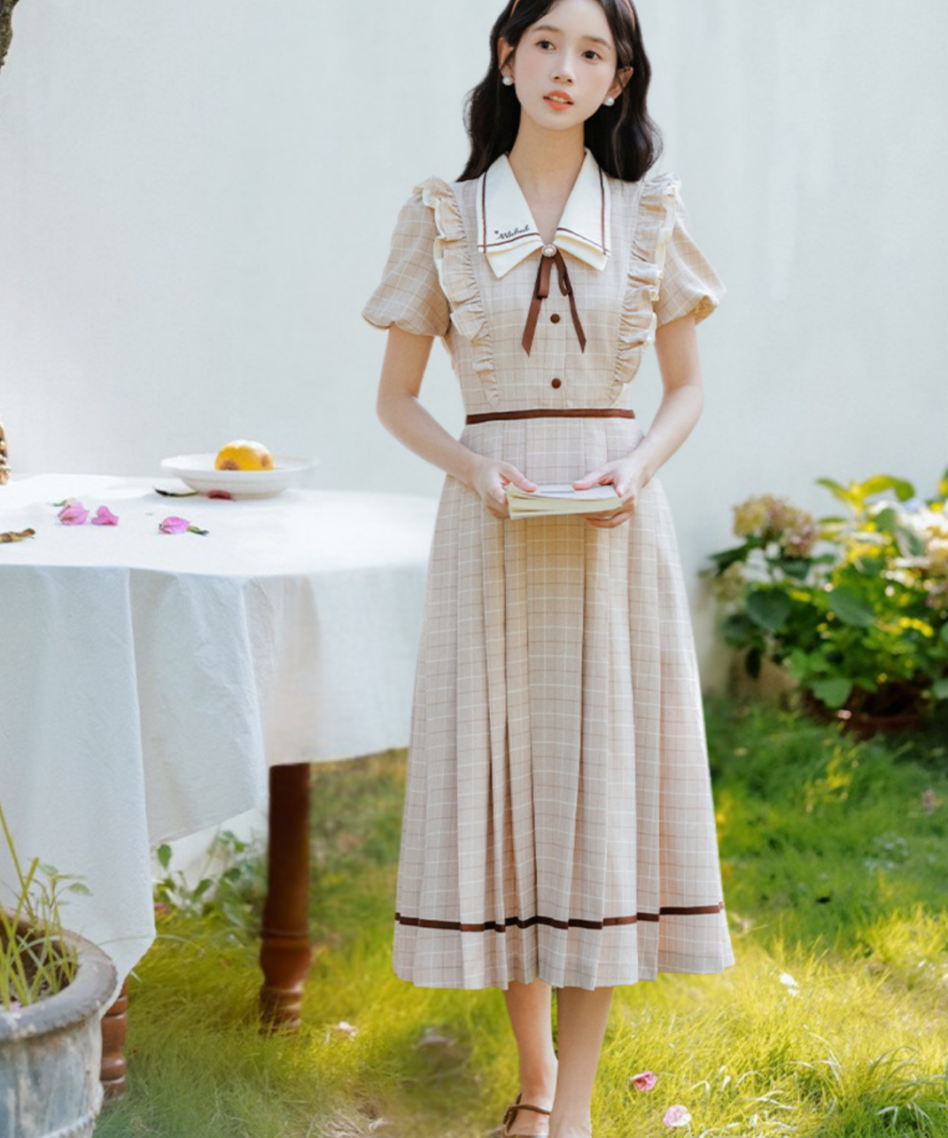 ストライプ柄パフスリーブフラワーモチーフワンピース