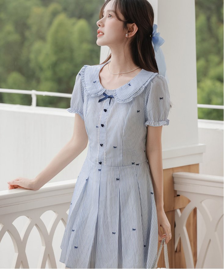 フリル付きの大きめ襟が愛らしい印象を引き立てるワンピースです。