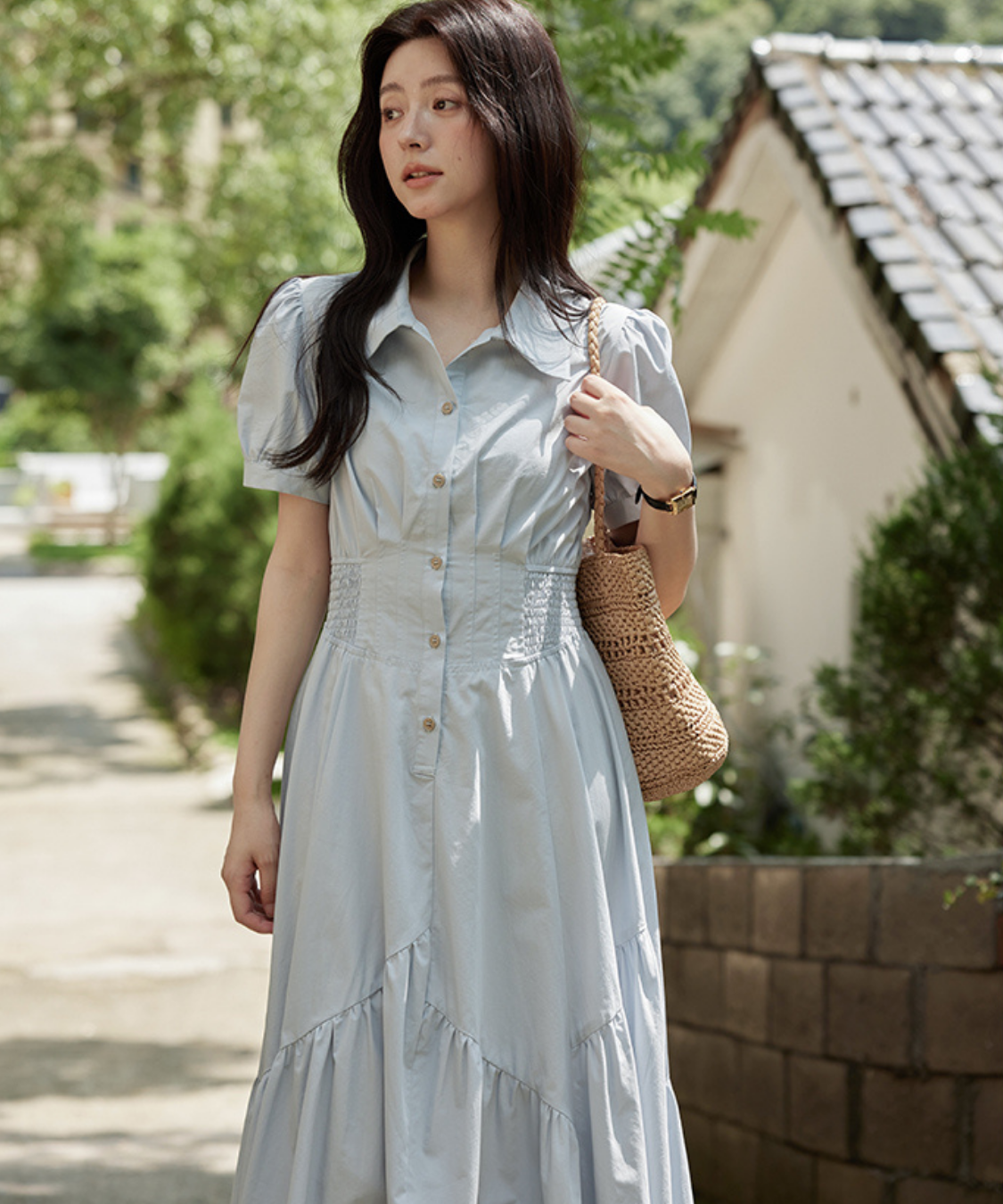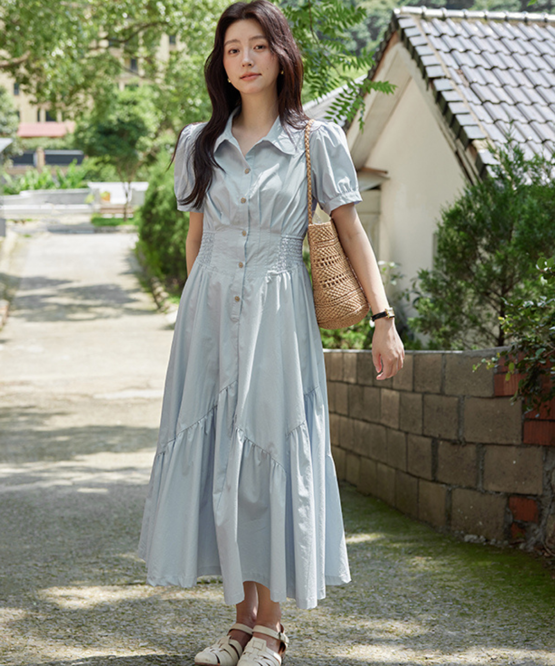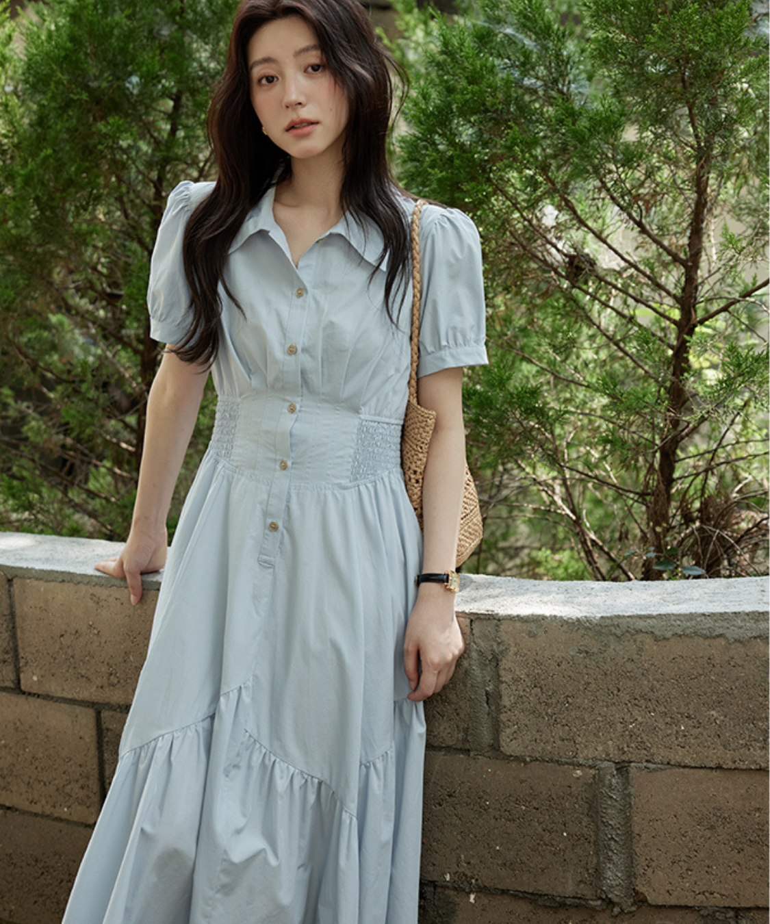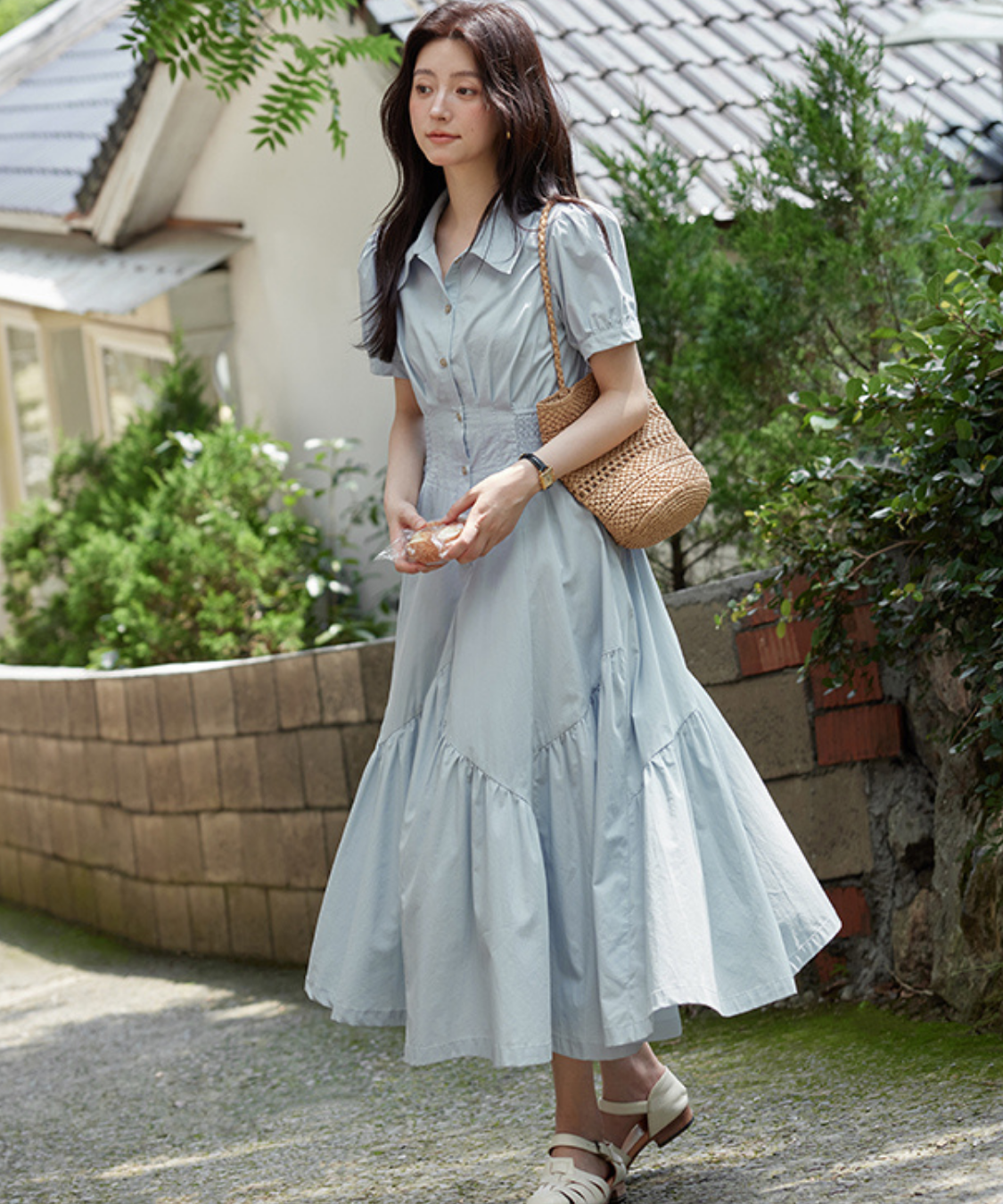 ウエストのシャーリングがポイントのクラシカルなシャツワンピースです。