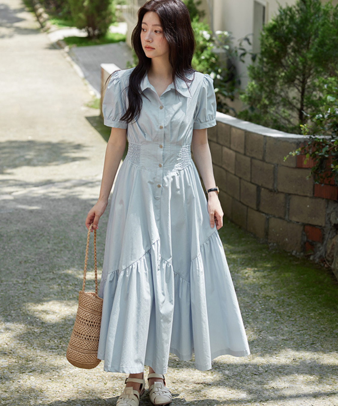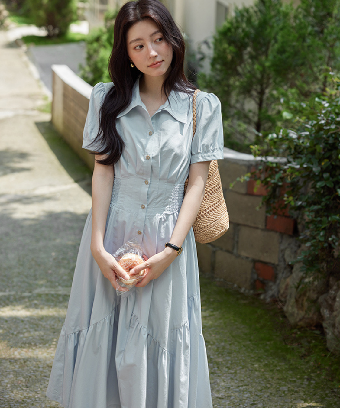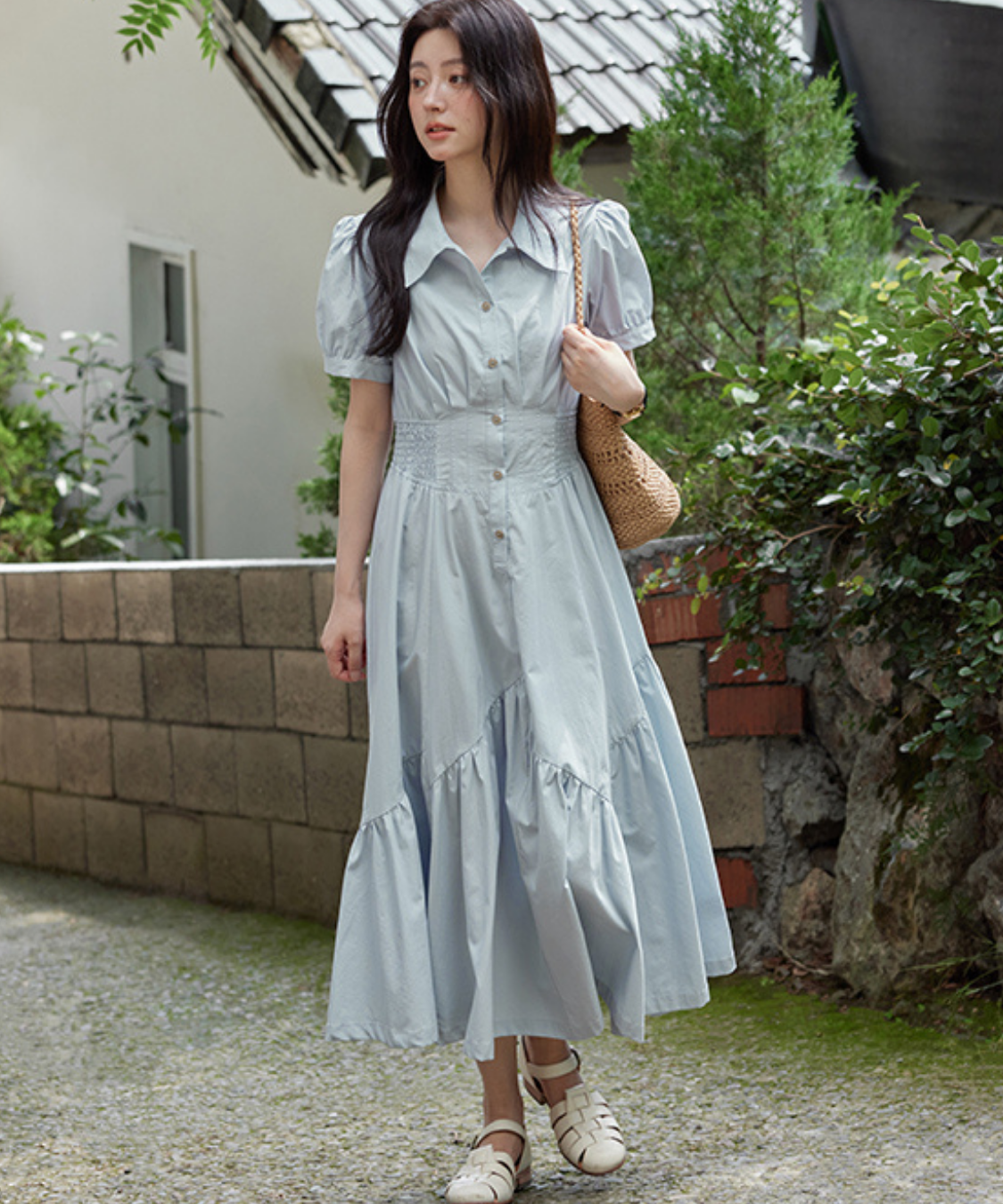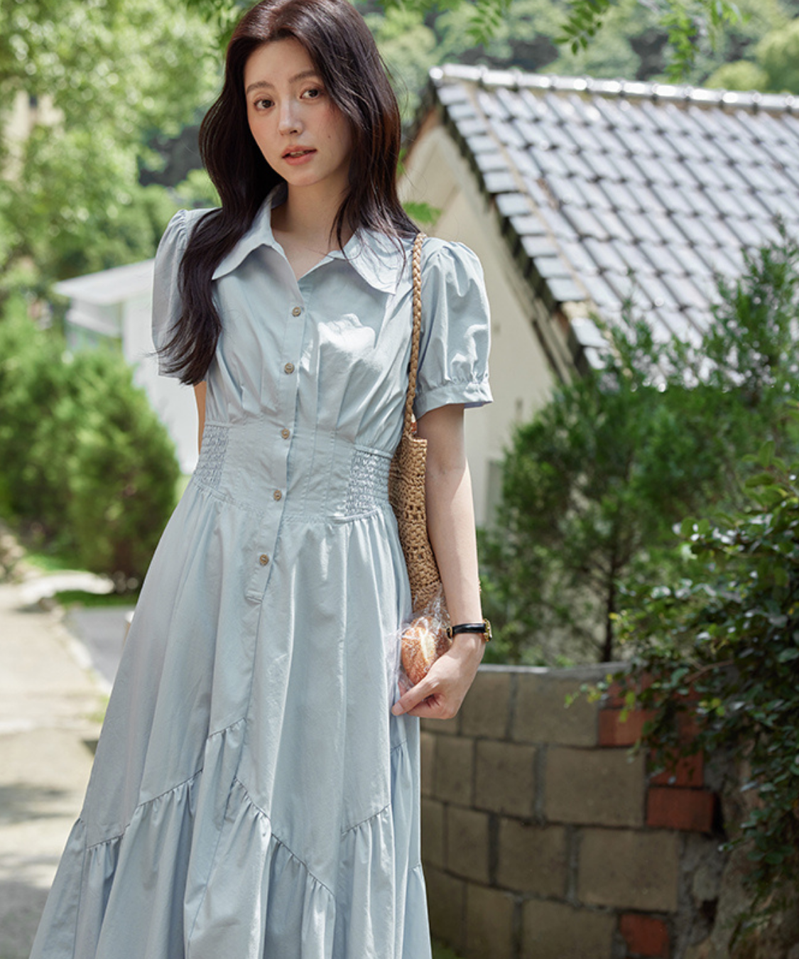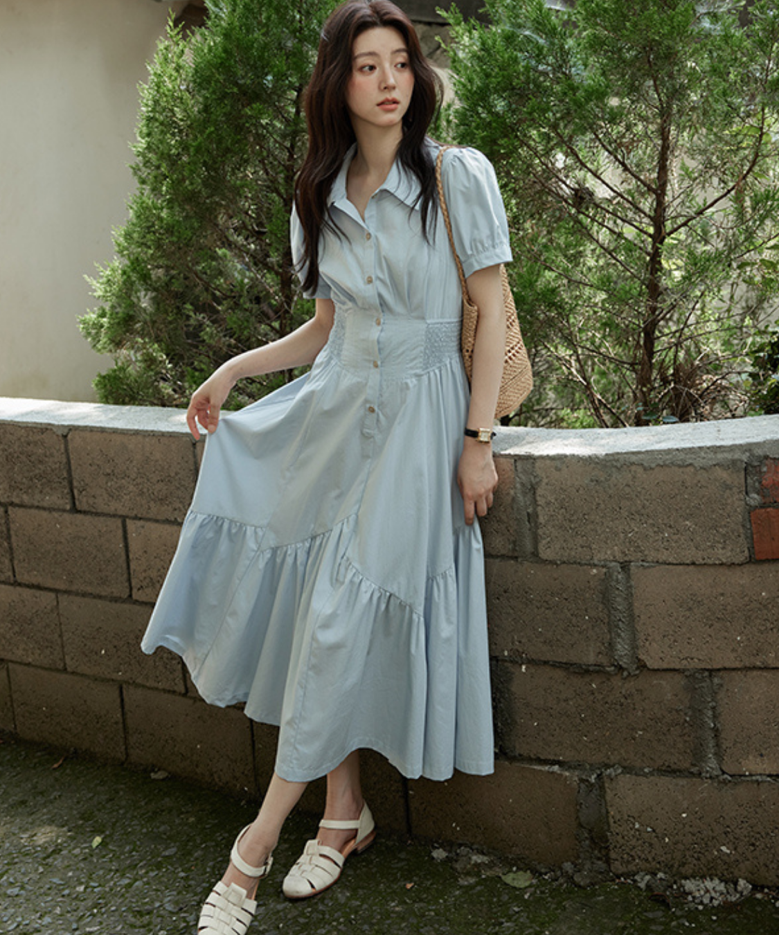 ウエストのシャーリングがポイントのクラシカルなシャツワンピースです。