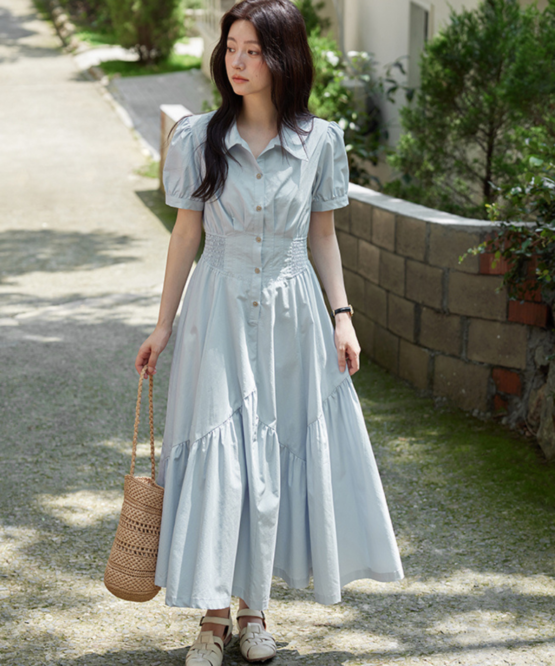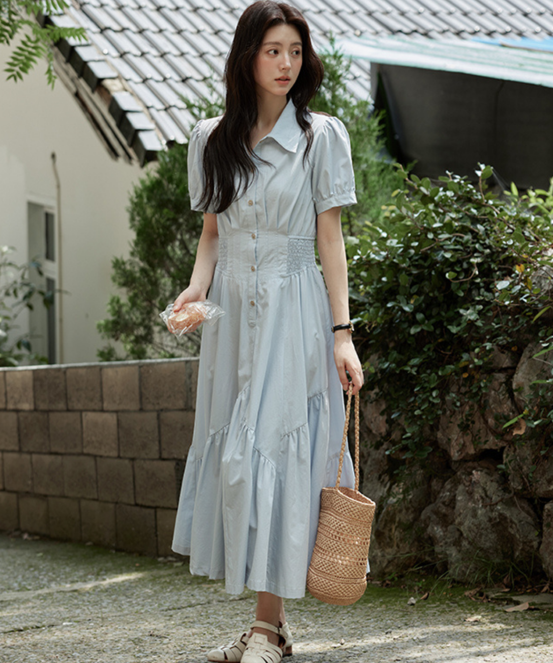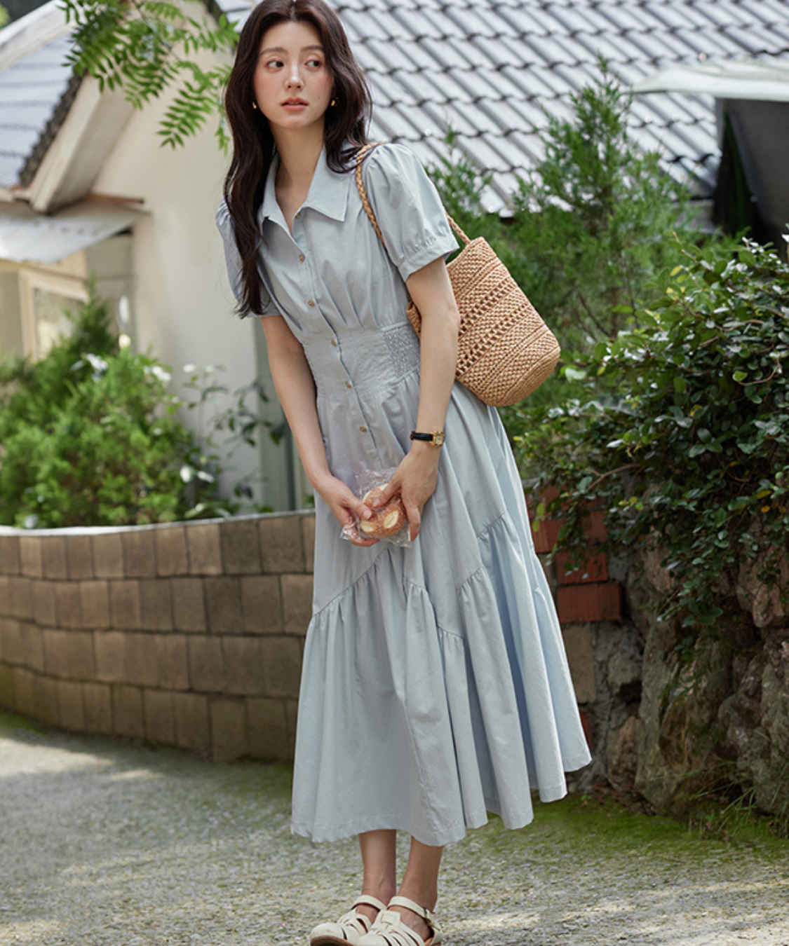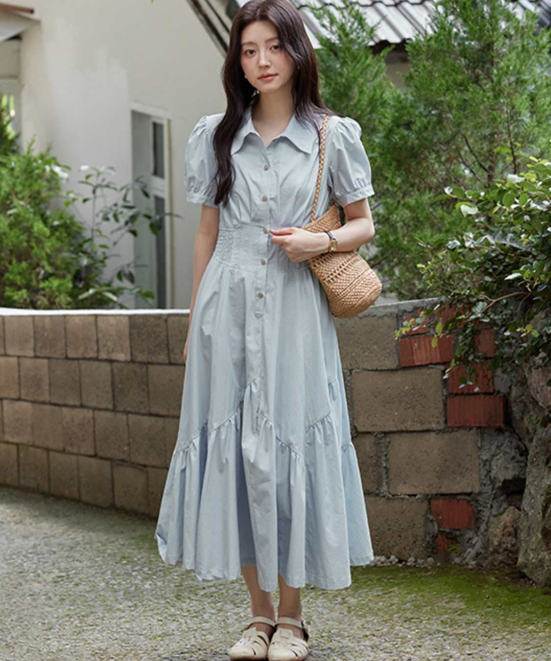 ウエストのシャーリングがポイントのクラシカルなシャツワンピースです。
