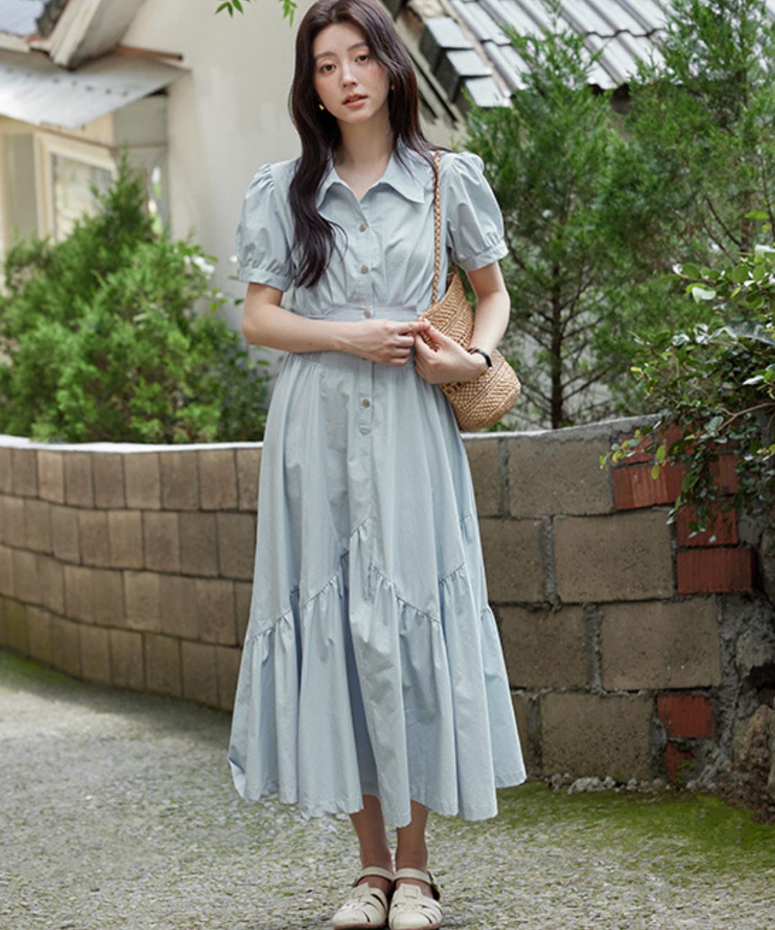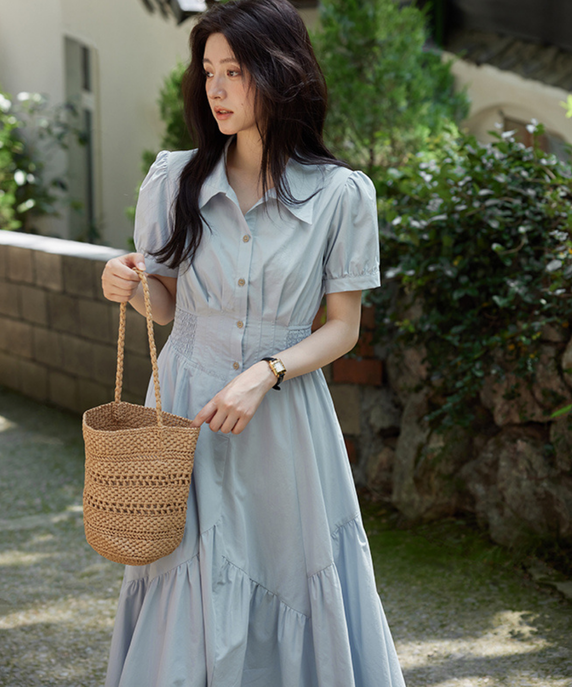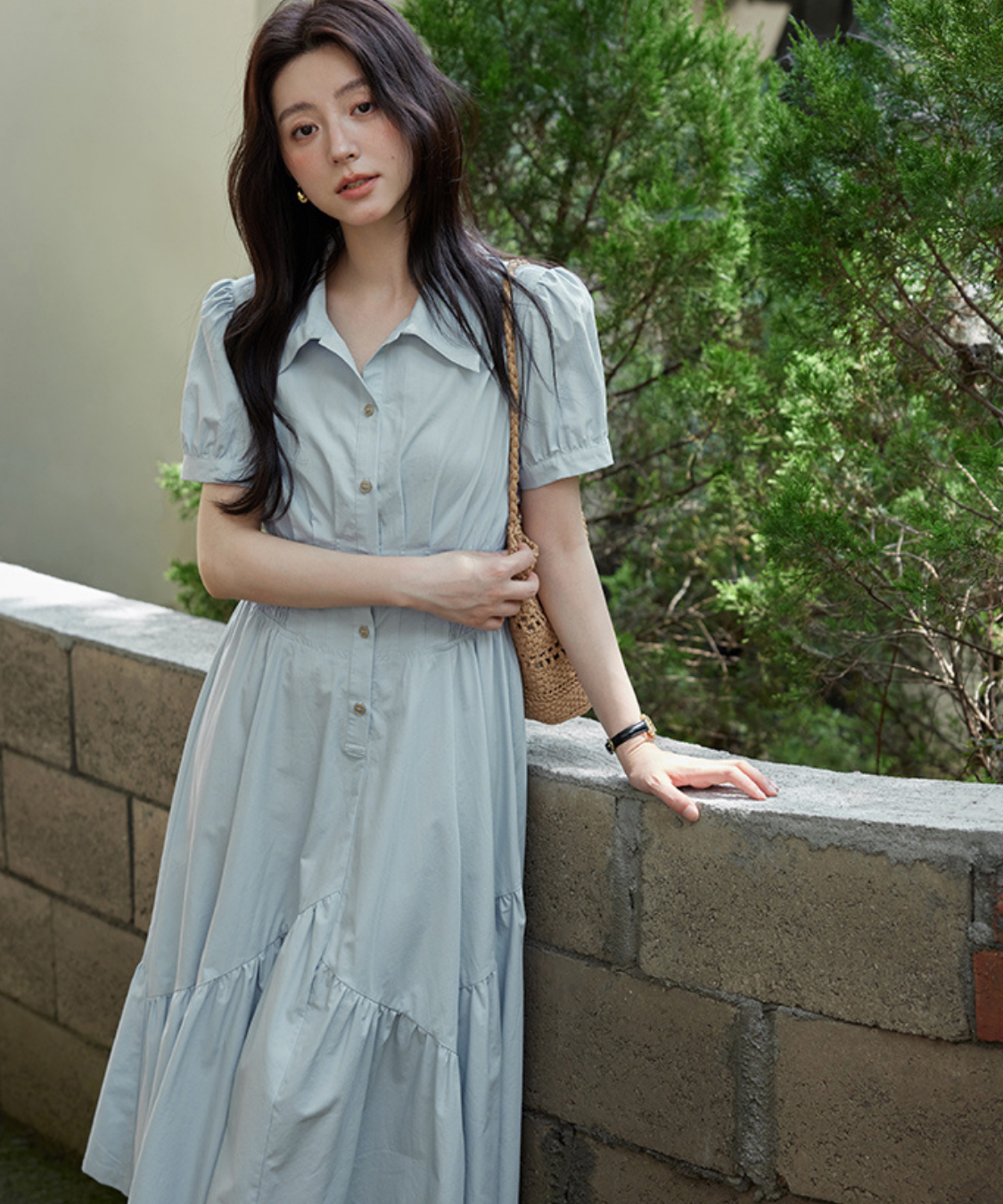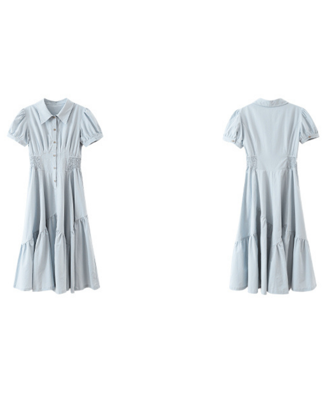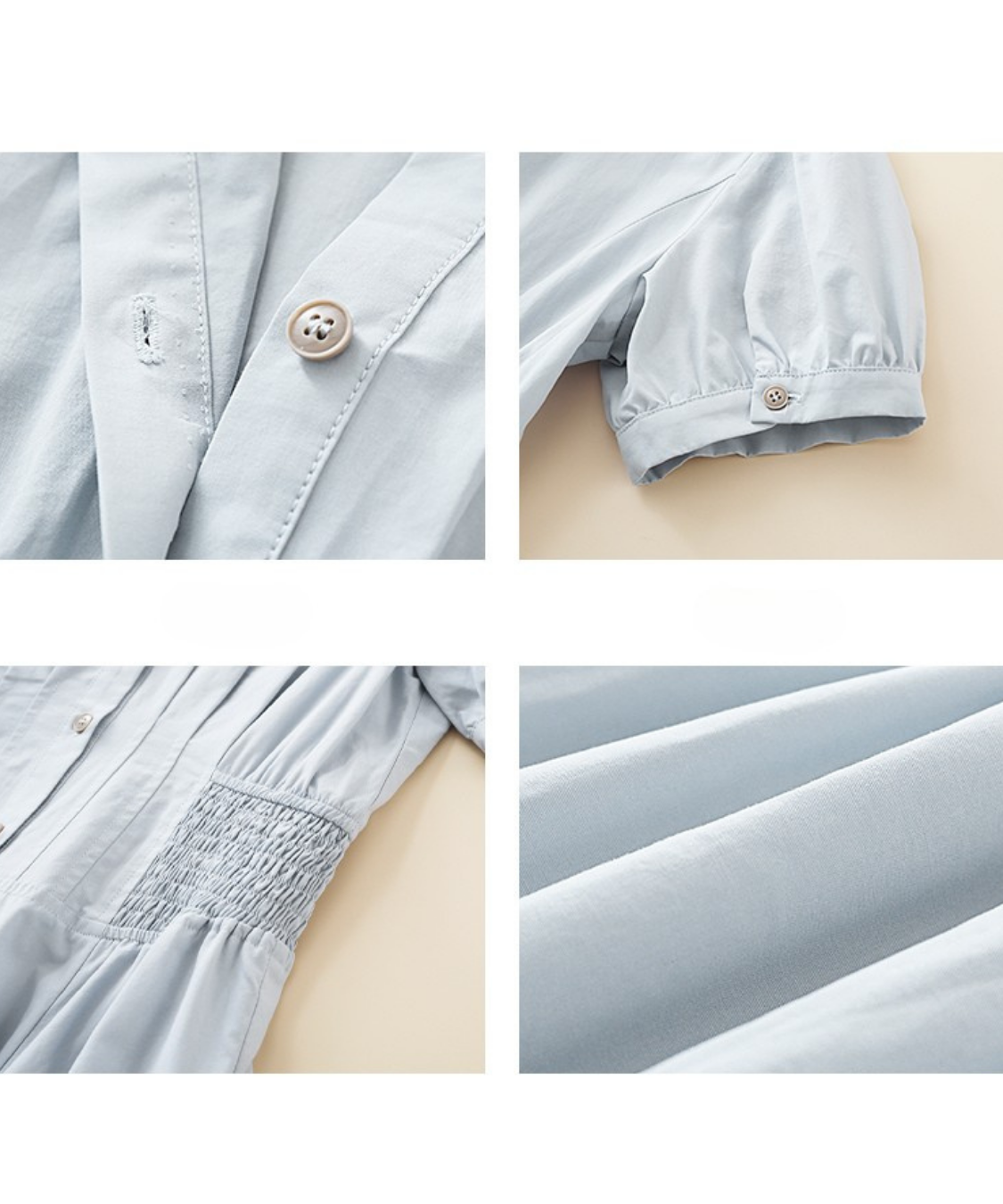 ウエストのシャーリングがポイントのクラシカルなシャツワンピースです。