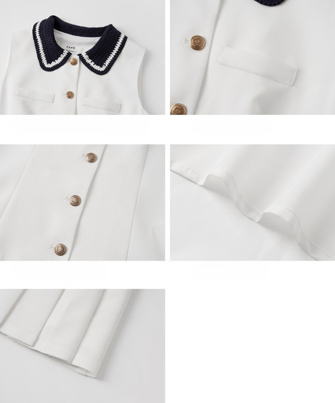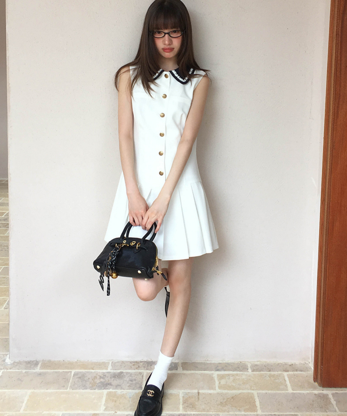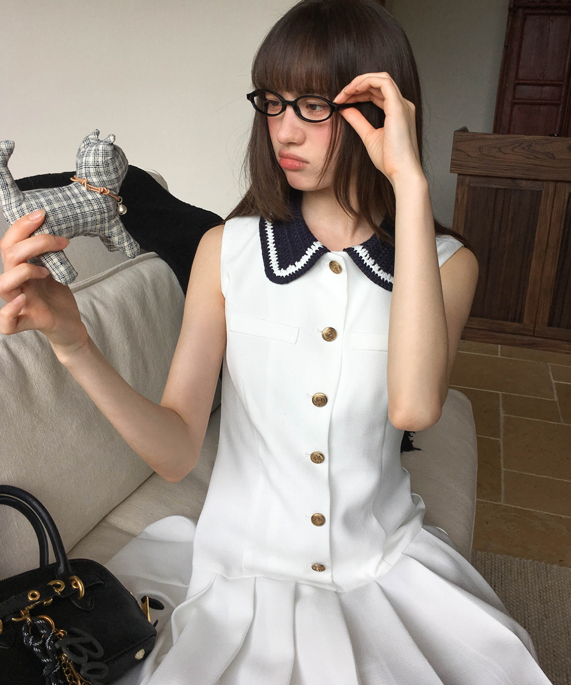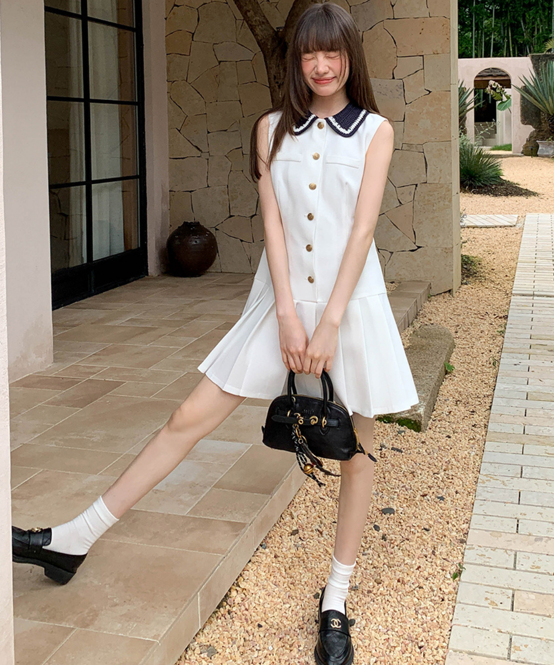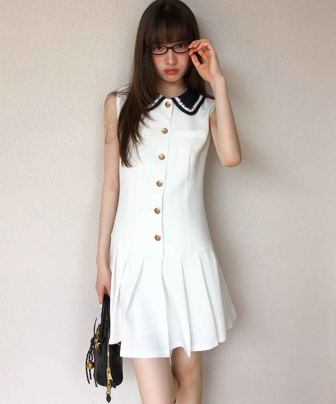 爽やかなホワイトに映える配色ニット襟が目を惹くワンピースです。