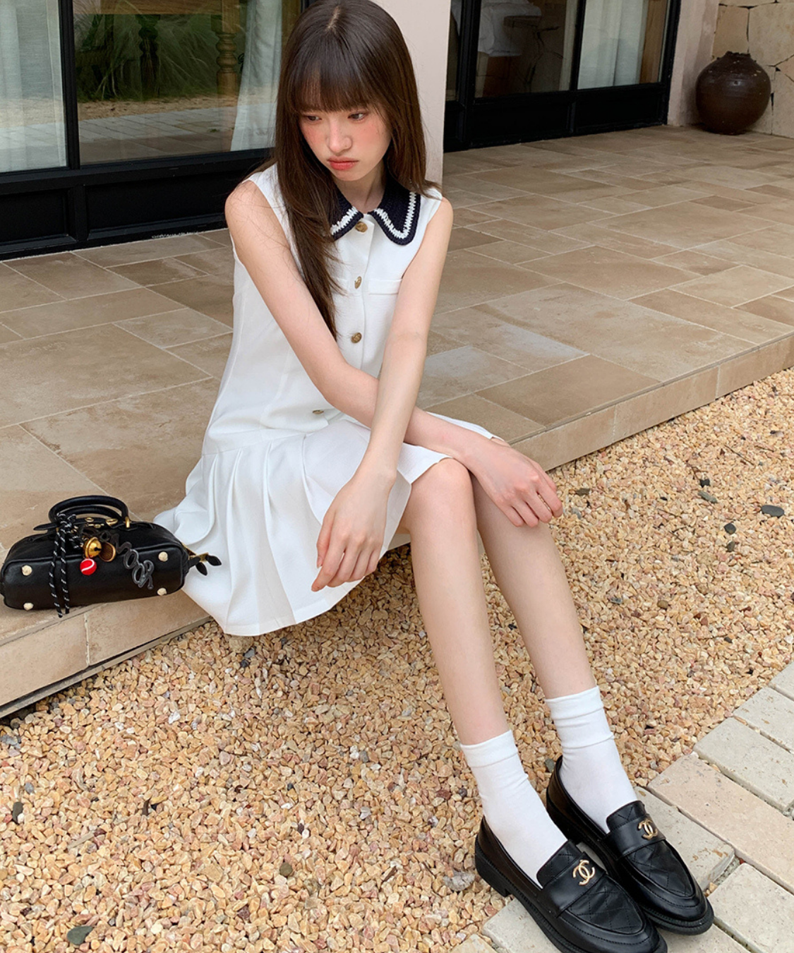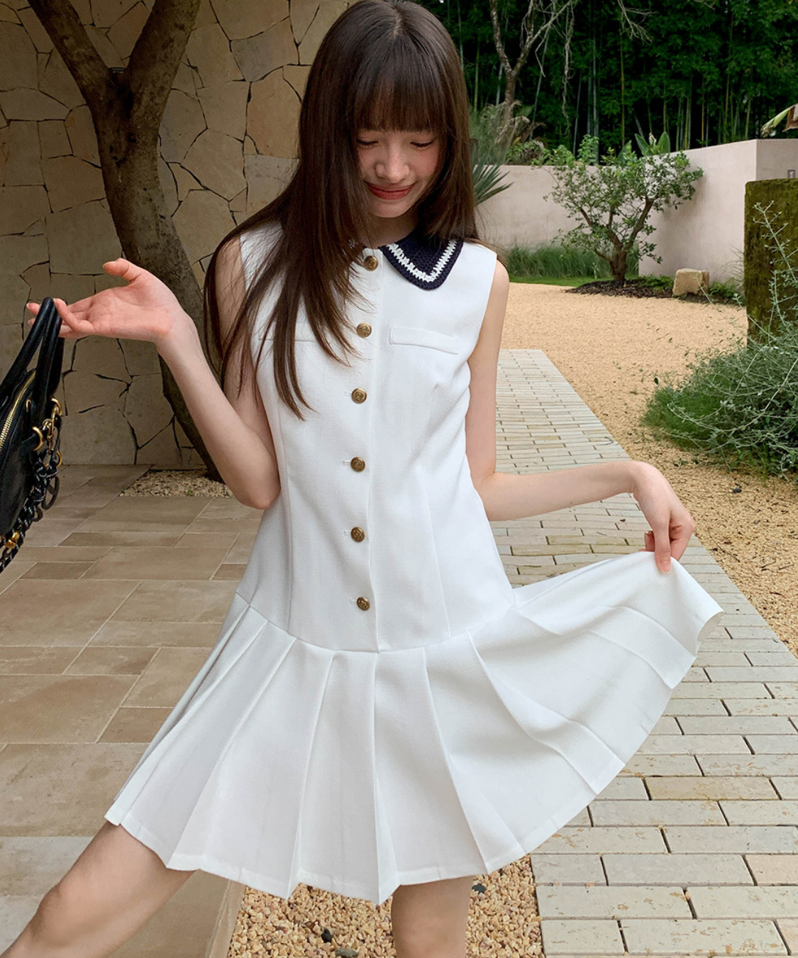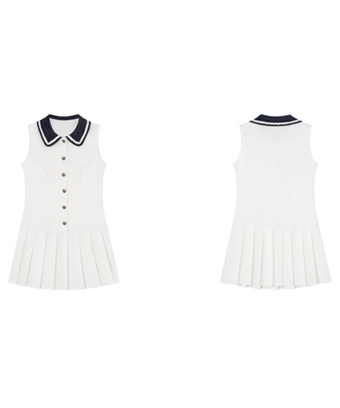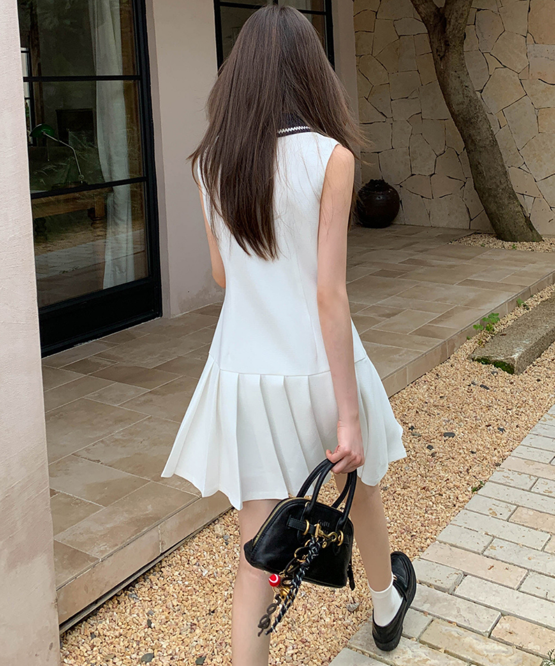 配色ニット襟ボックスプリーツノースリーブワンピース