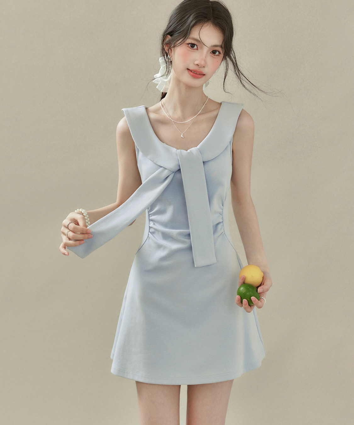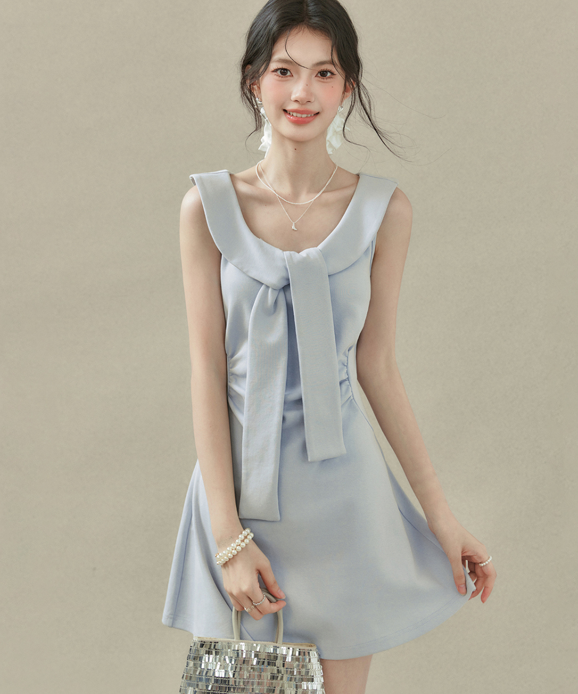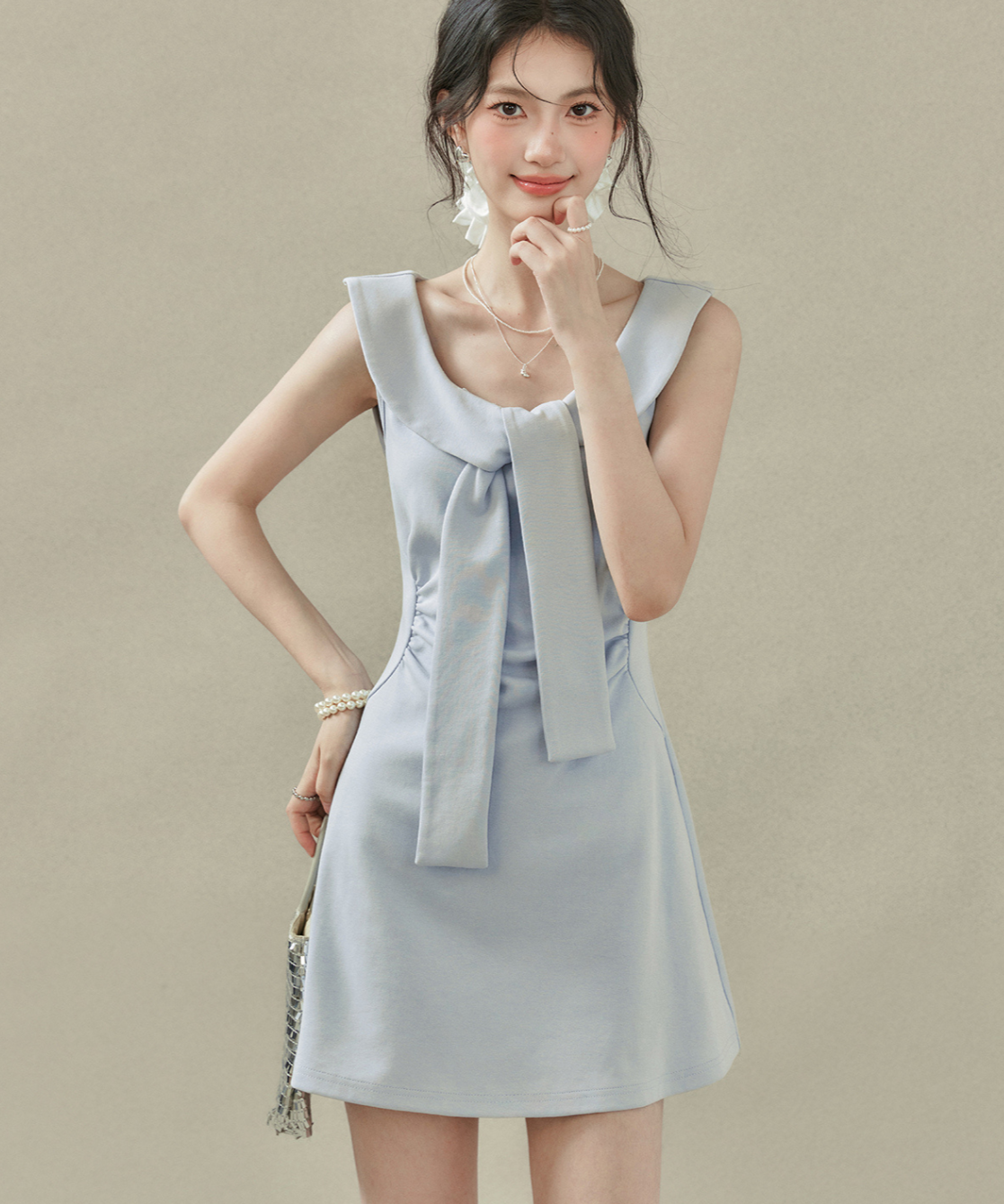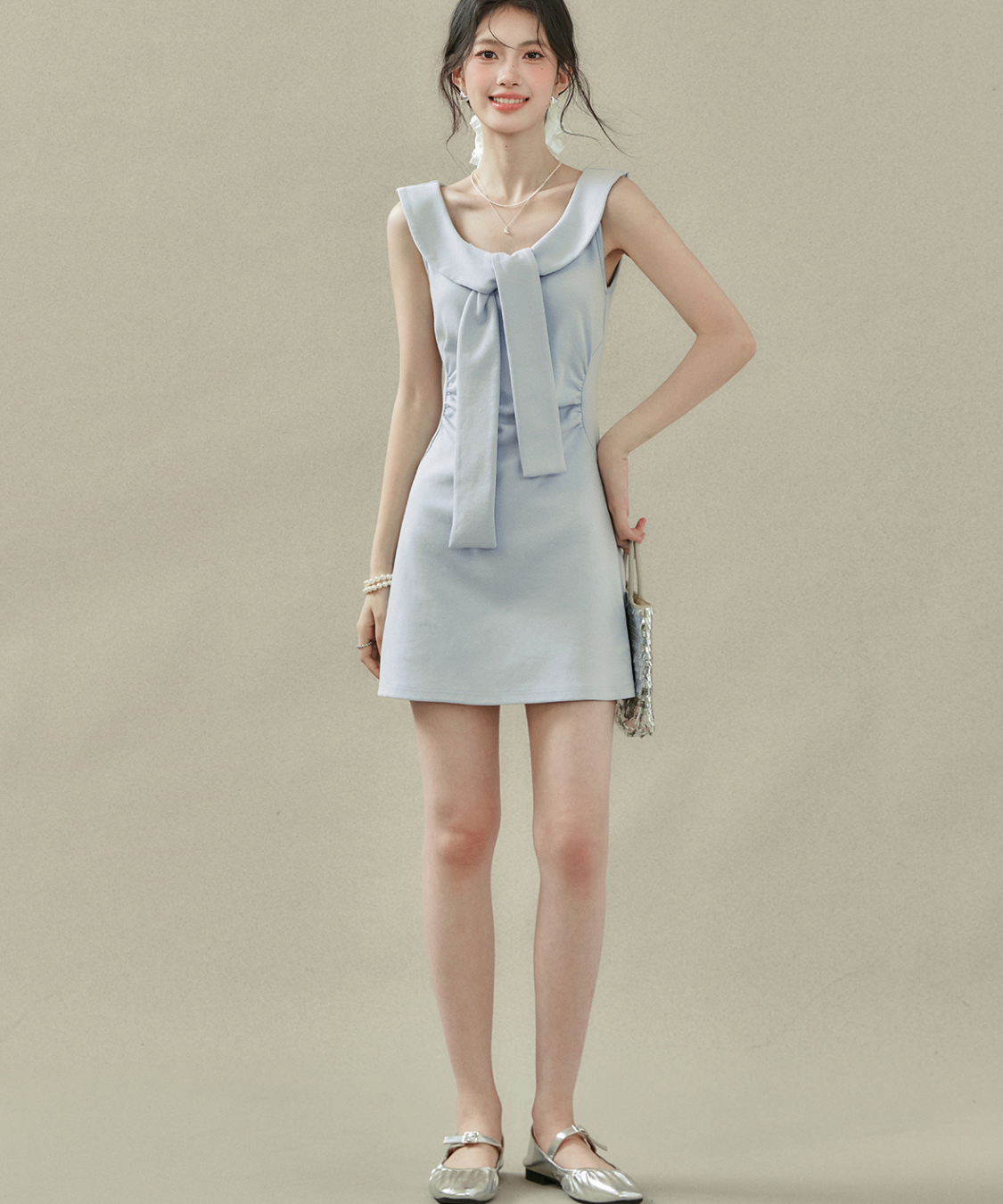 フラットカラービッグリボンノースリーブワンピース
