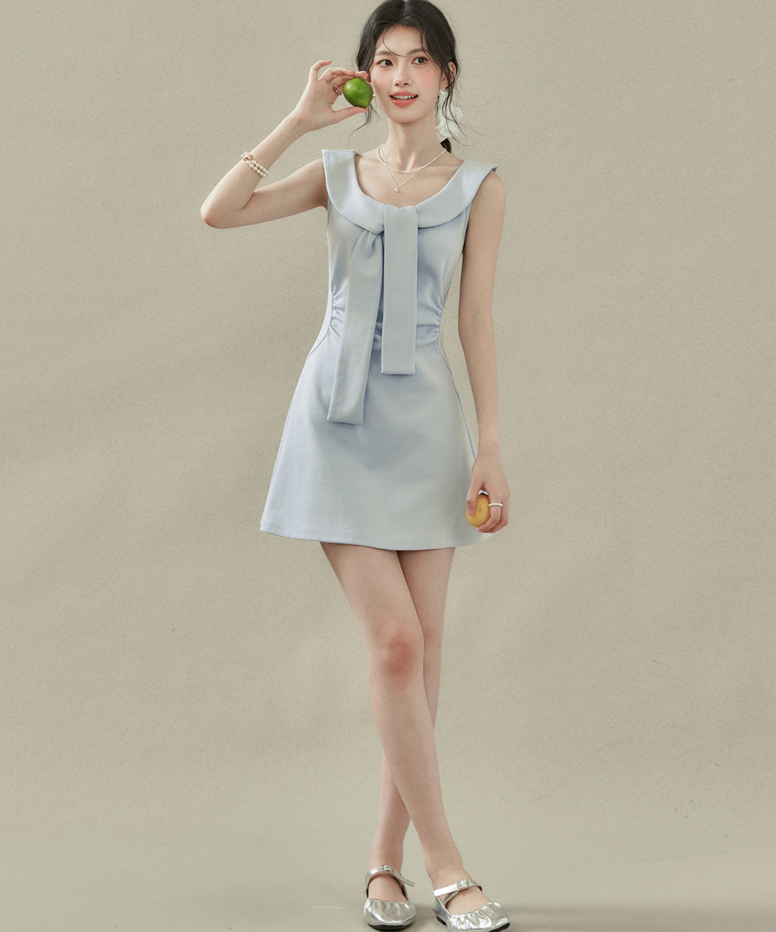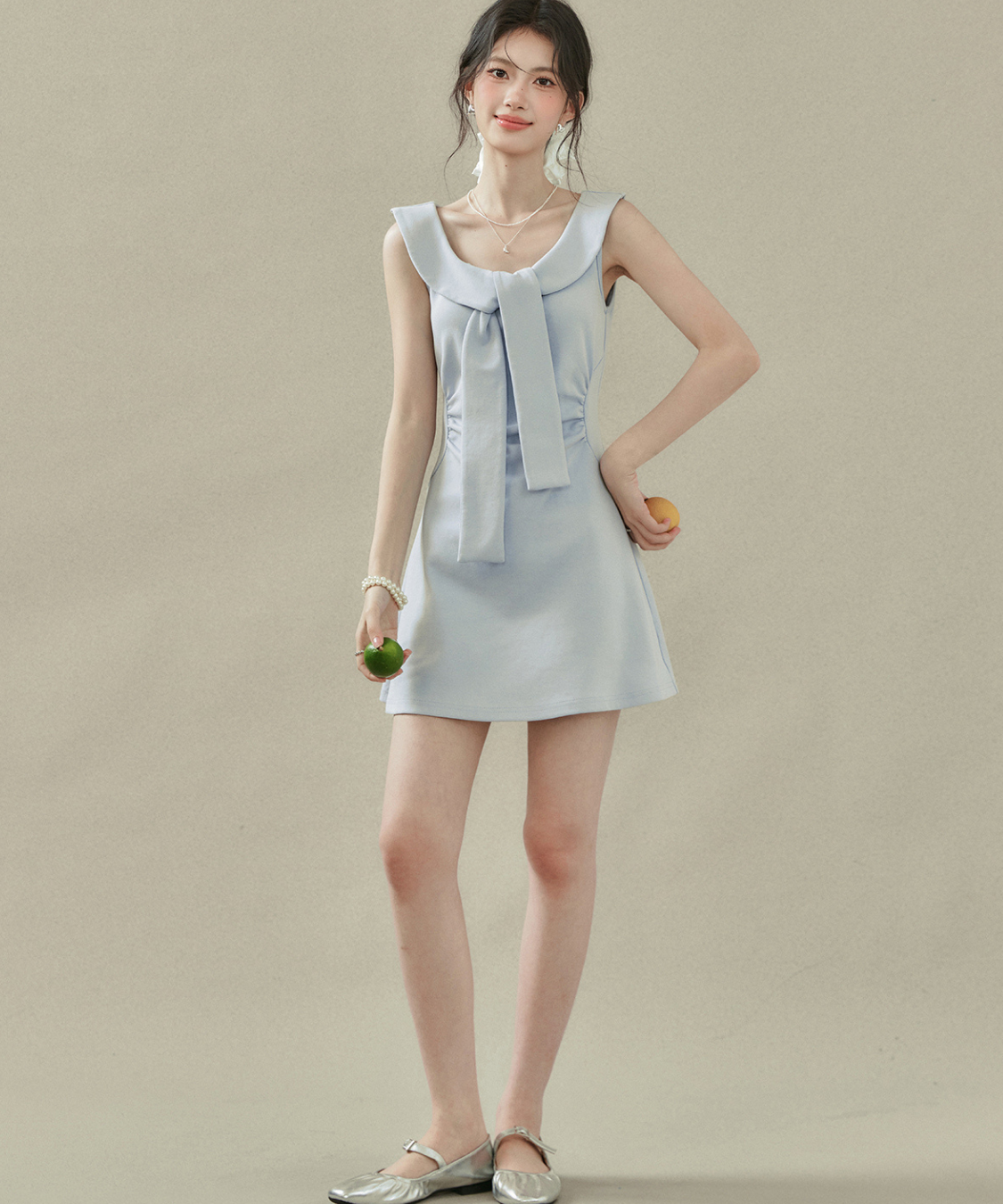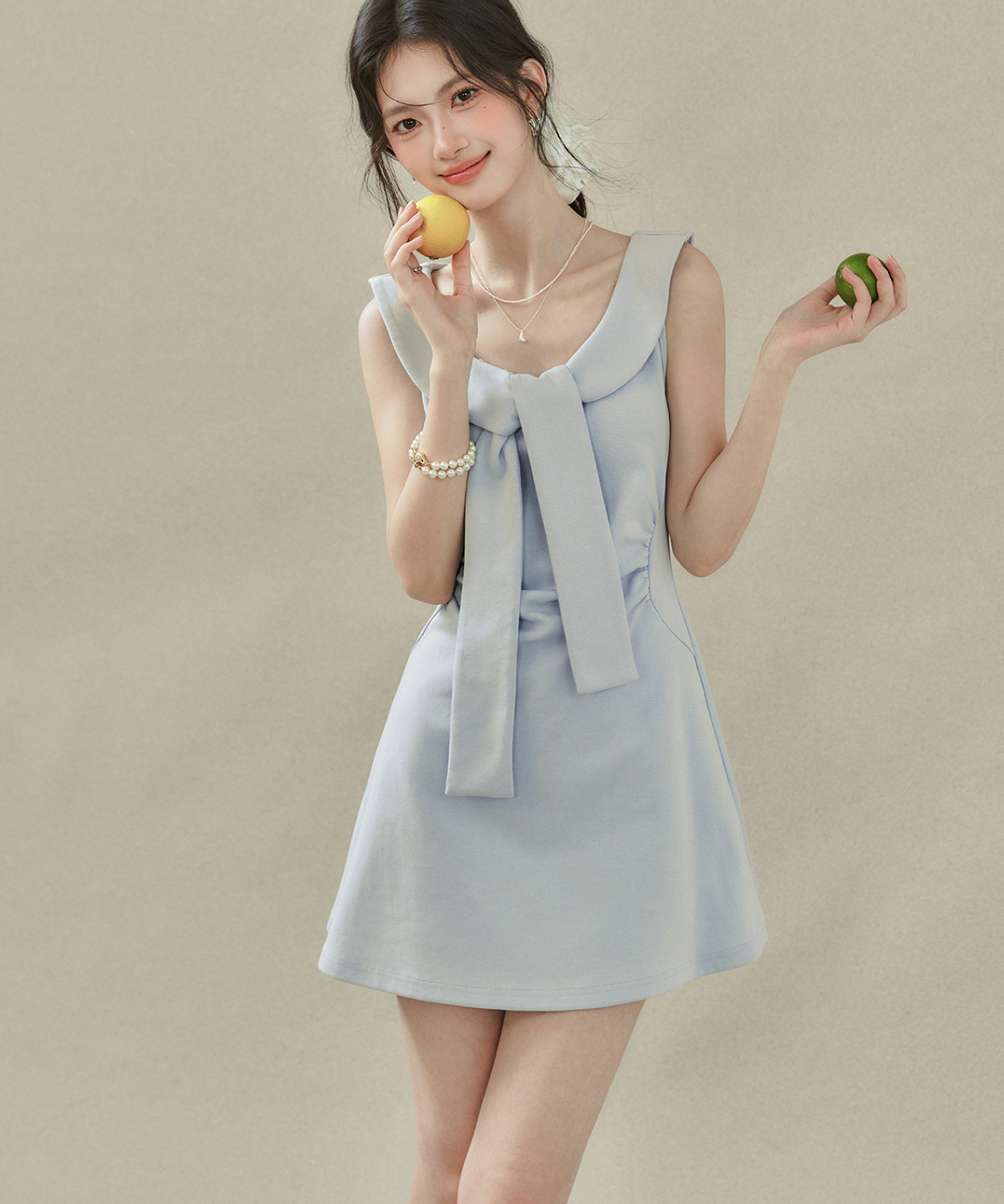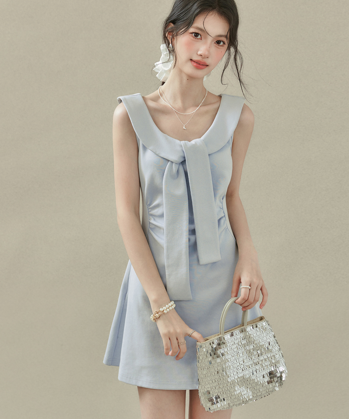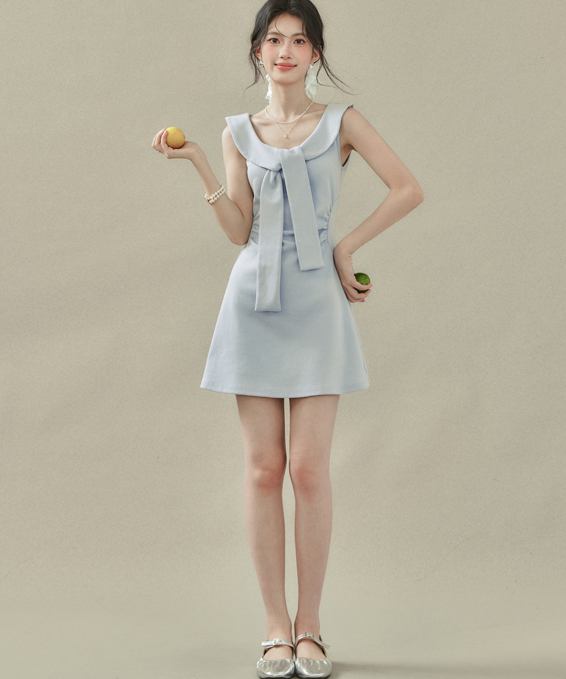 フラットカラービッグリボンノースリーブワンピース