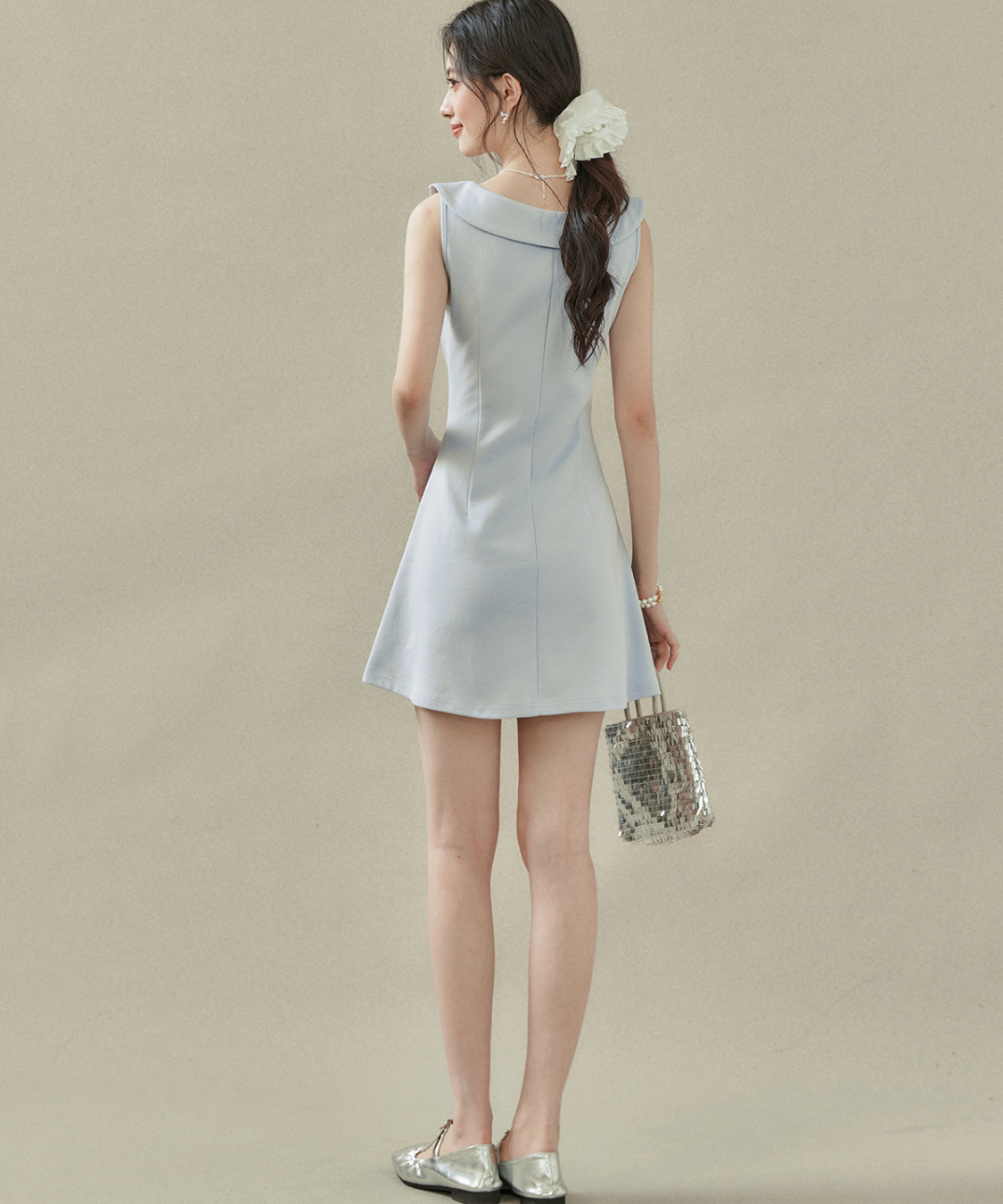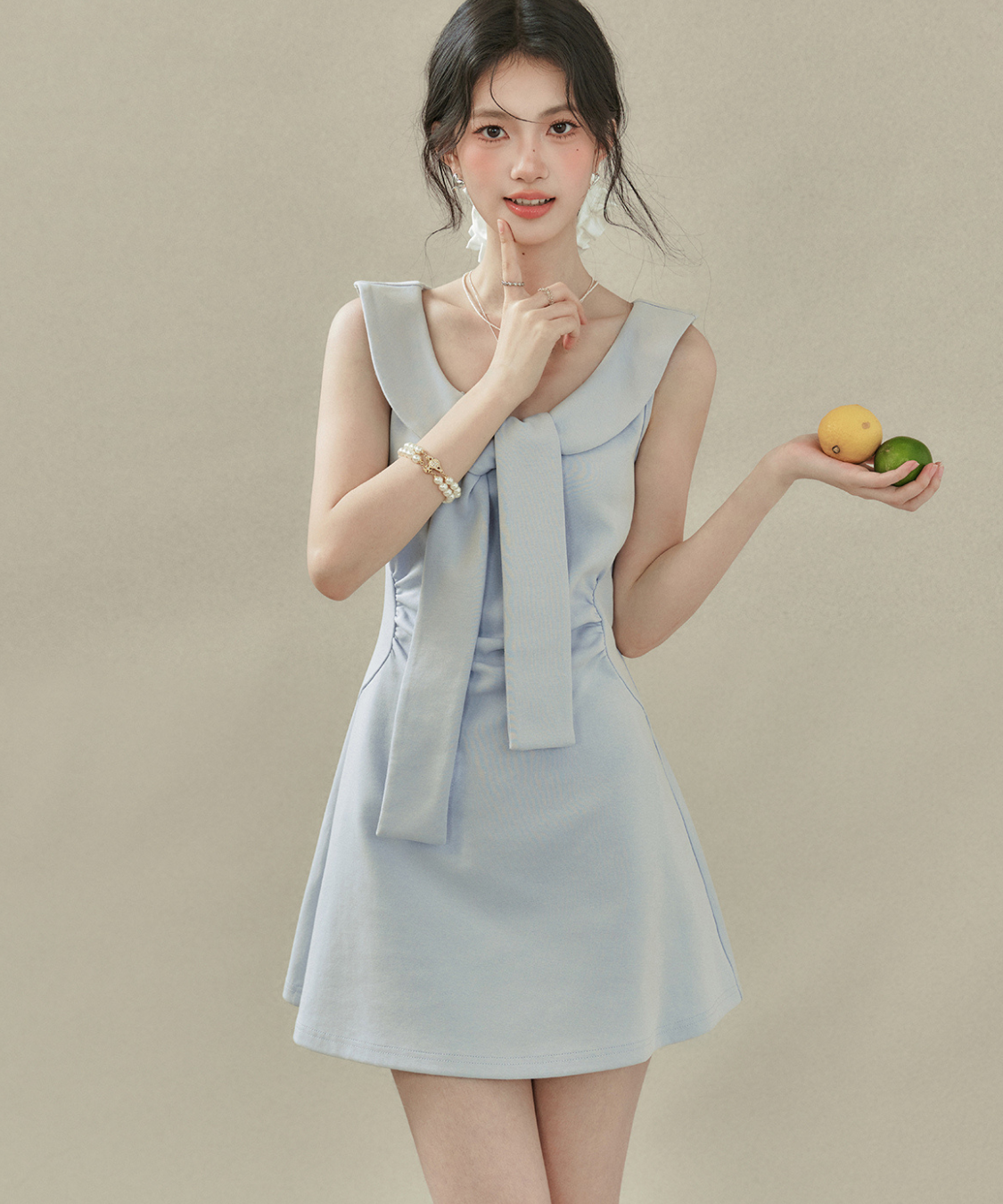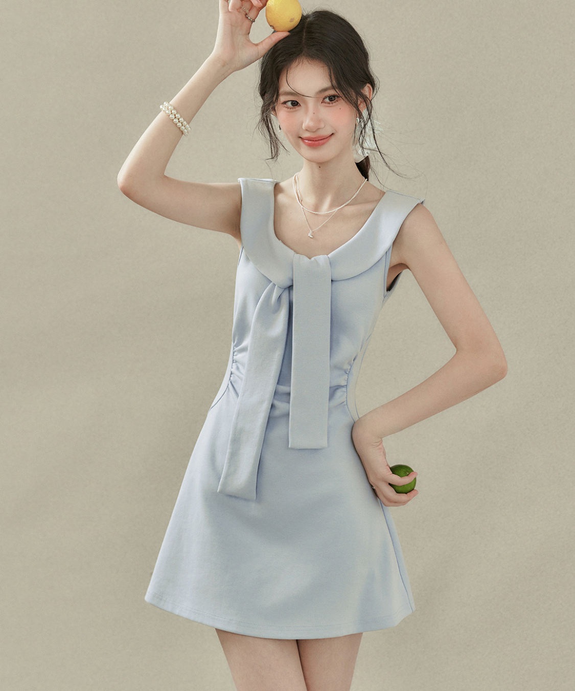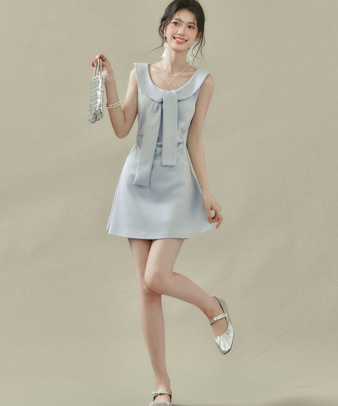 フラットカラービッグリボンノースリーブワンピース