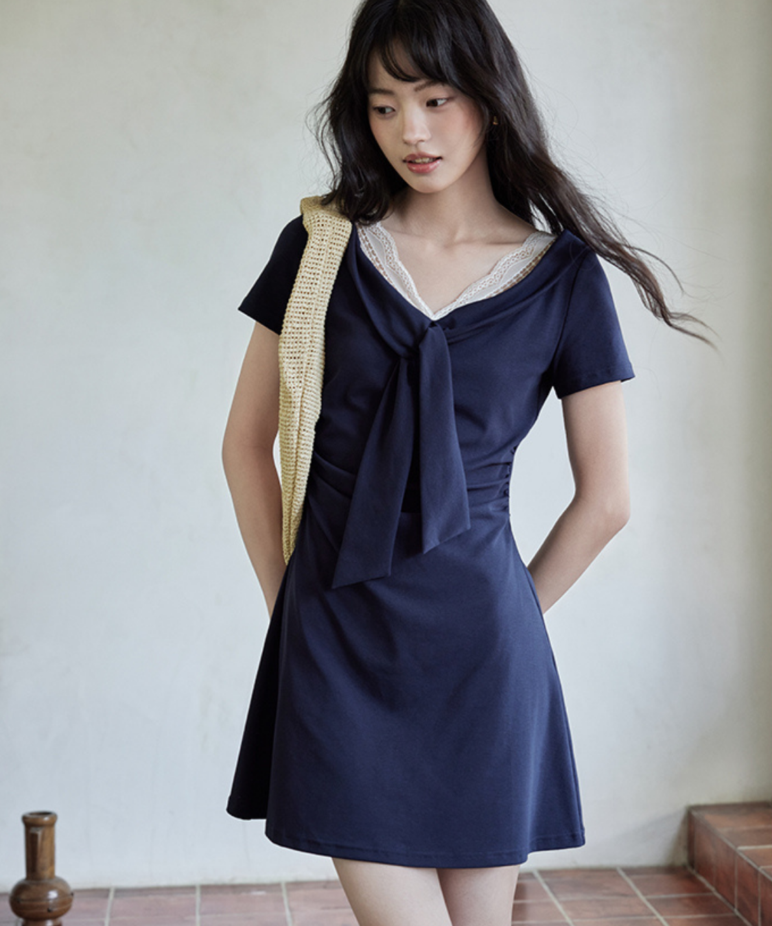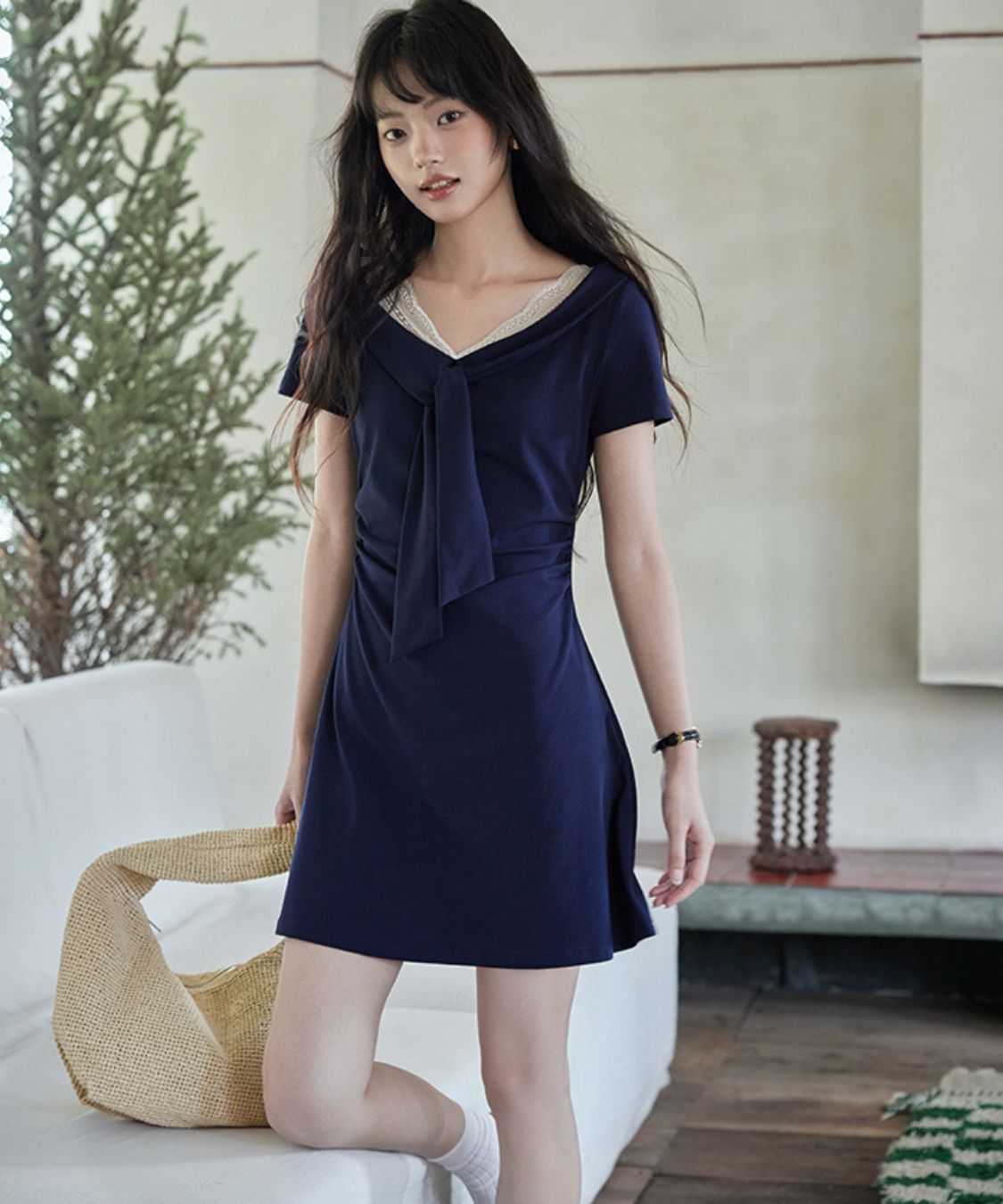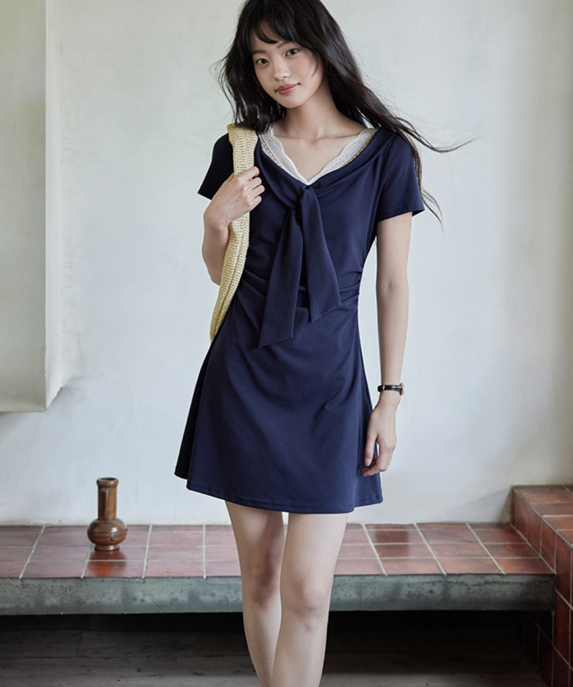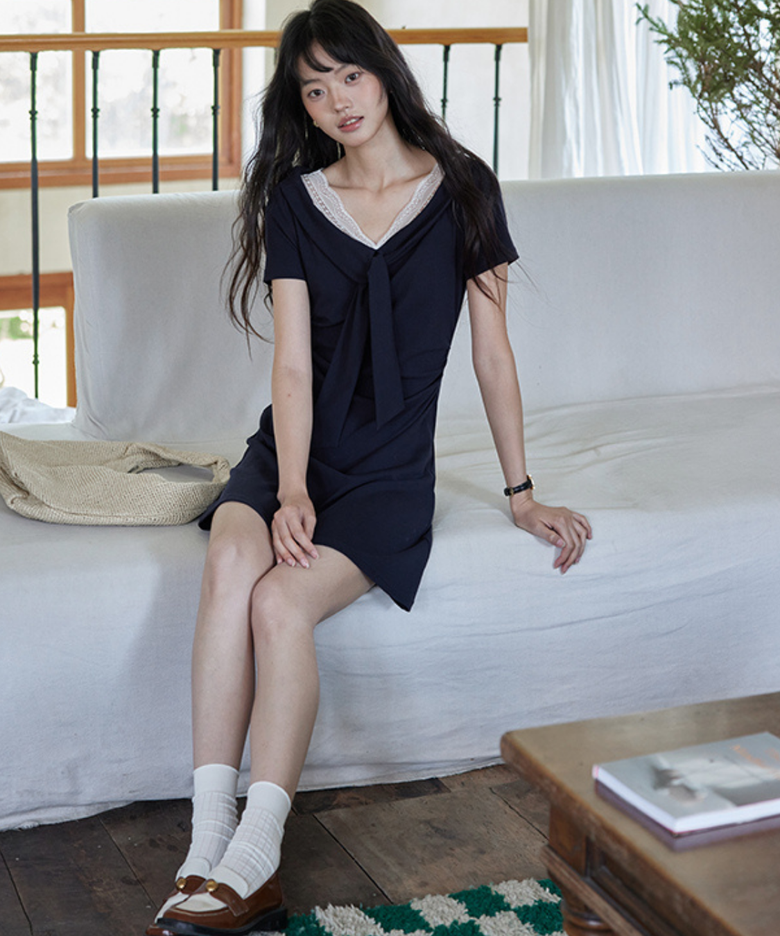 レースのあしらいが上品に映える、ワイドVネックのミニワンピースです。