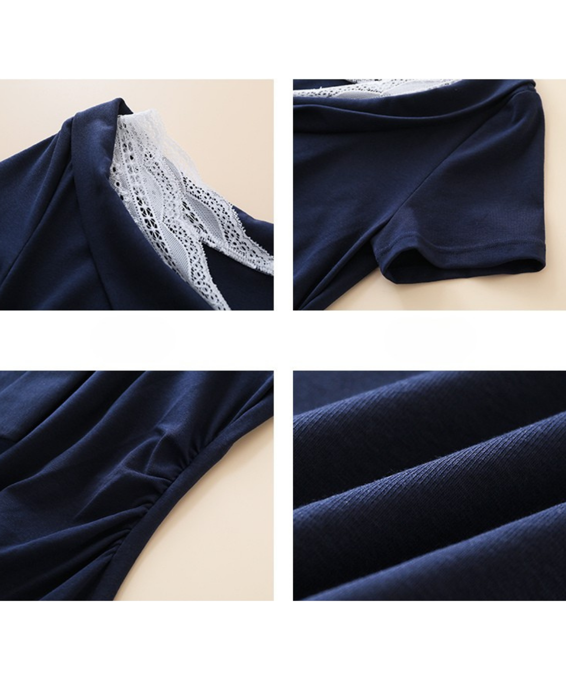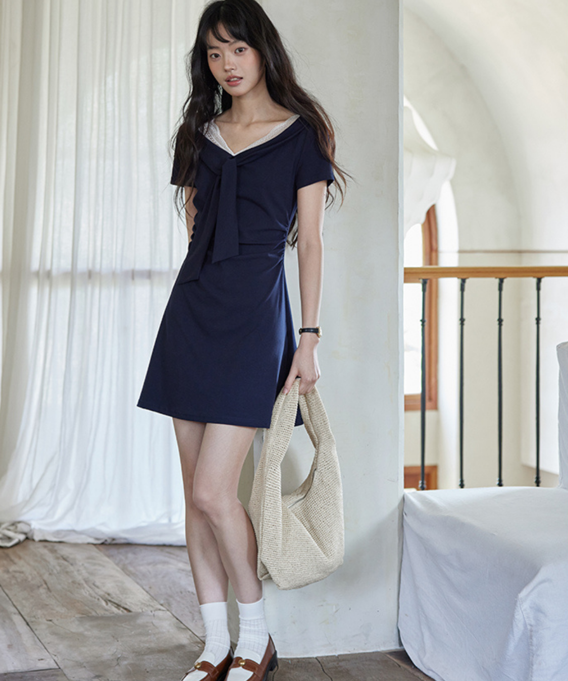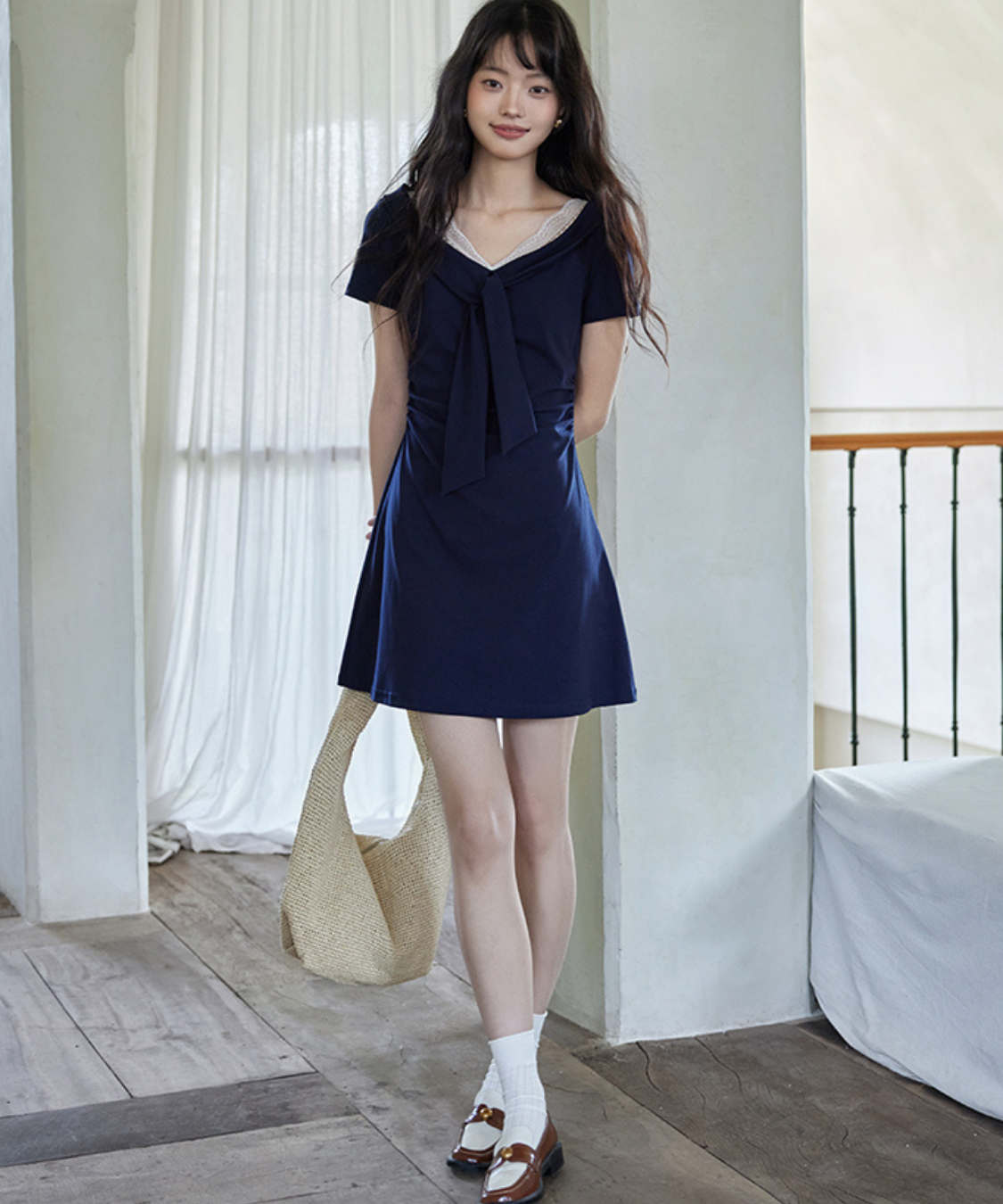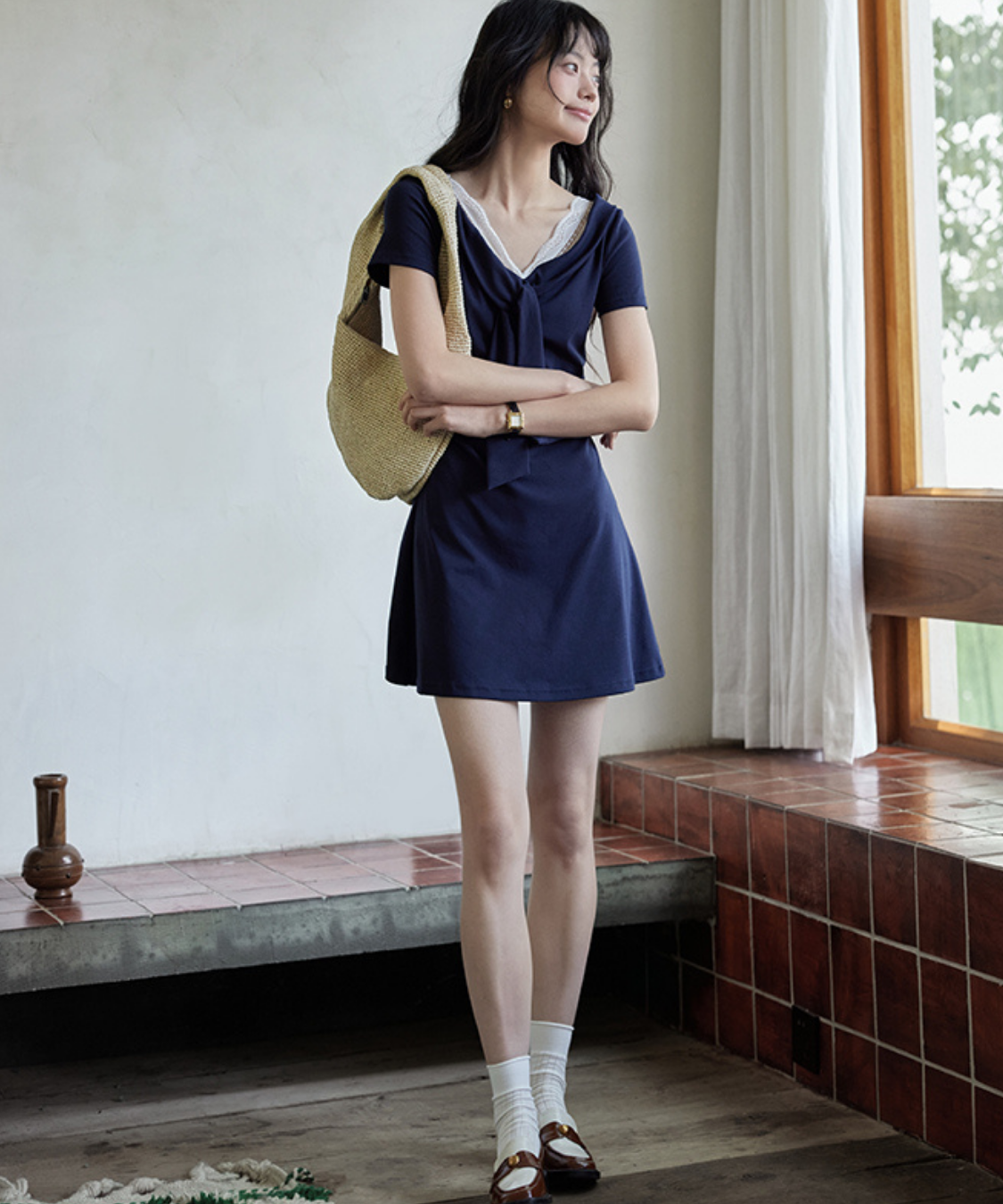 レースのあしらいが上品に映える、ワイドVネックのミニワンピースです。