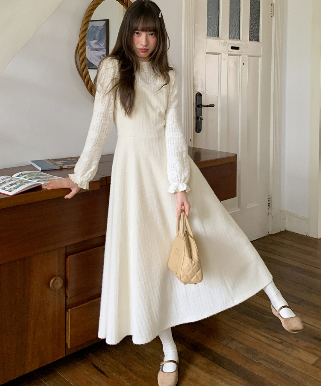 たっぷりのギャザーとフリル袖が愛らしいアクセントになったワンピースです。