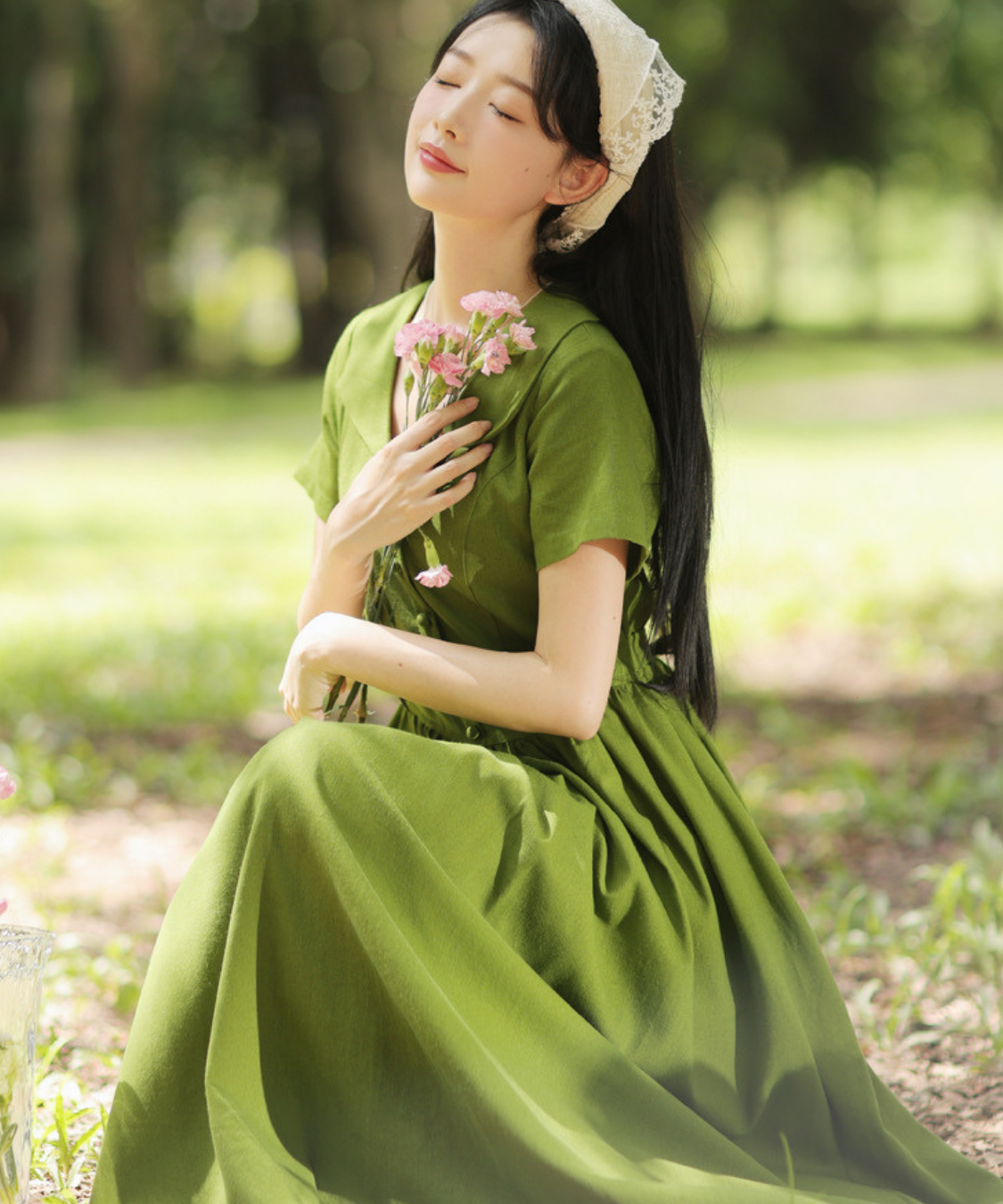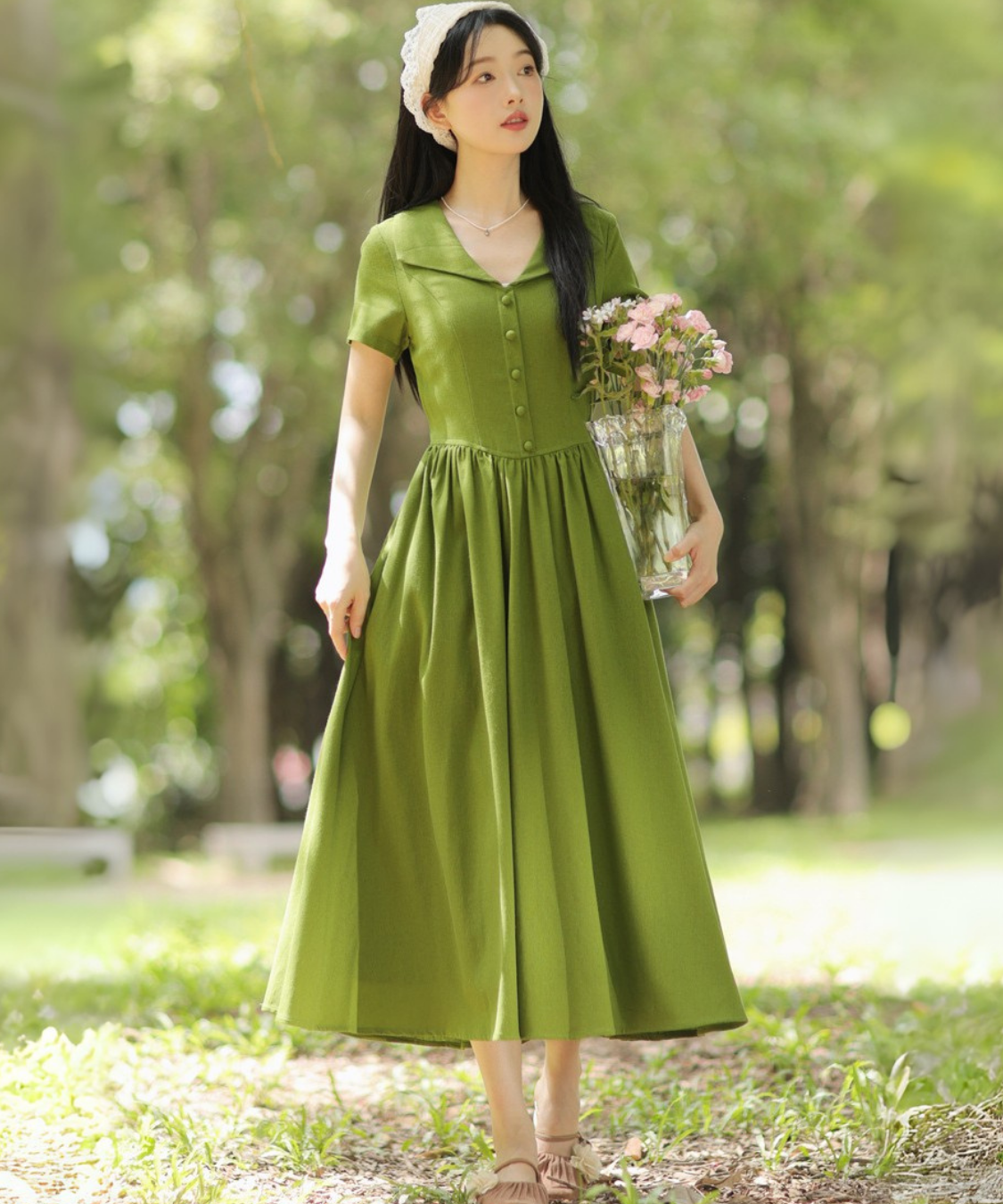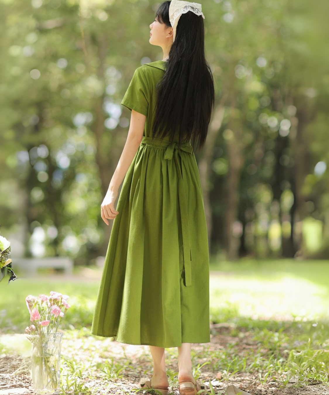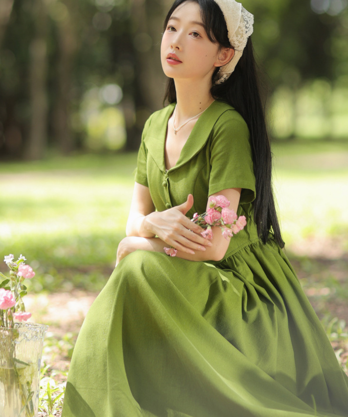 すっきりとしたスクエアカラーが顔まわりを明るく見せてくれるワンピースです。