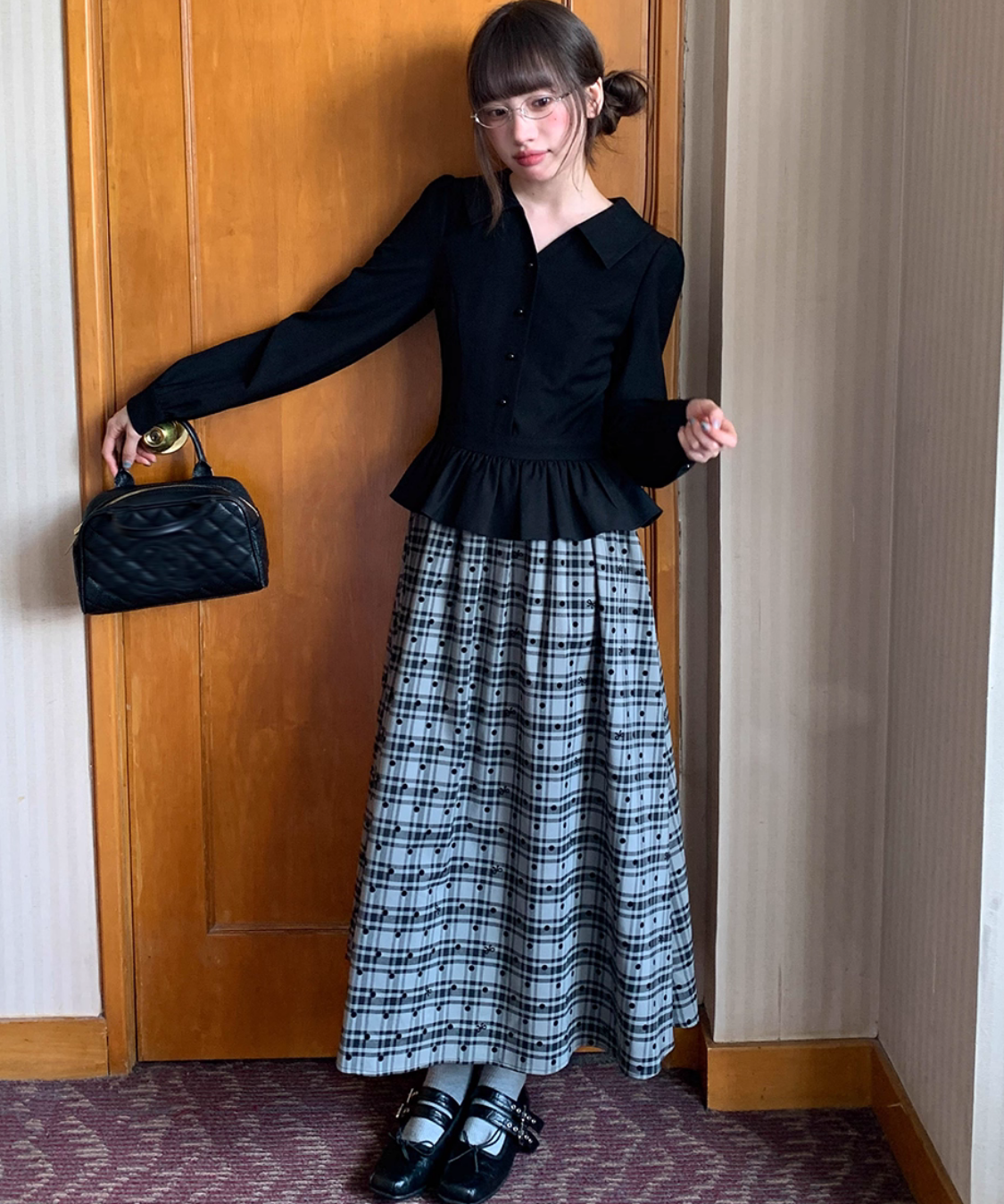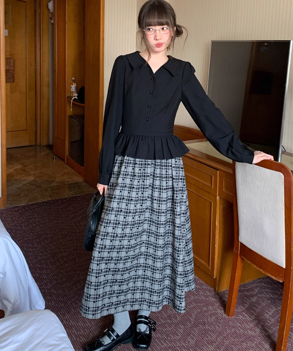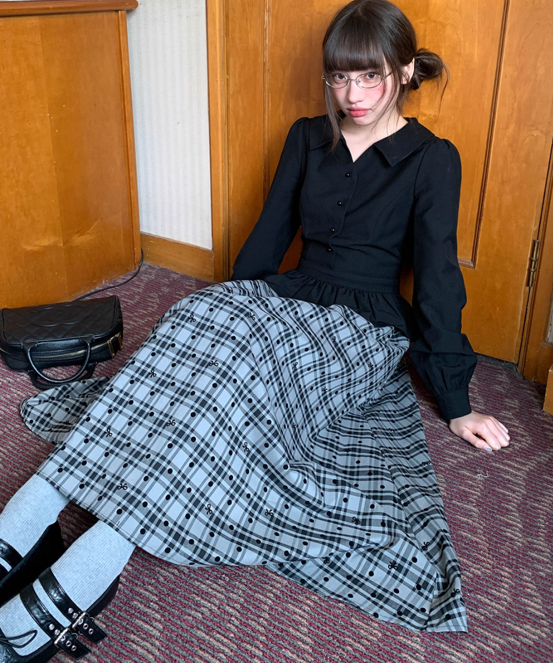 ふんわり広がるチェック柄スカートが目を引く、ガーリーなレイヤード風ワンピースです。