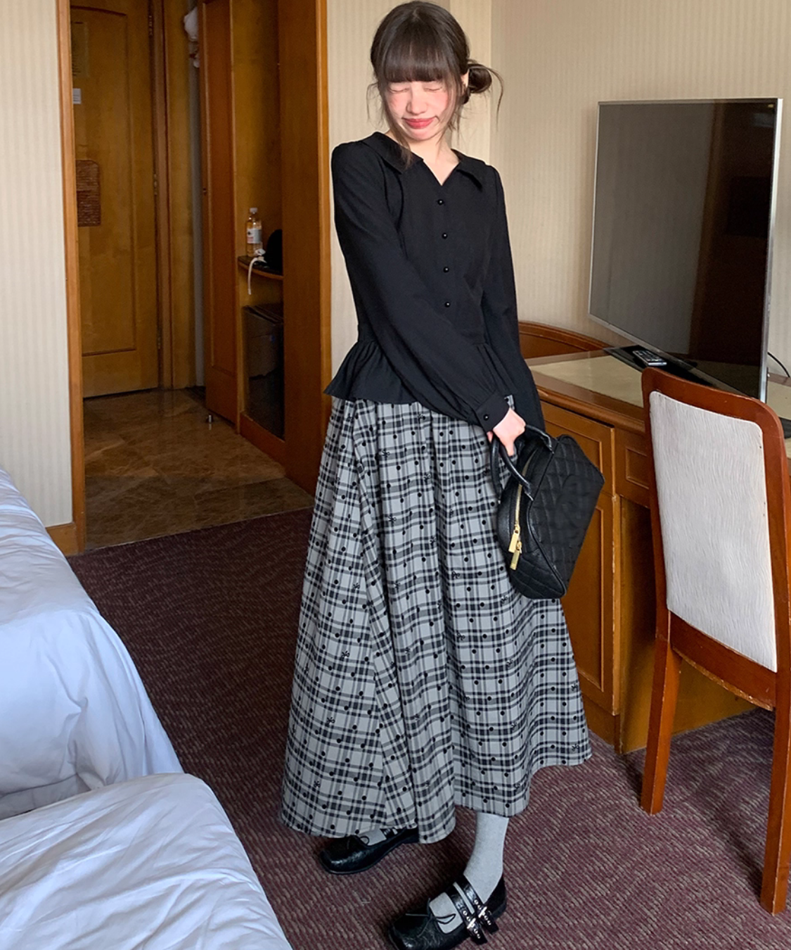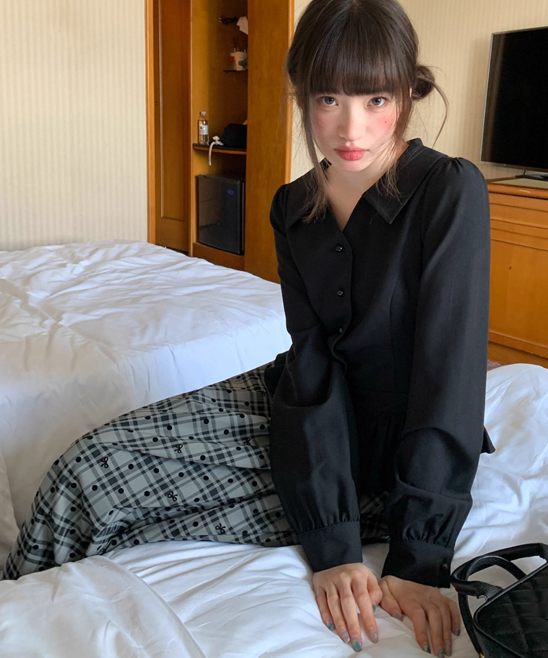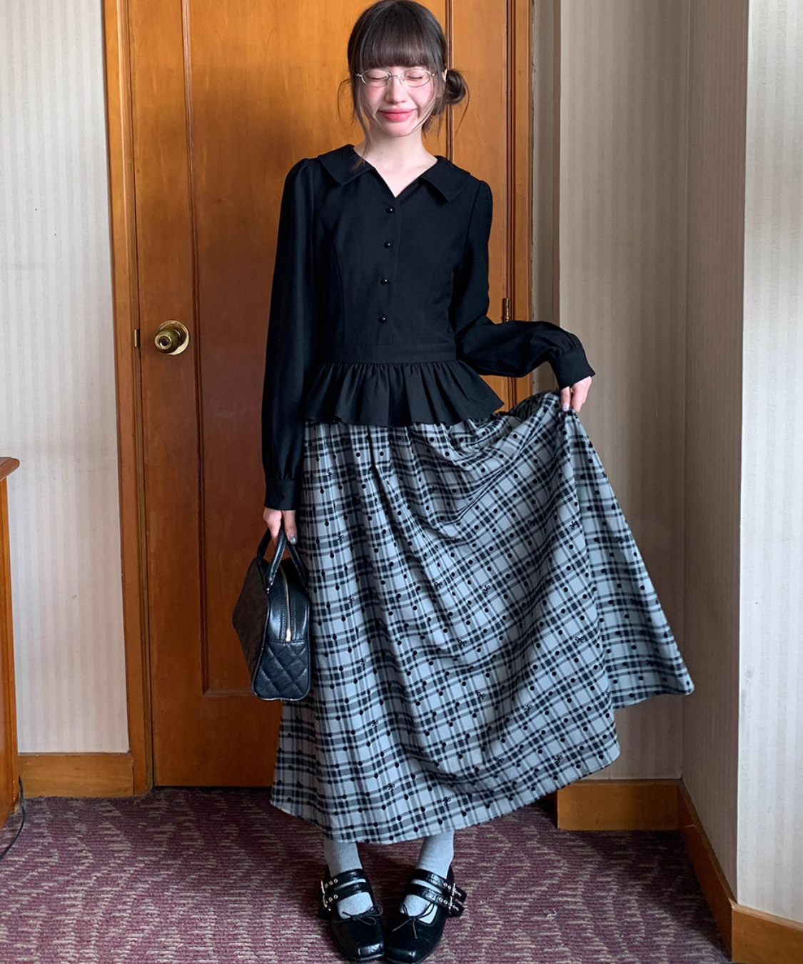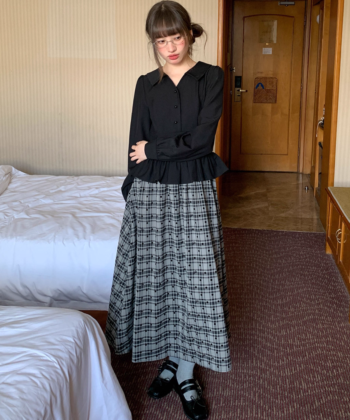 ふんわり広がるチェック柄スカートが目を引く、ガーリーなレイヤード風ワンピースです。