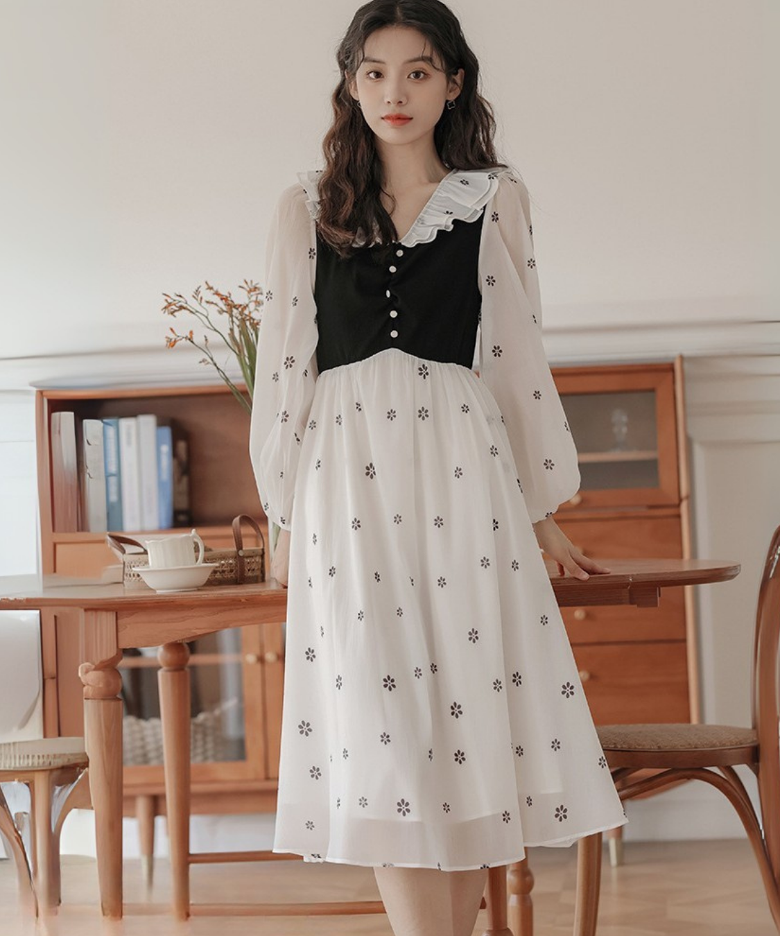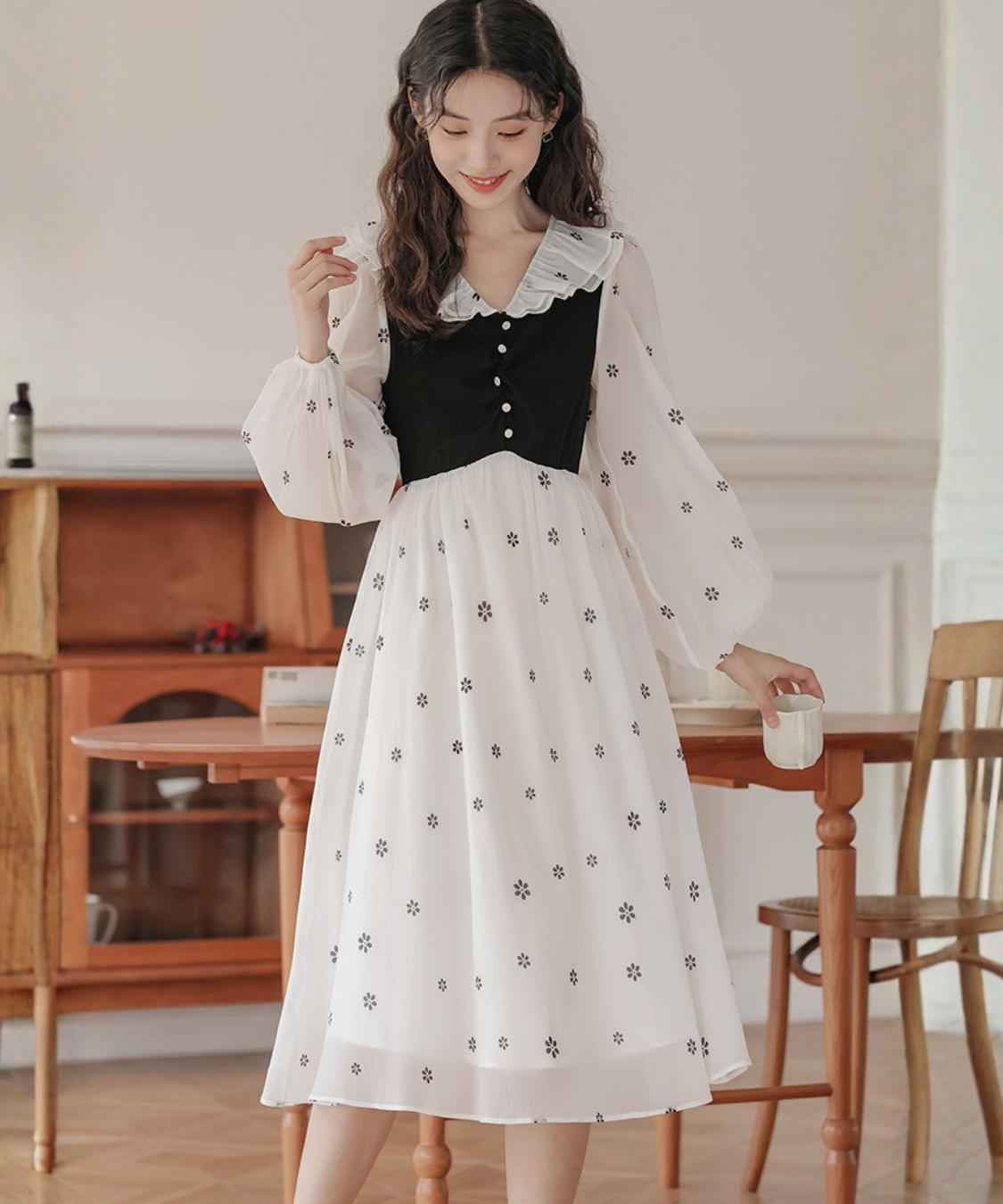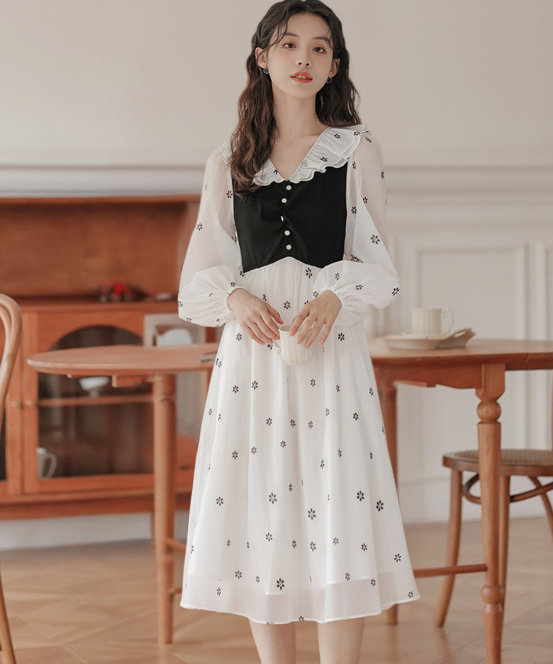 小花柄とフリル襟の組み合わせが、甘く上品な印象に仕上げてくれます♡