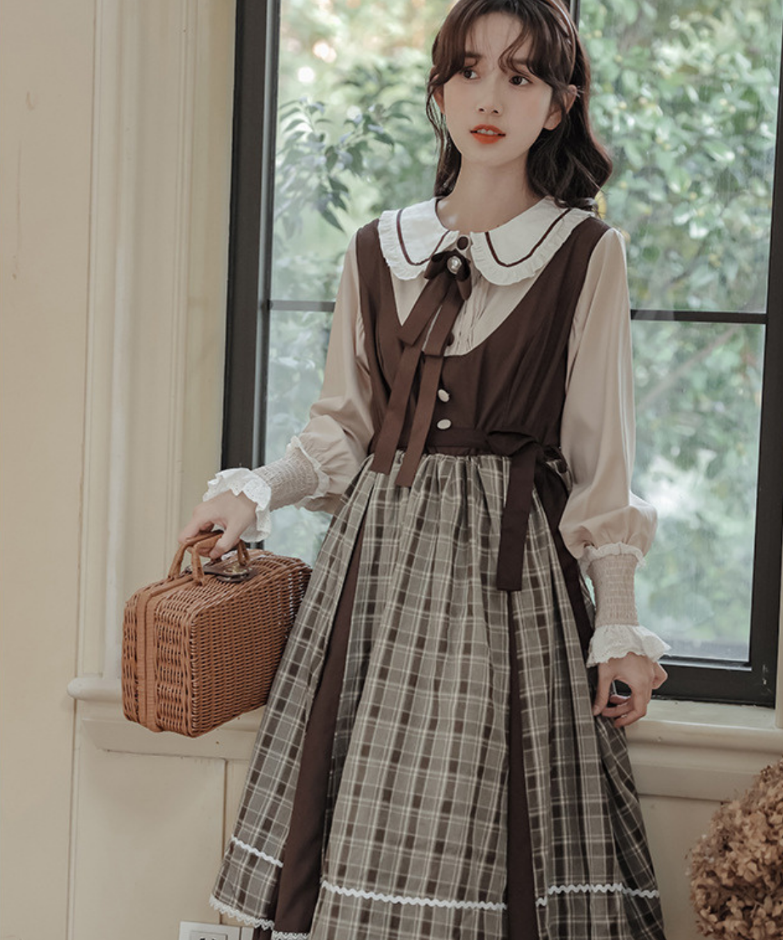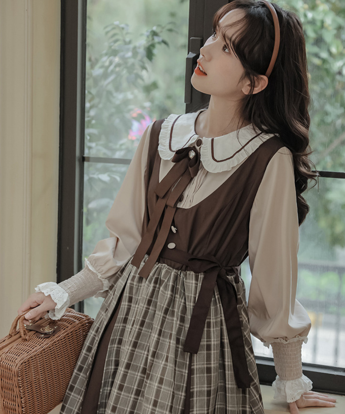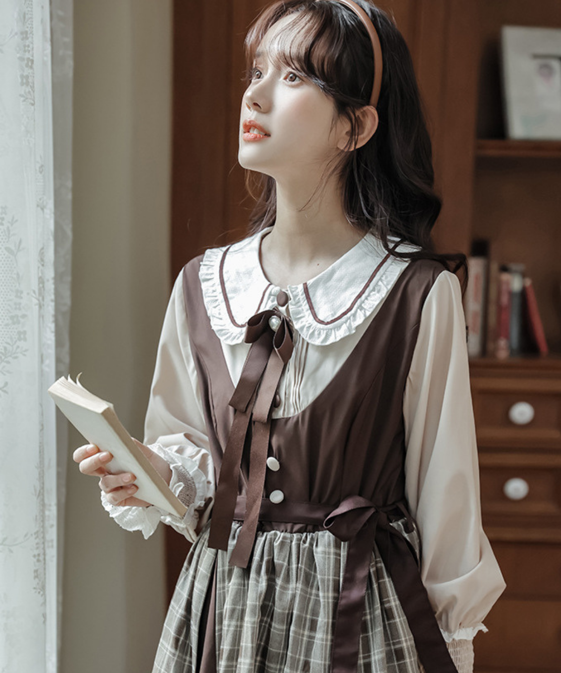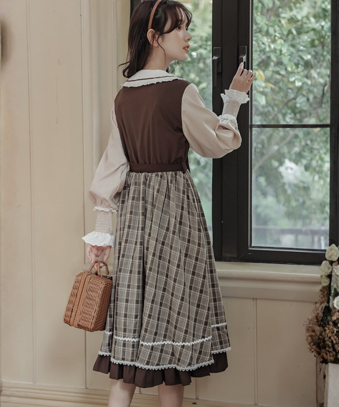 パイピング襟リボン付きチェック切り替えフェイクレイヤードワンピース