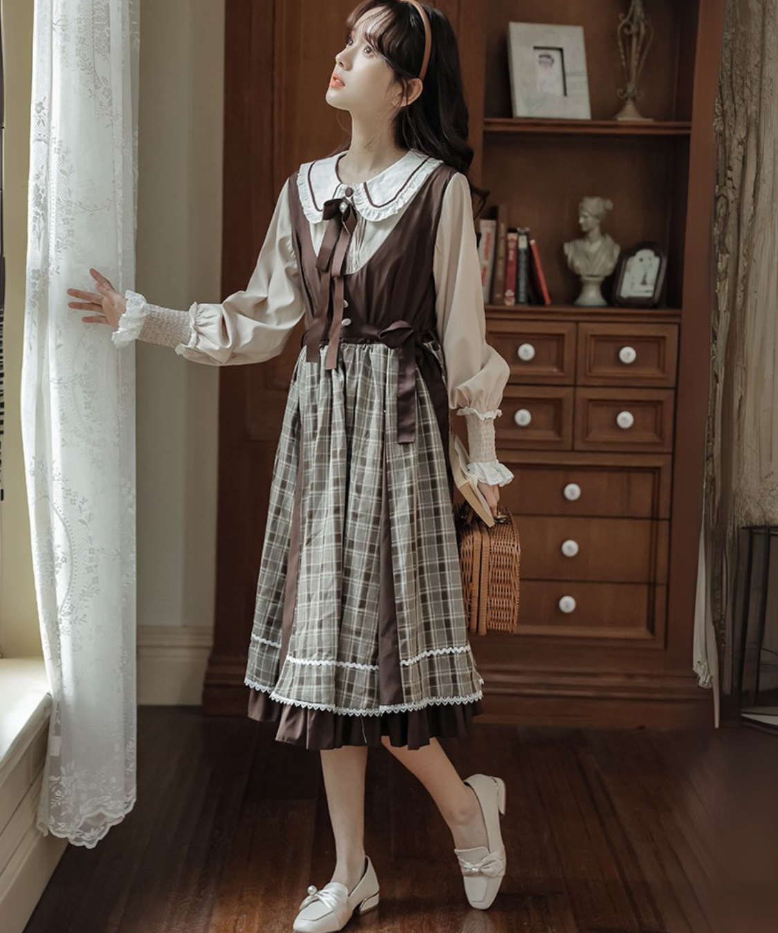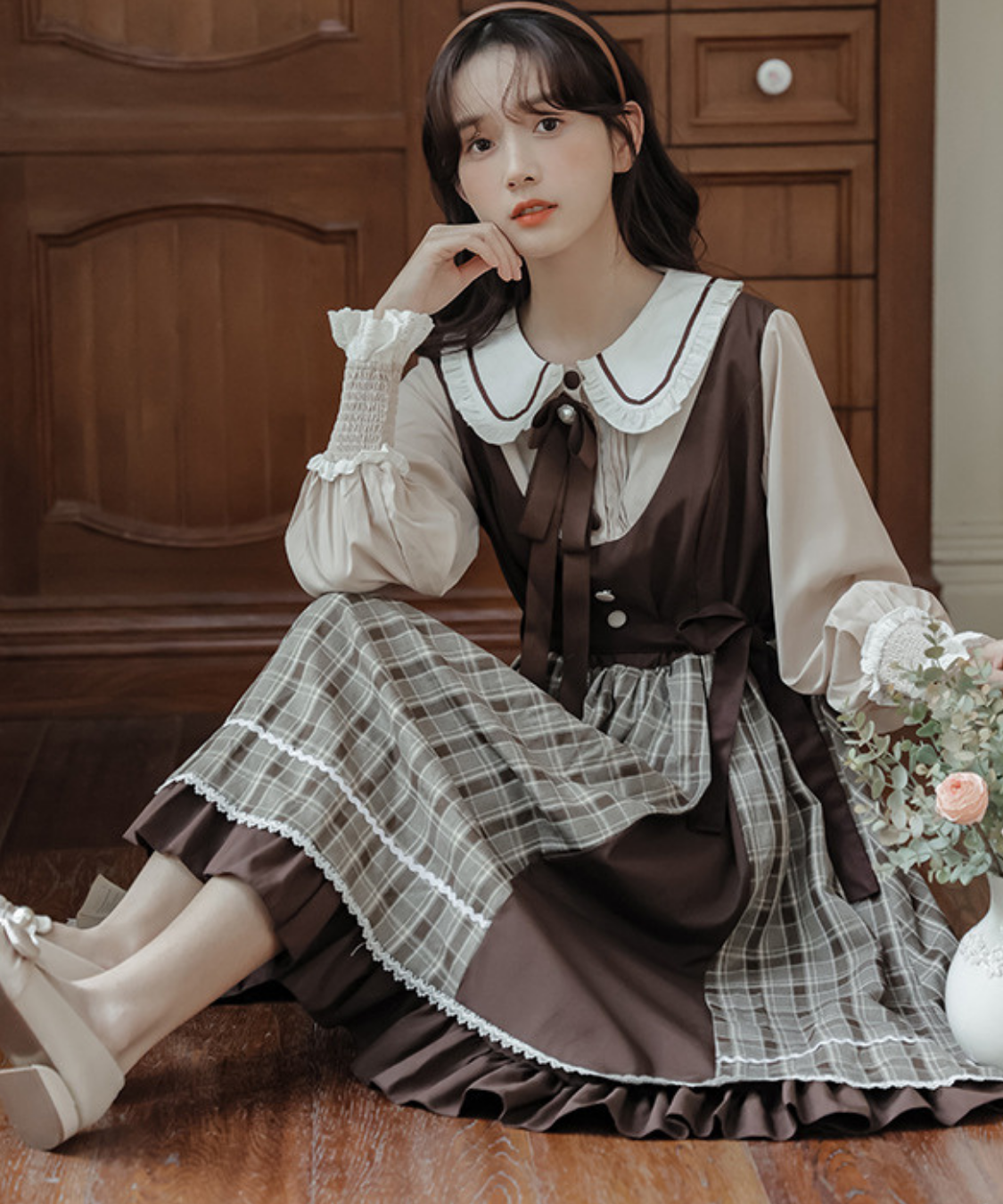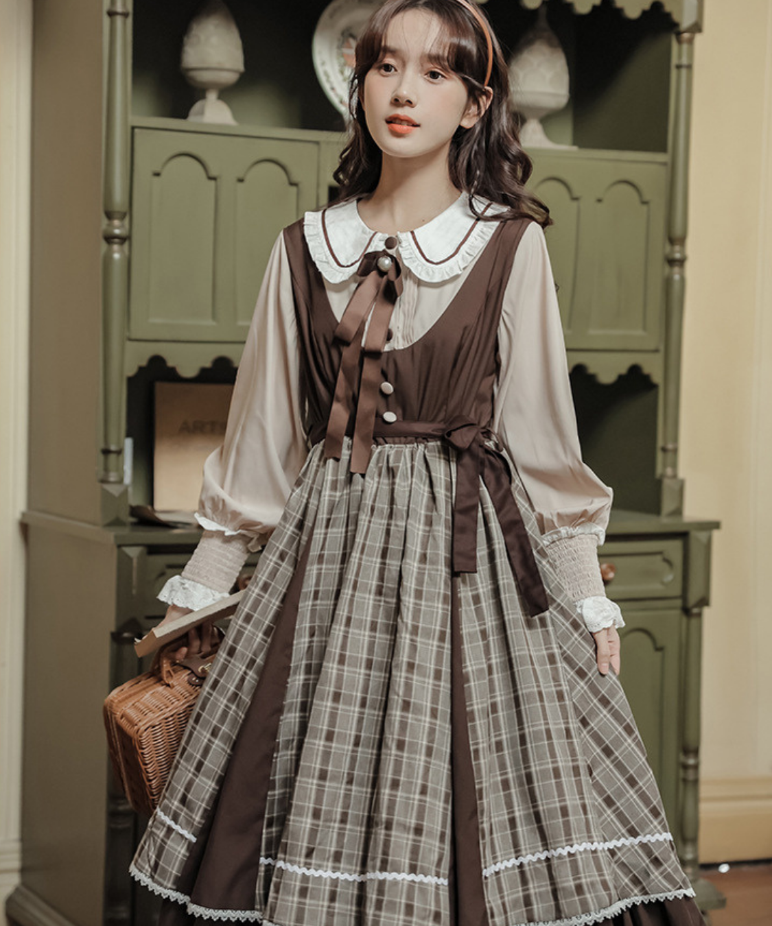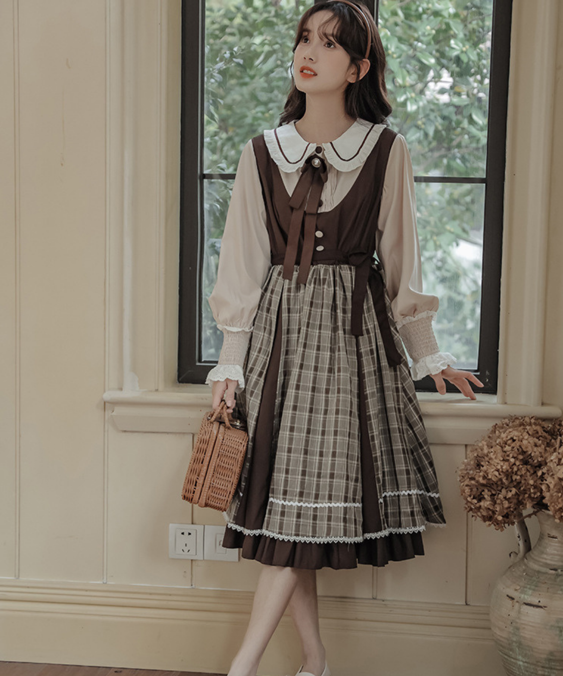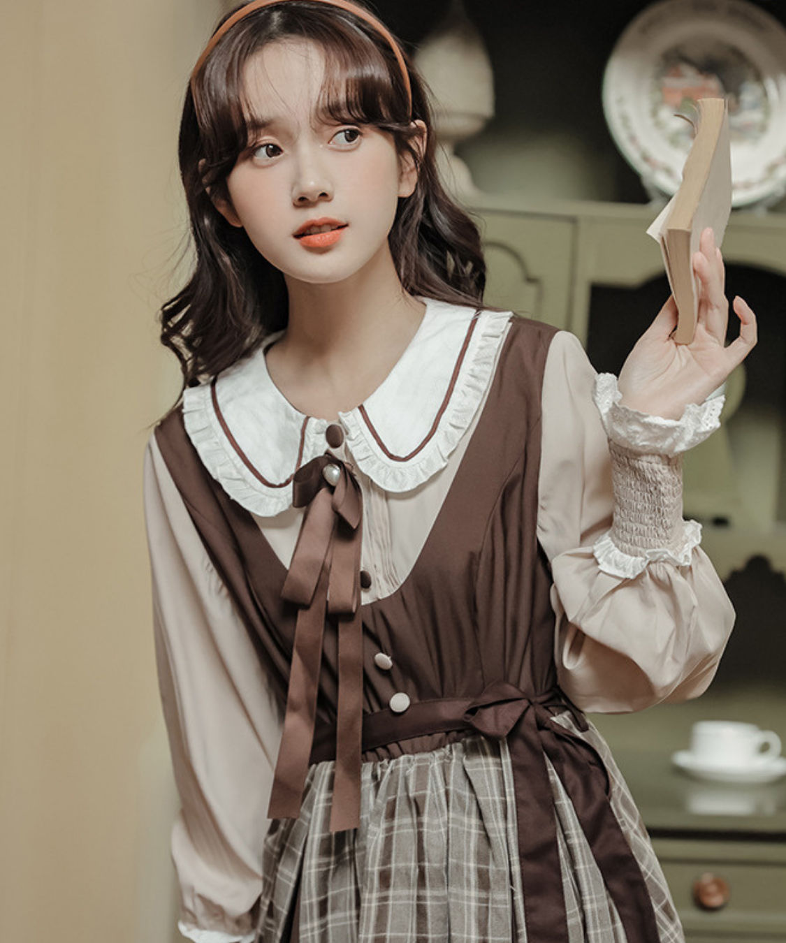 パイピング襟リボン付きチェック切り替えフェイクレイヤードワンピース