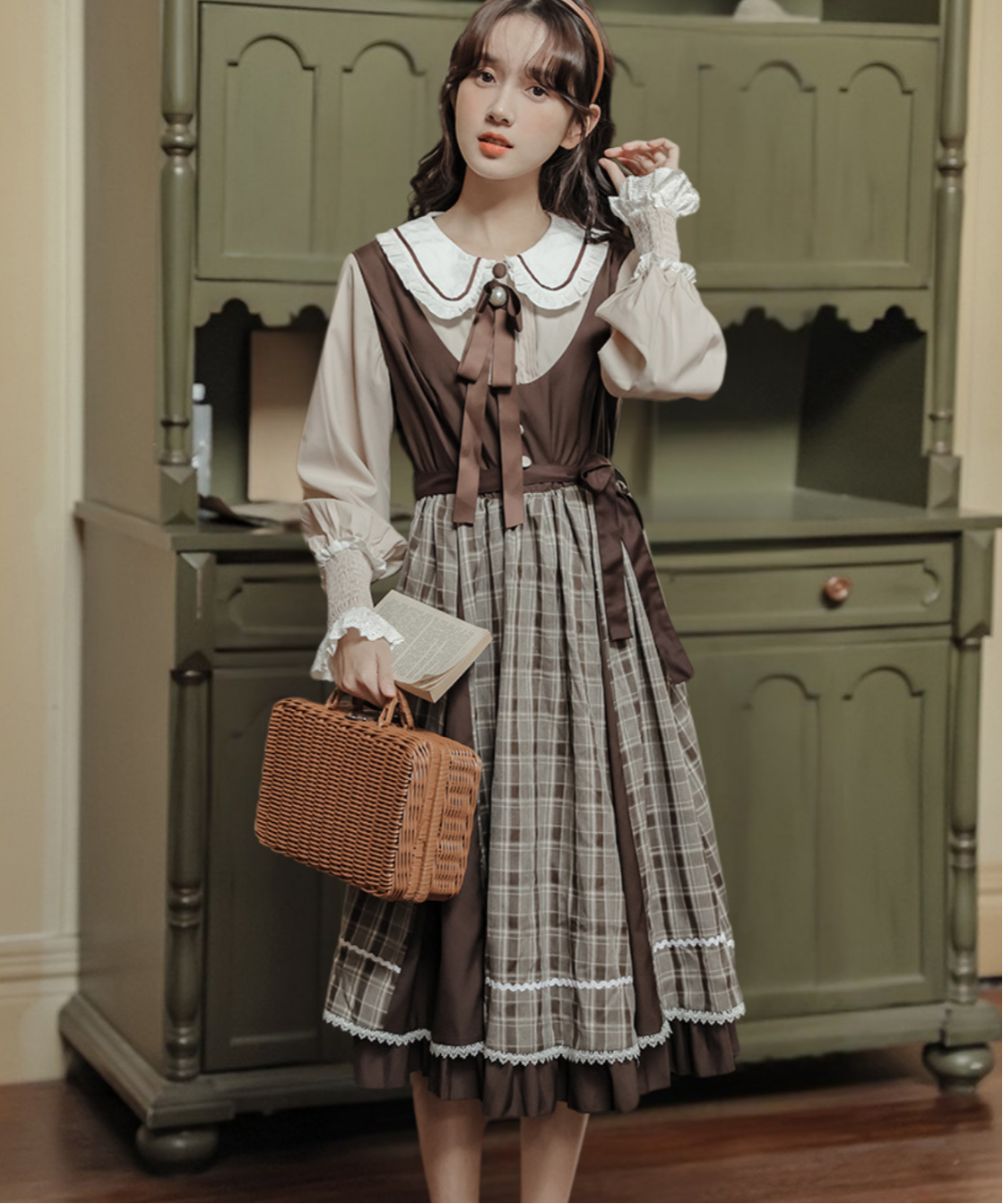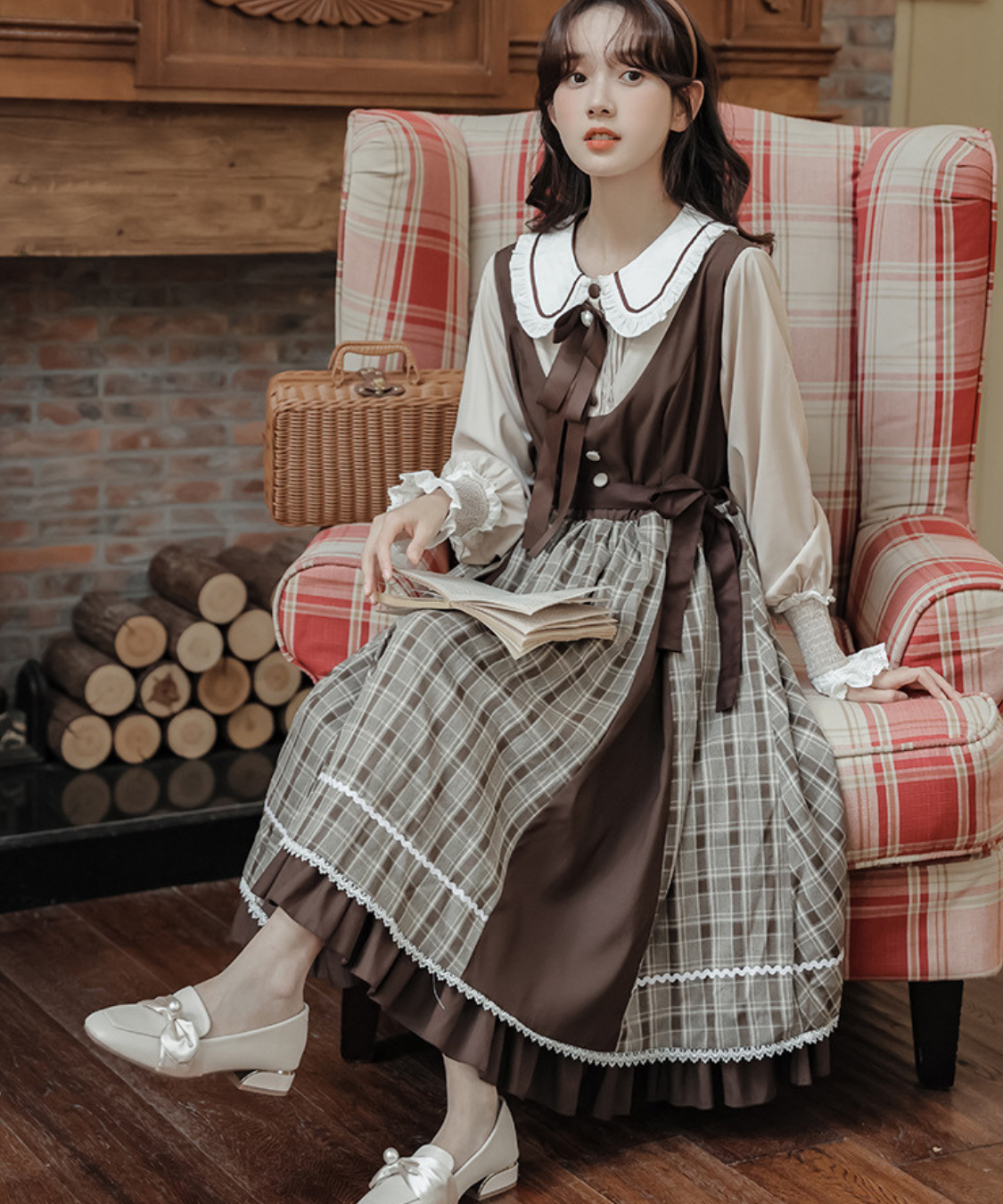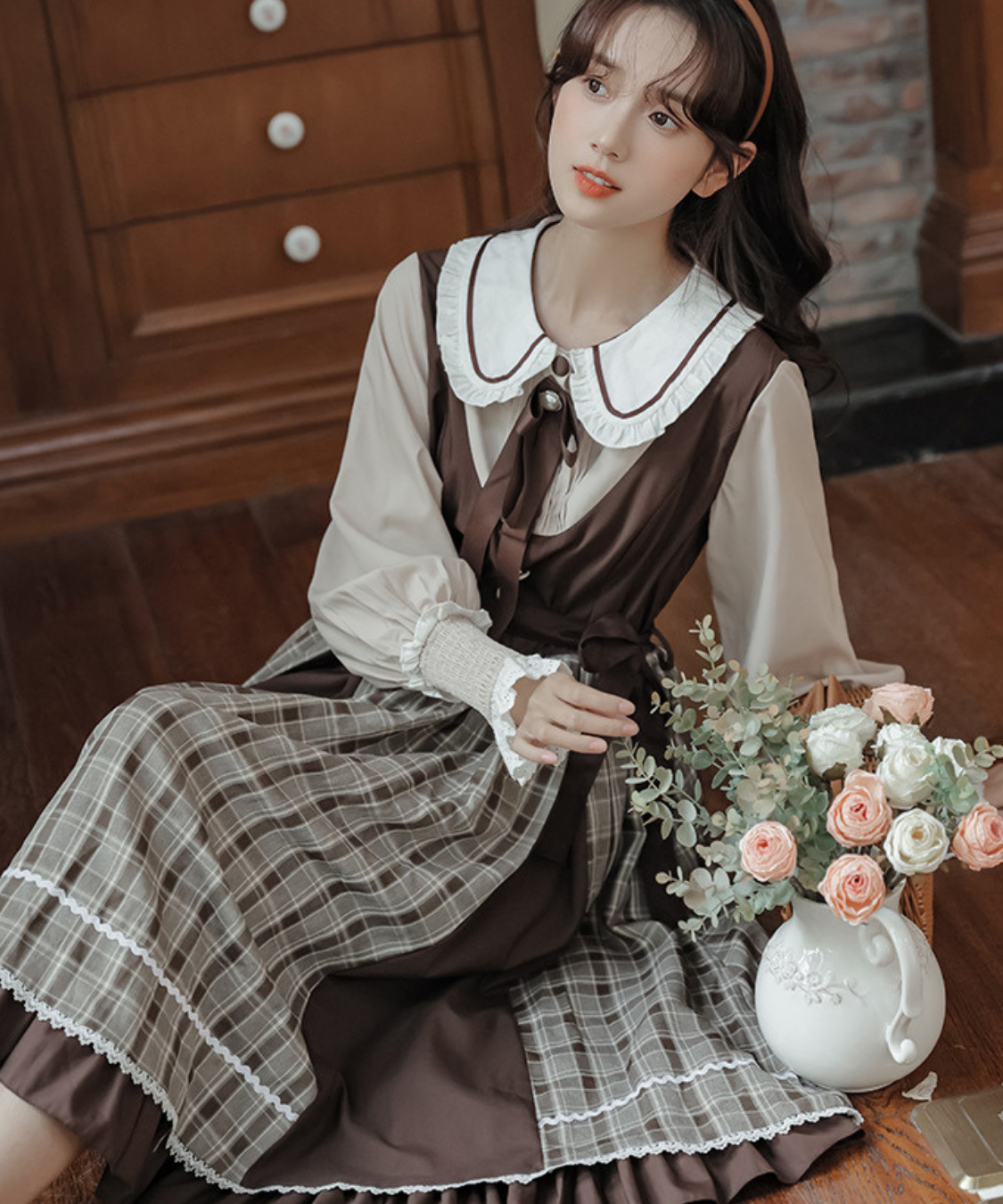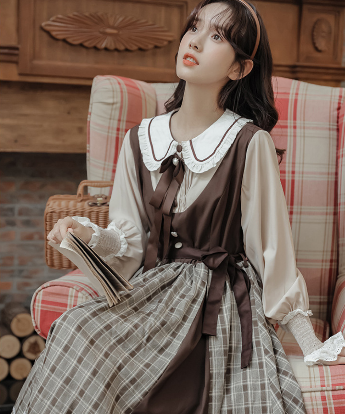 パイピング襟リボン付きチェック切り替えフェイクレイヤードワンピース