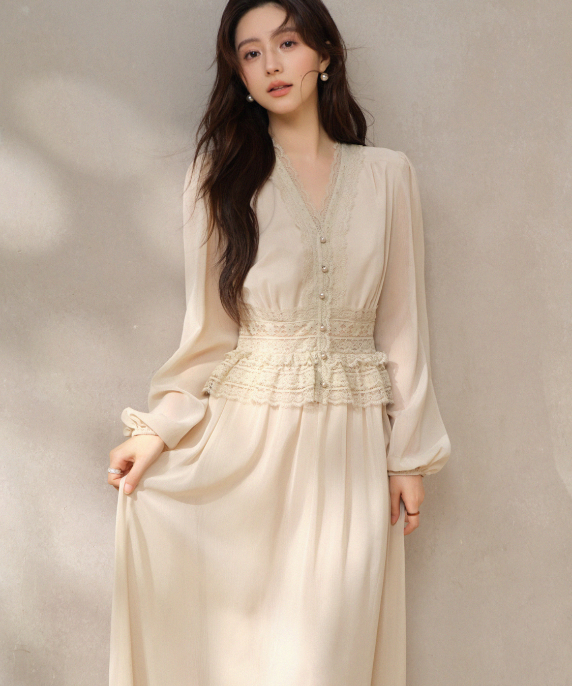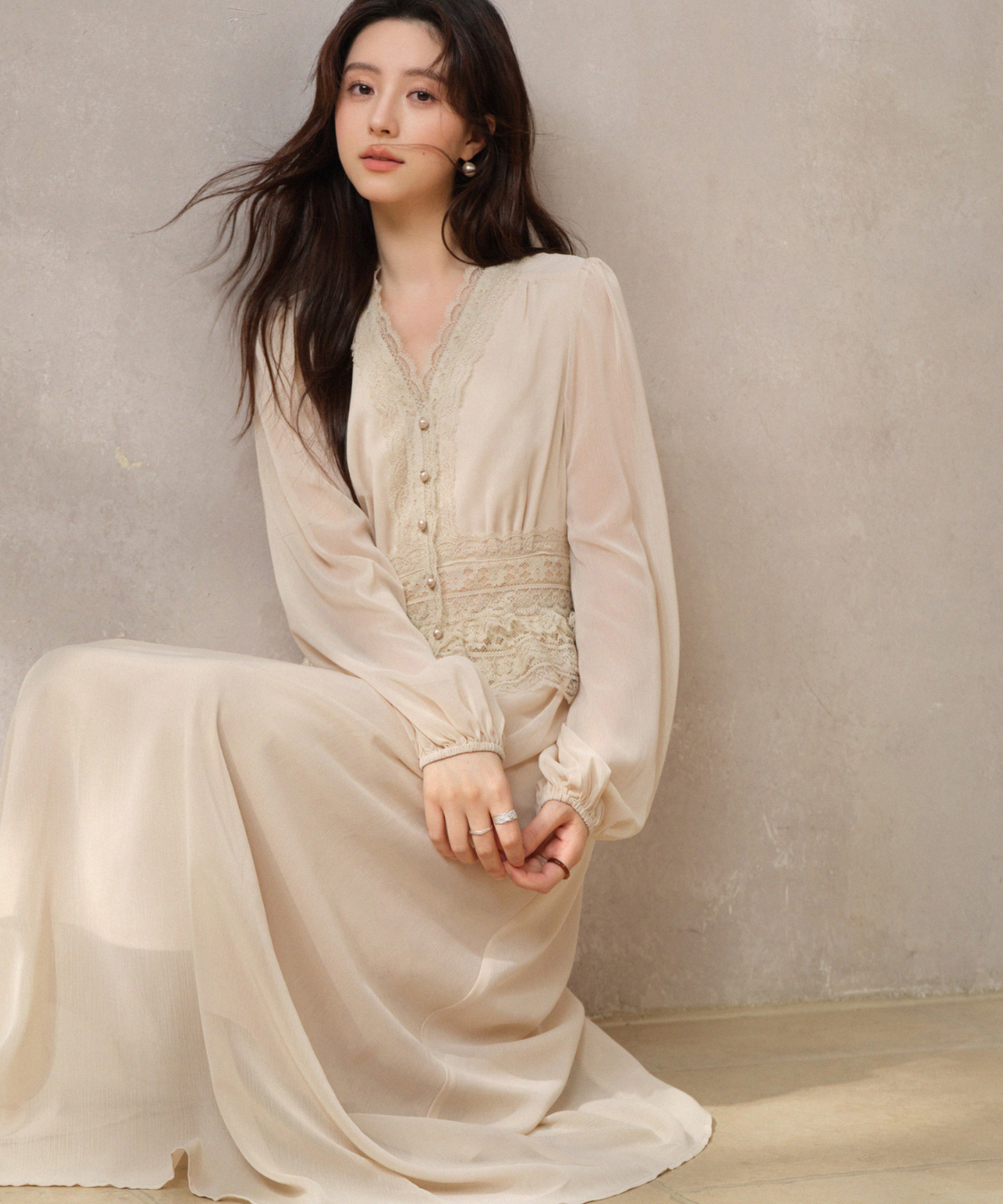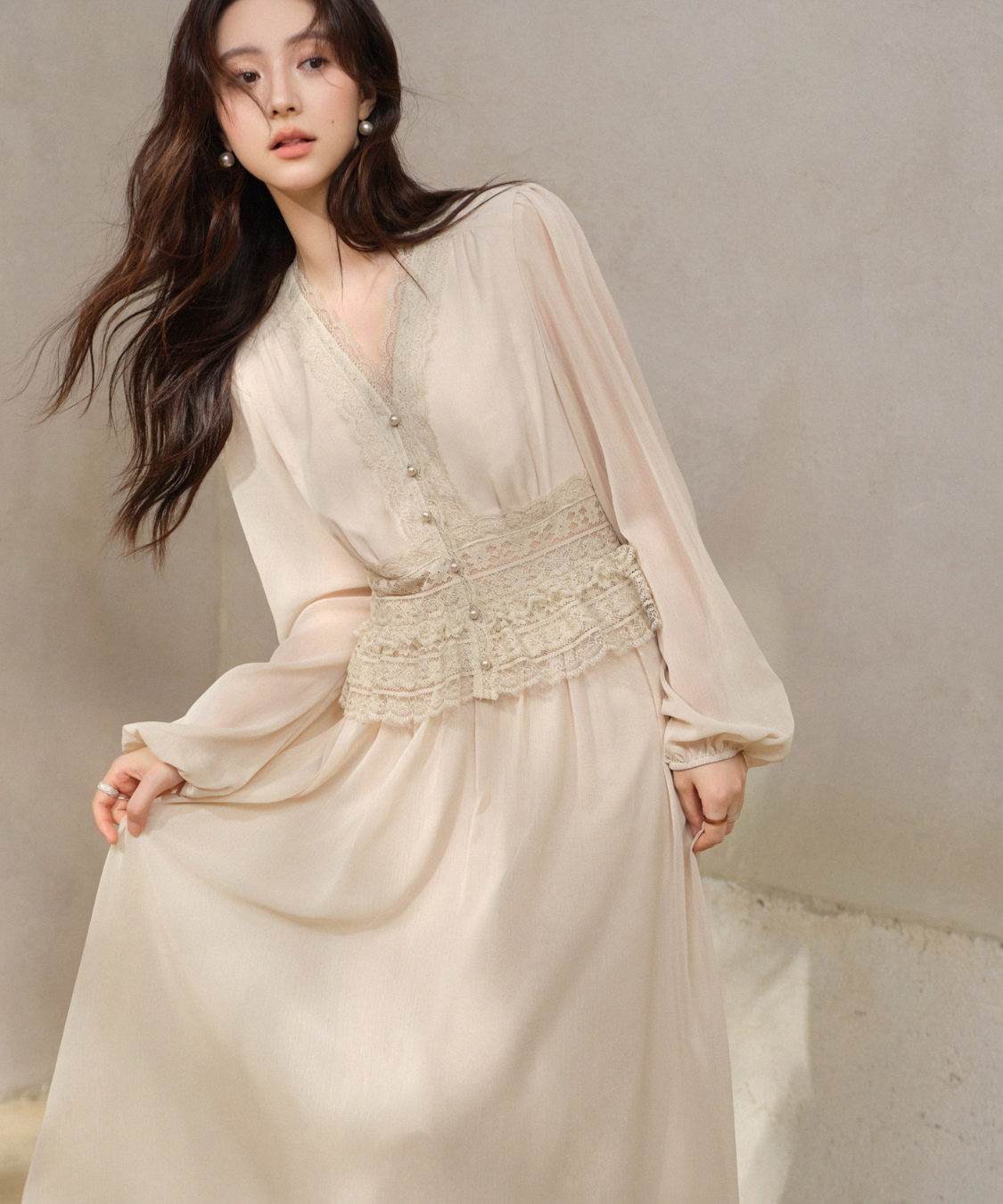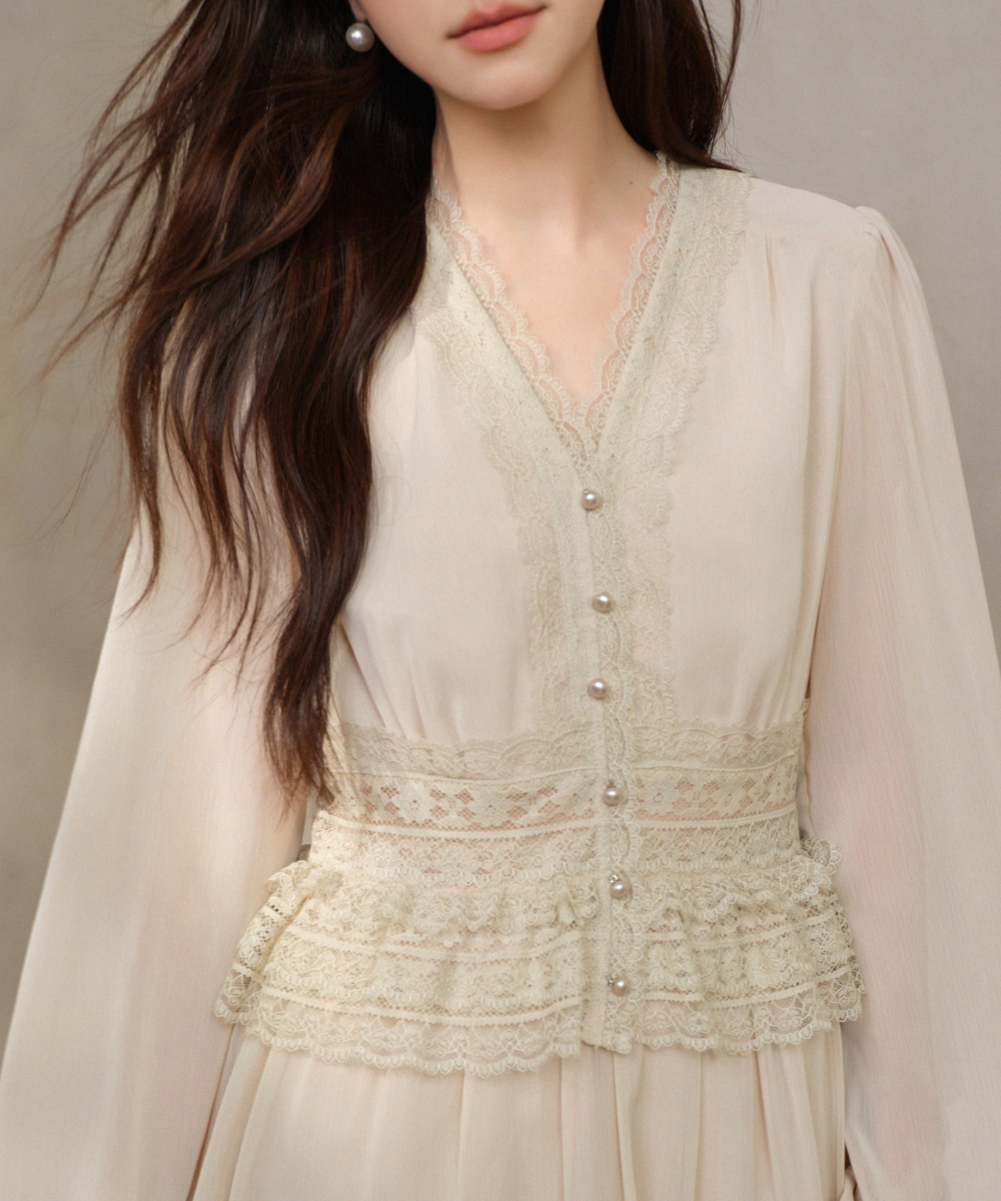 デコルテを美しく見せるVネックに、繊細なレースを施した上品なワンピースです。