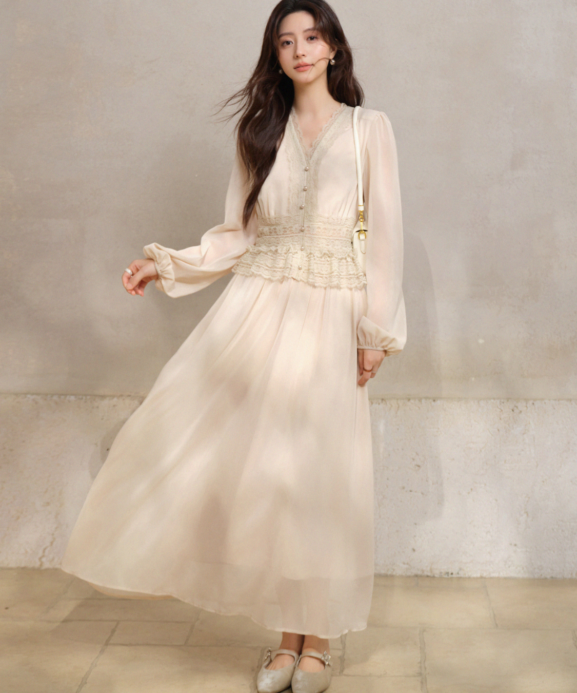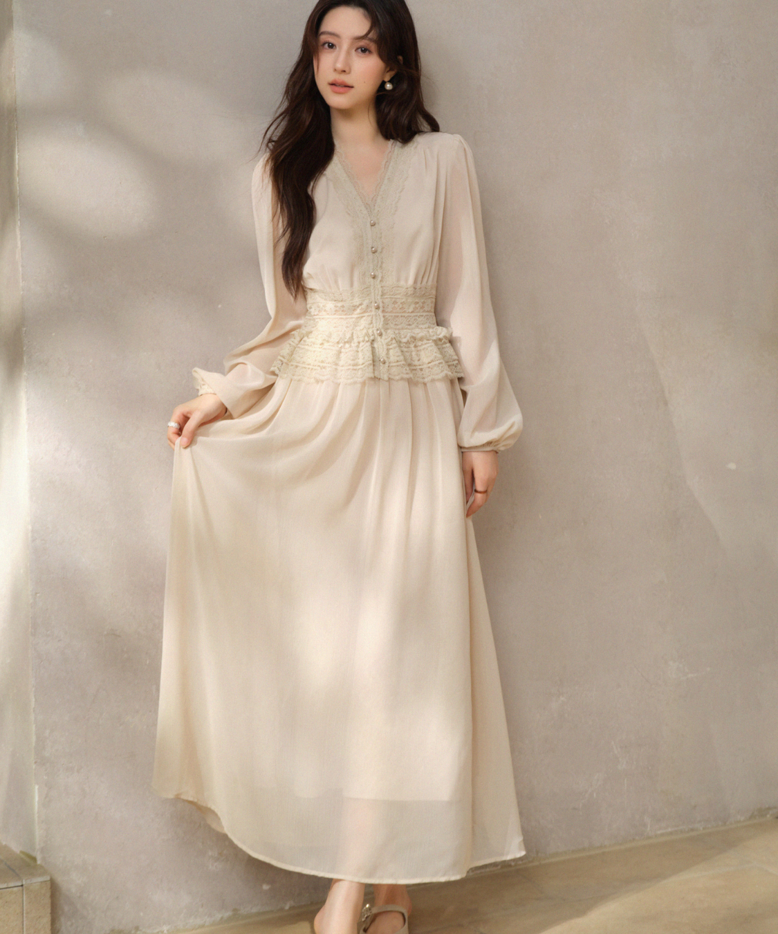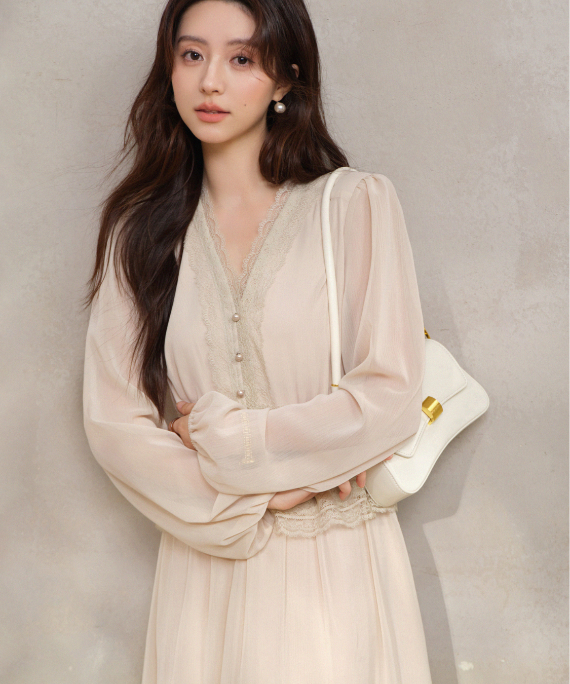 デコルテを美しく見せるVネックに、繊細なレースを施した上品なワンピースです。