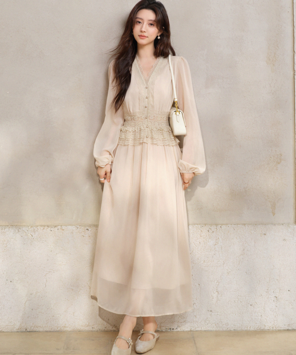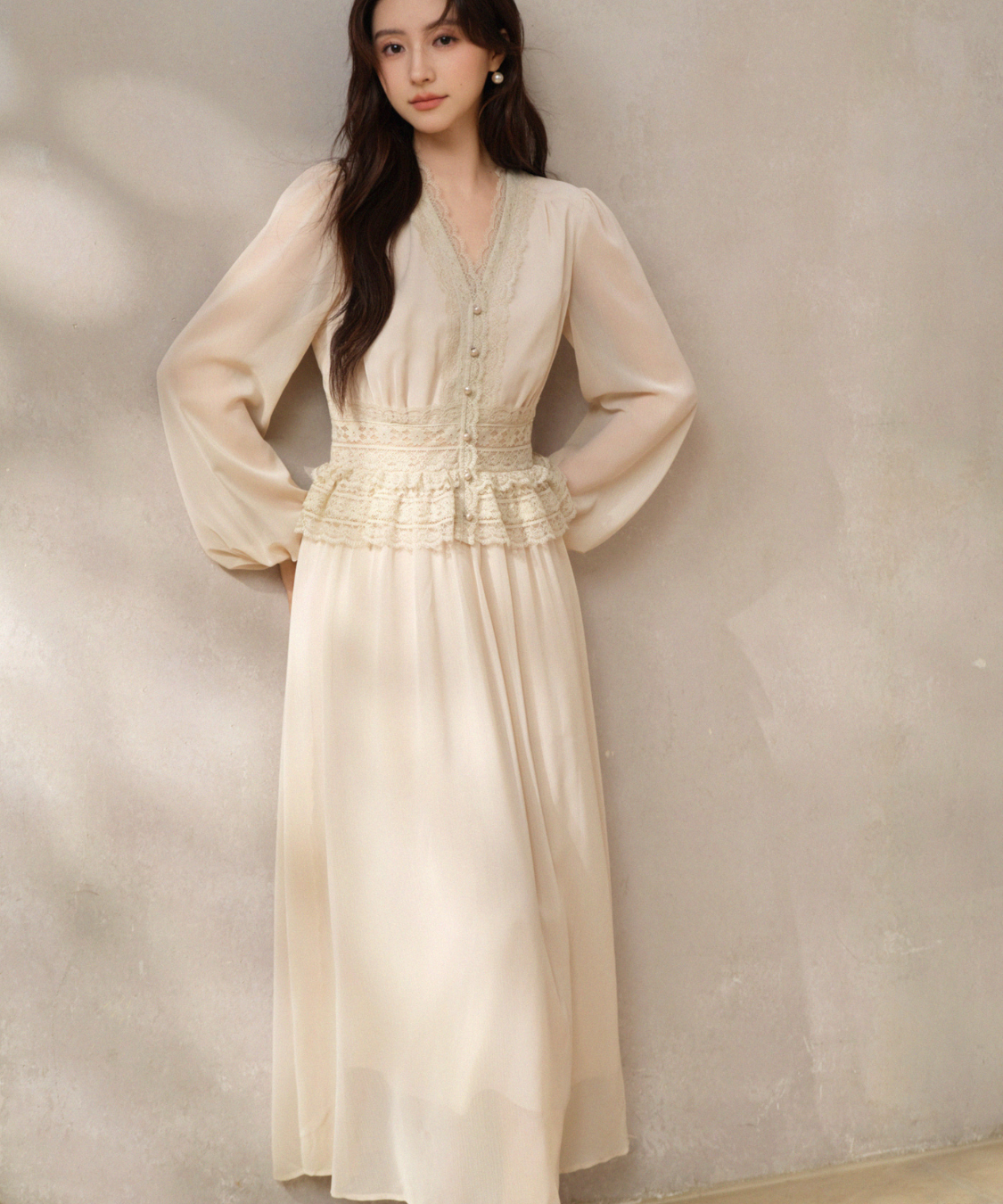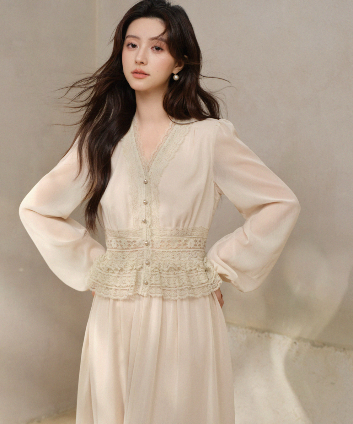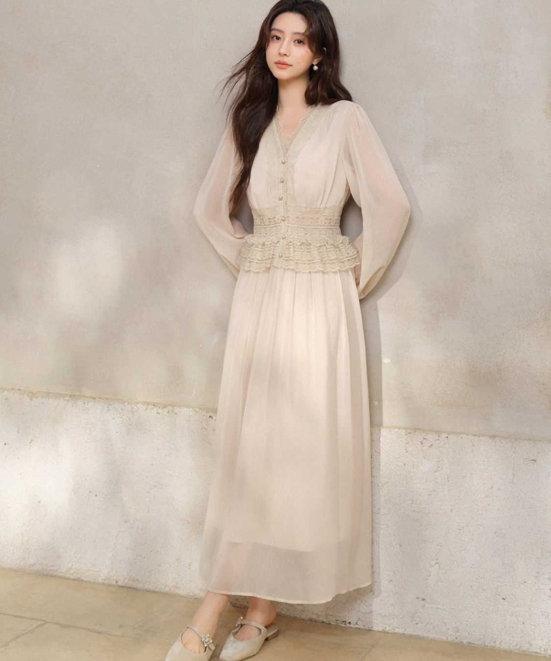 デコルテを美しく見せるVネックに、繊細なレースを施した上品なワンピースです。
