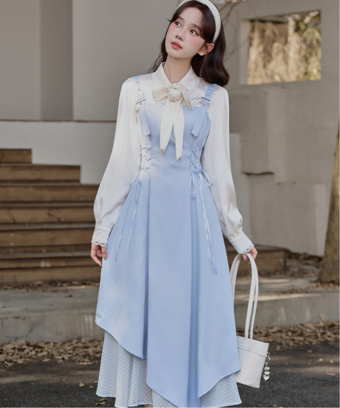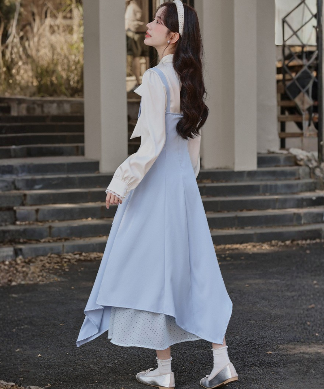アシンメトリーなヘムラインが印象的なレイヤード風ジャンパースカートです。